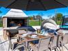 For endnu mere afslapning står en stilfuldt indrettet indendørs del til rådighed, som begejstrer med harmoniske farvekombinationer og et varmt sildebensparketgulv. Tilbered jeres måltider i køkkenet, som opfylder alle ønsker og gør madlavning til en fornøjelse. Nyd jeres måltider i det åbne spisestueområde, som har plads til alle gæster, eller brug spisebordet på terrassen til hyggelige aftener under åben himmel. Jeres børn vil elske legeområdet og pladsen til at boltre sig.