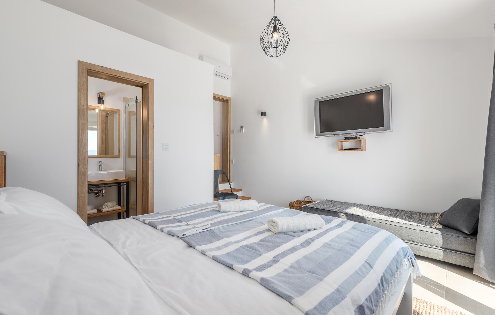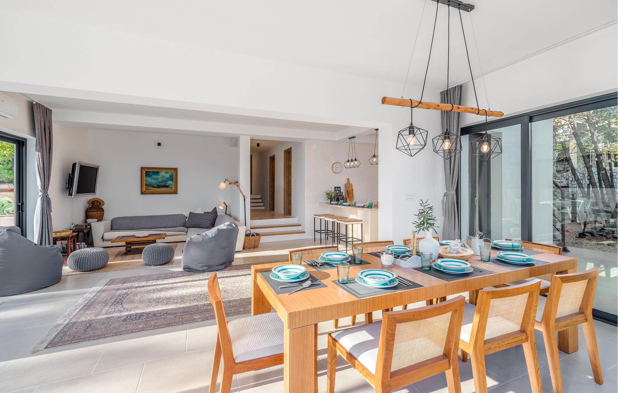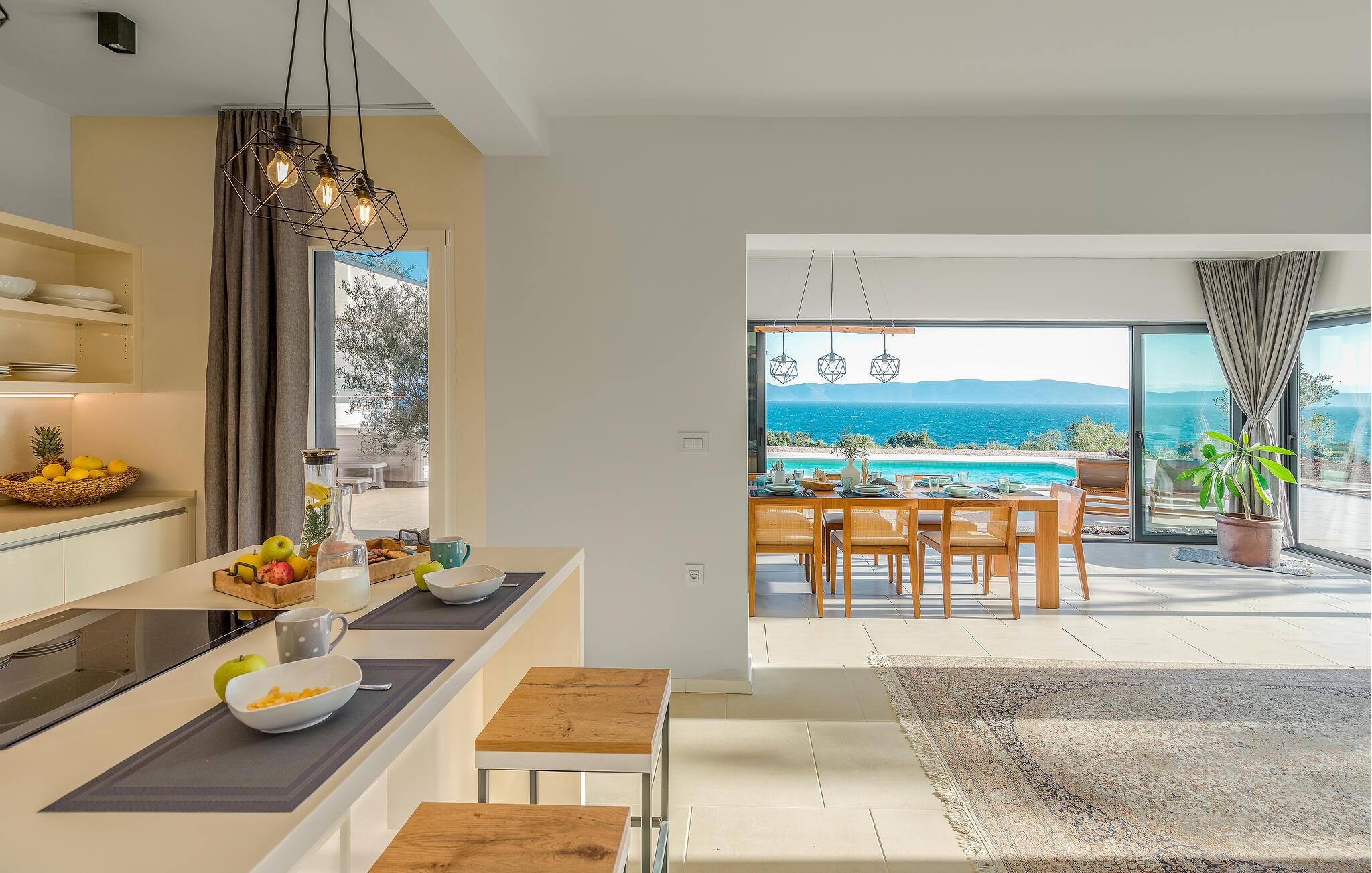Denne rummelige, moderne villa har et lyst og eksklusivt interiør og haren sensationel havudsigt gennem de store vinduer. Det smagfulde interiør tilbyder rigelig plads til fuldt ud at nyde de mange ekstrafunktioner, selv med en større familie eller en gruppe venner. Glæd jer til hyggelige måltider, sjove aftener med madlavning og hyggelige timer i den indbydende stue.