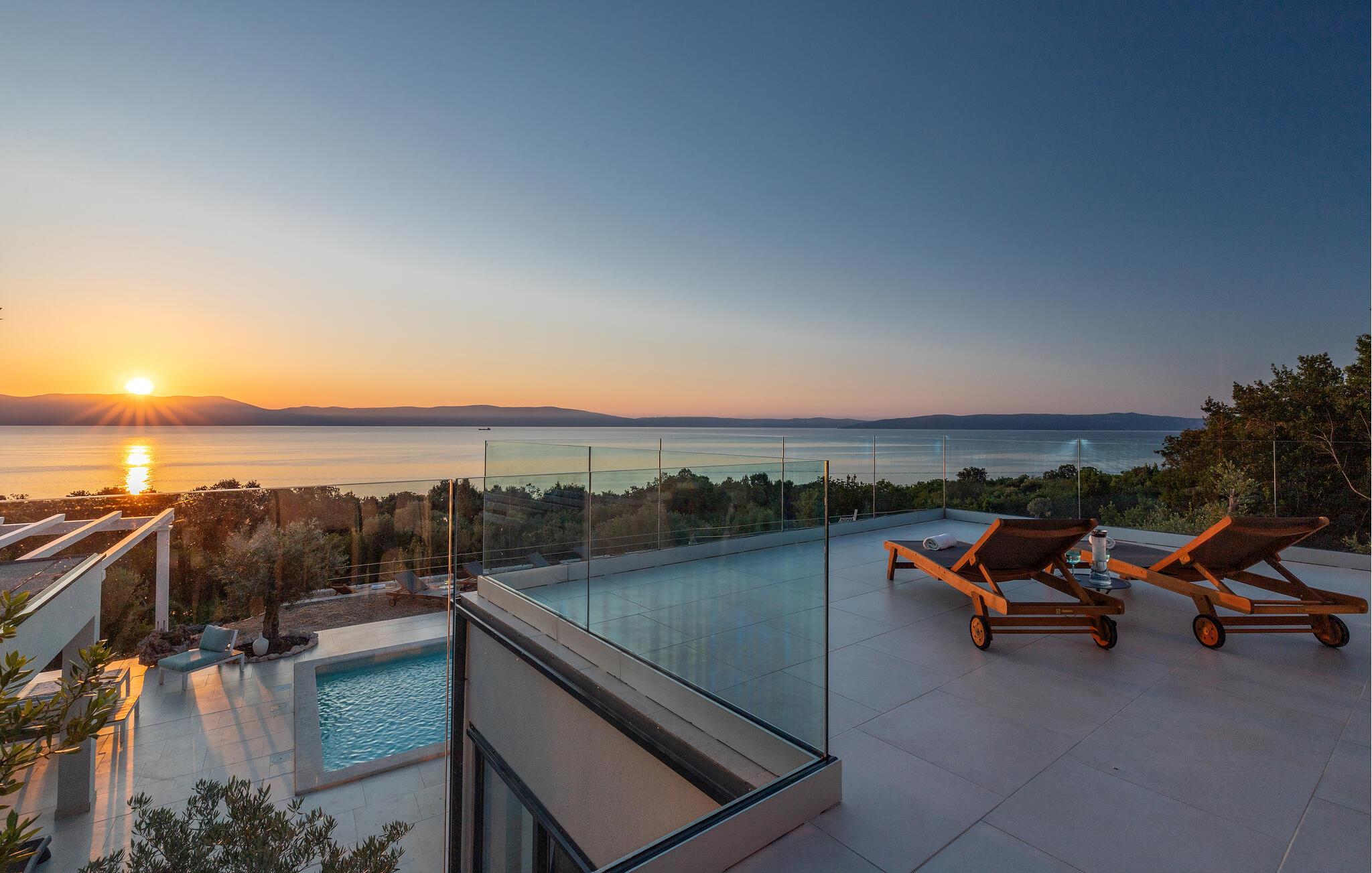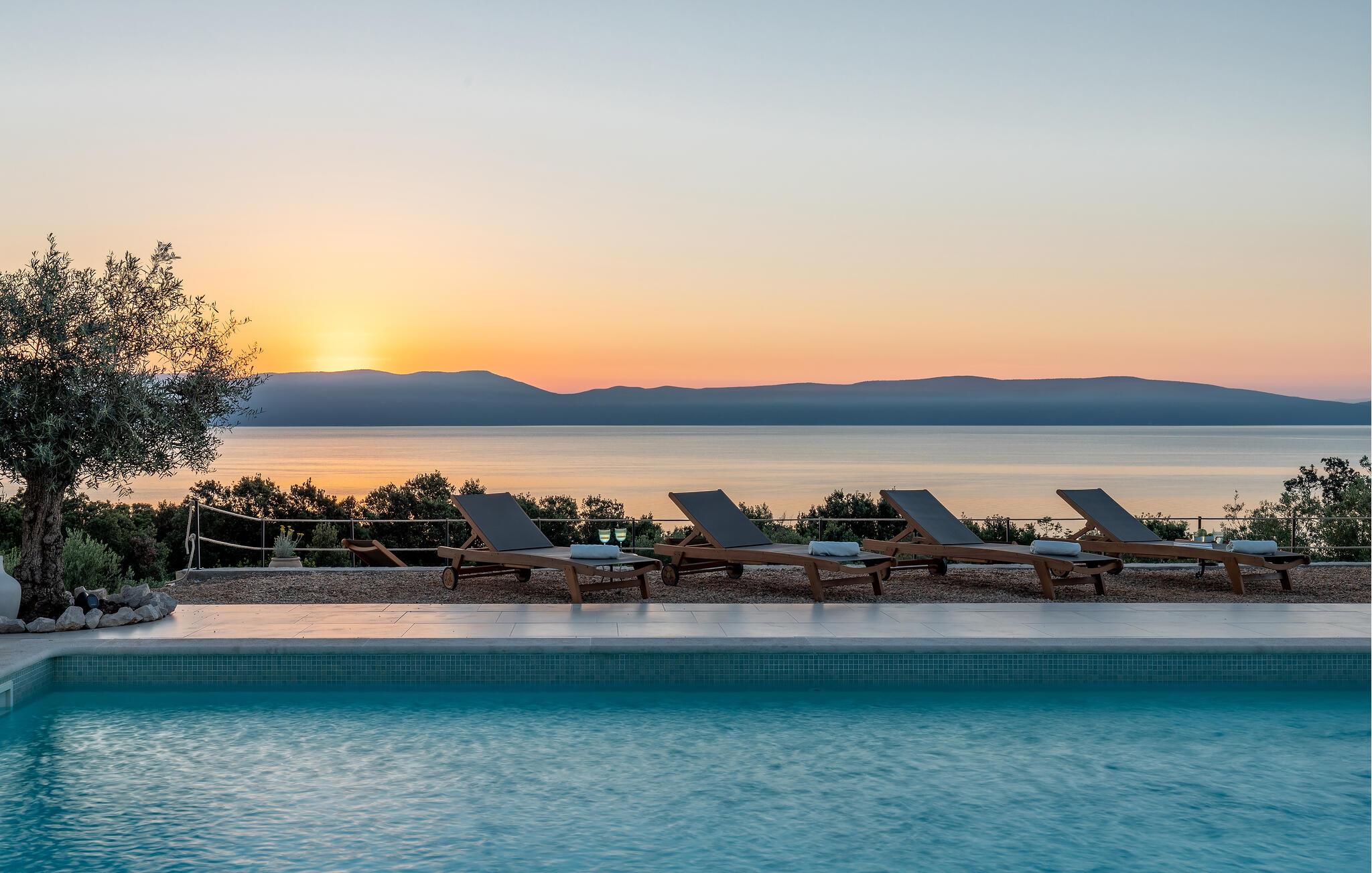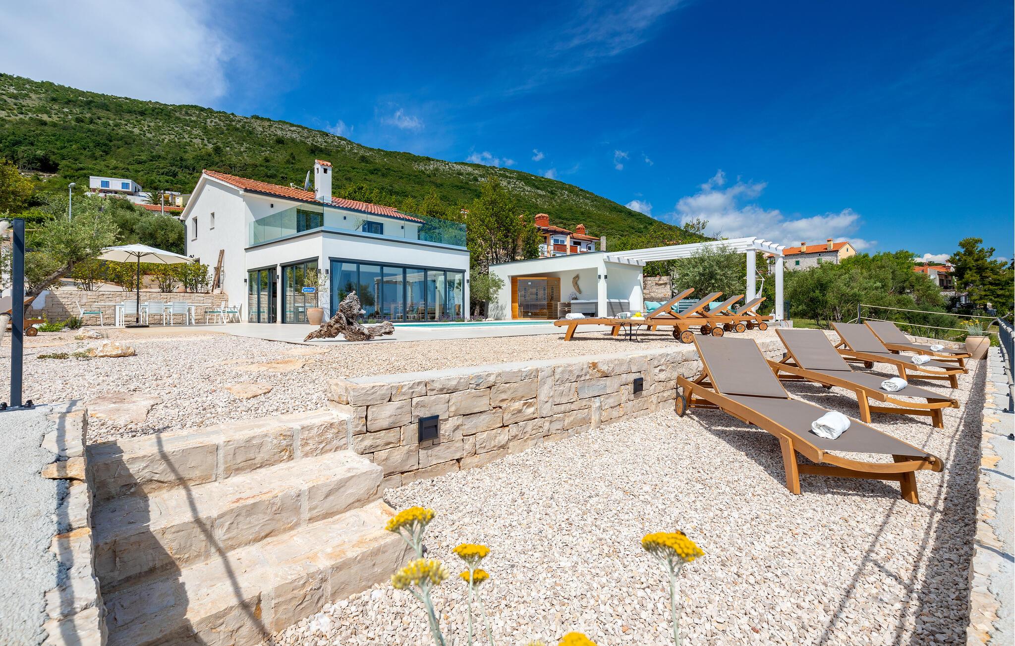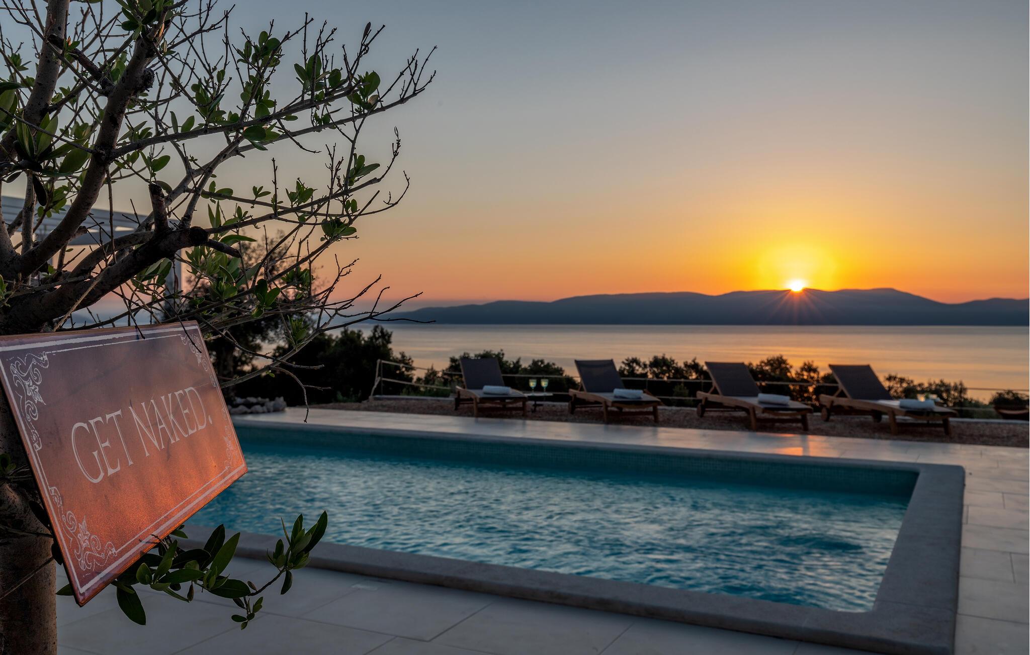 Træd barfodet udenfor og fordyb jer i jeres storslåede pool. Lad jer betage af den betagende udsigt over Adriaterhavet, mens I slapper af på en liggestol eller i spabadet og oplev uforglemmelige solnedgange med et glas vin. Forkæl jer selv med afslappende øjeblikke i saunaen og nyd kvalitetstid sammen med stemningsfulde aftener under åben himmel.