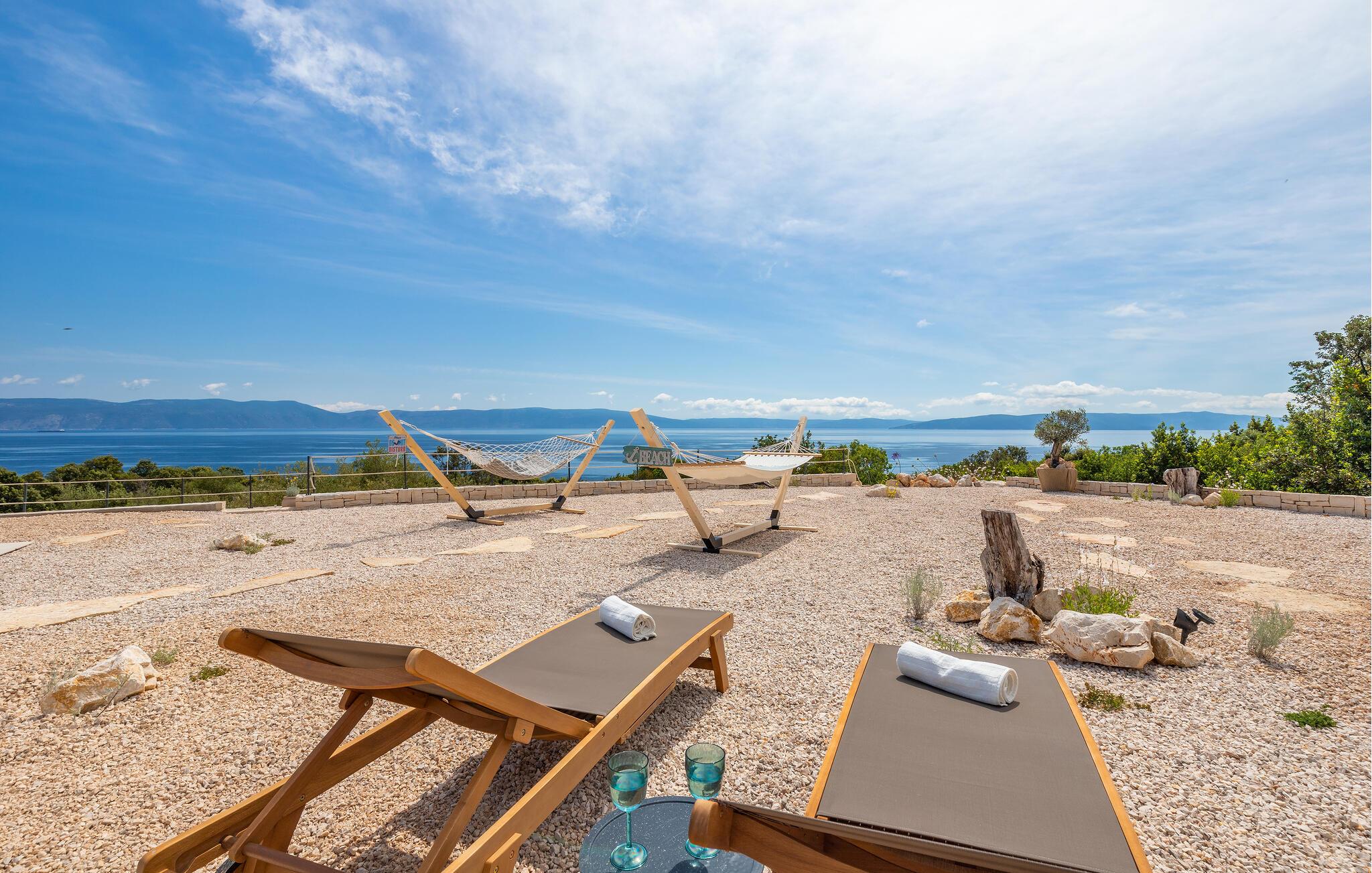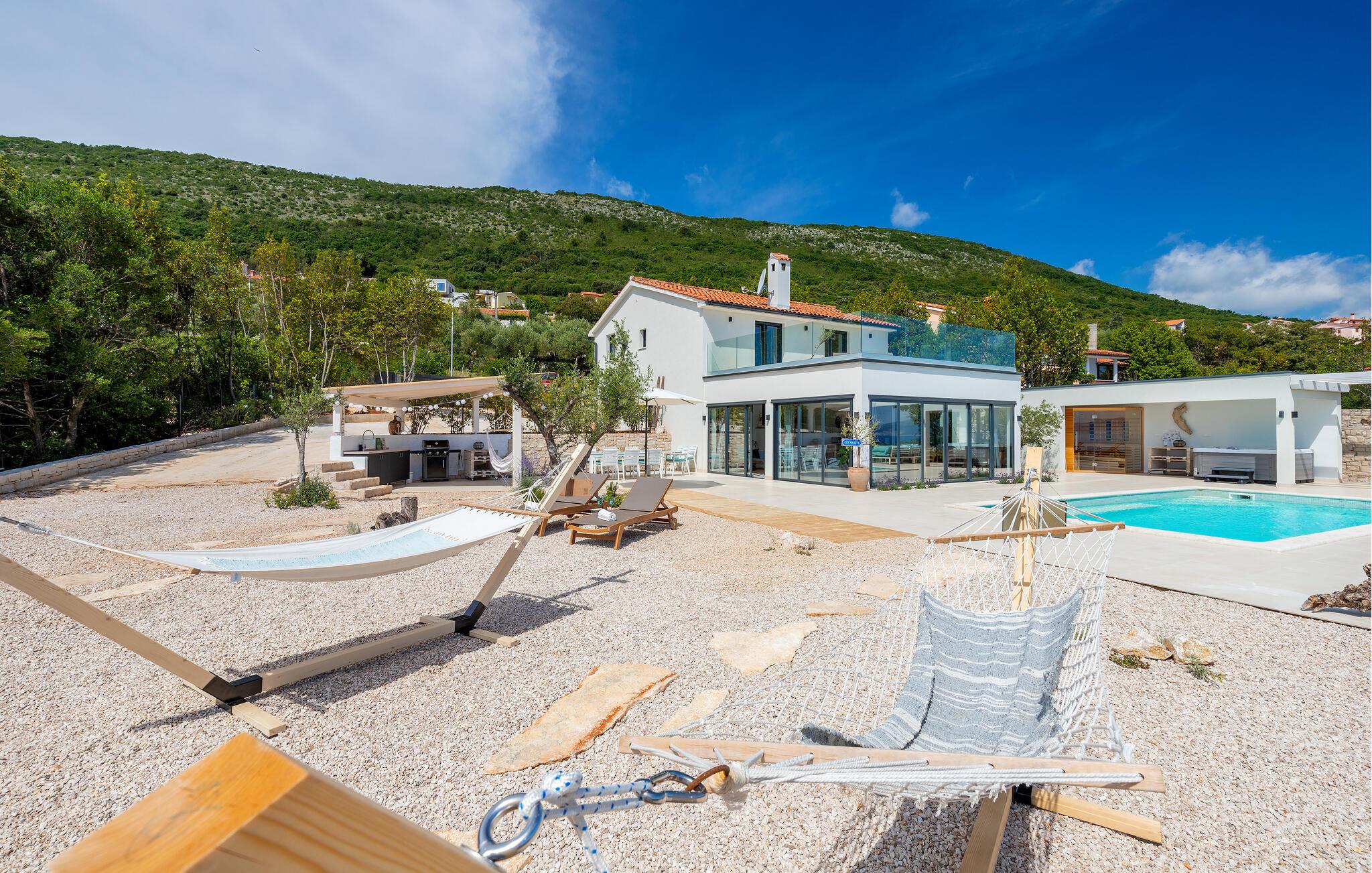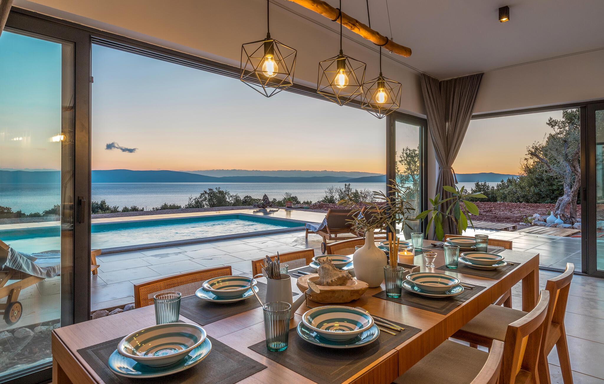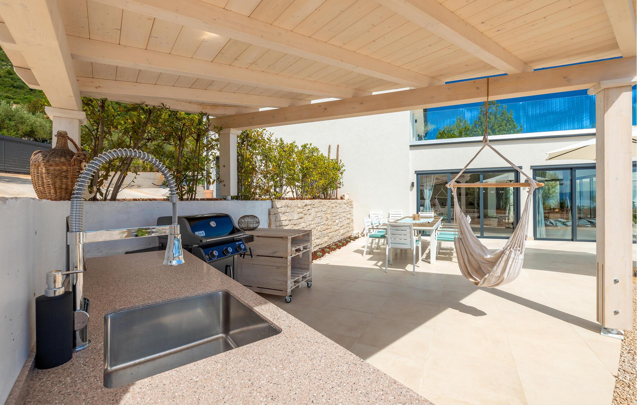 Træd barfodet udenfor og fordyb jer i jeres storslåede pool. Lad jer betage af den betagende udsigt over Adriaterhavet, mens I slapper af på en liggestol eller i spabadet og oplev uforglemmelige solnedgange med et glas vin. Forkæl jer selv med afslappende øjeblikke i saunaen og nyd kvalitetstid sammen med stemningsfulde aftener under åben himmel.