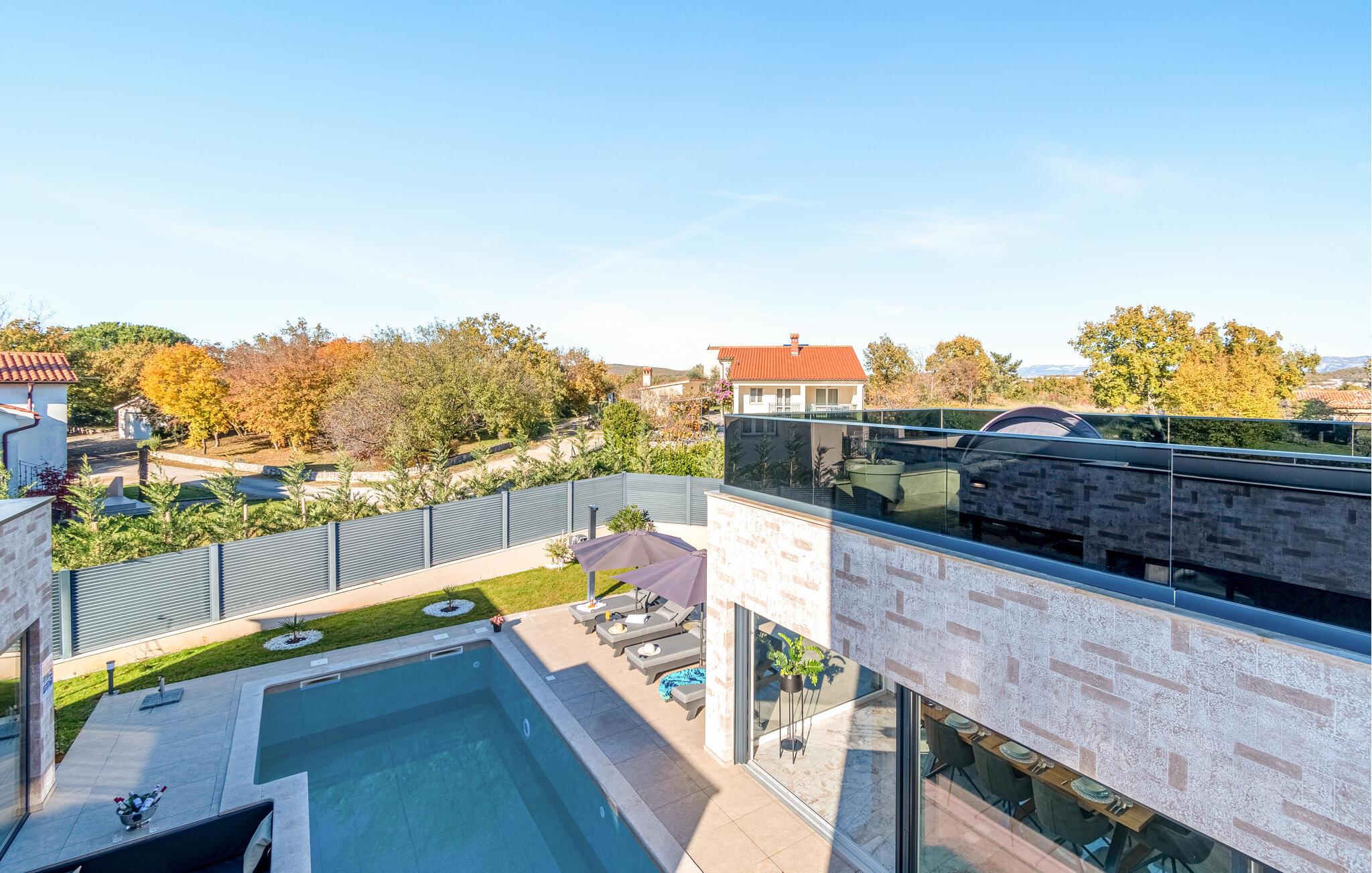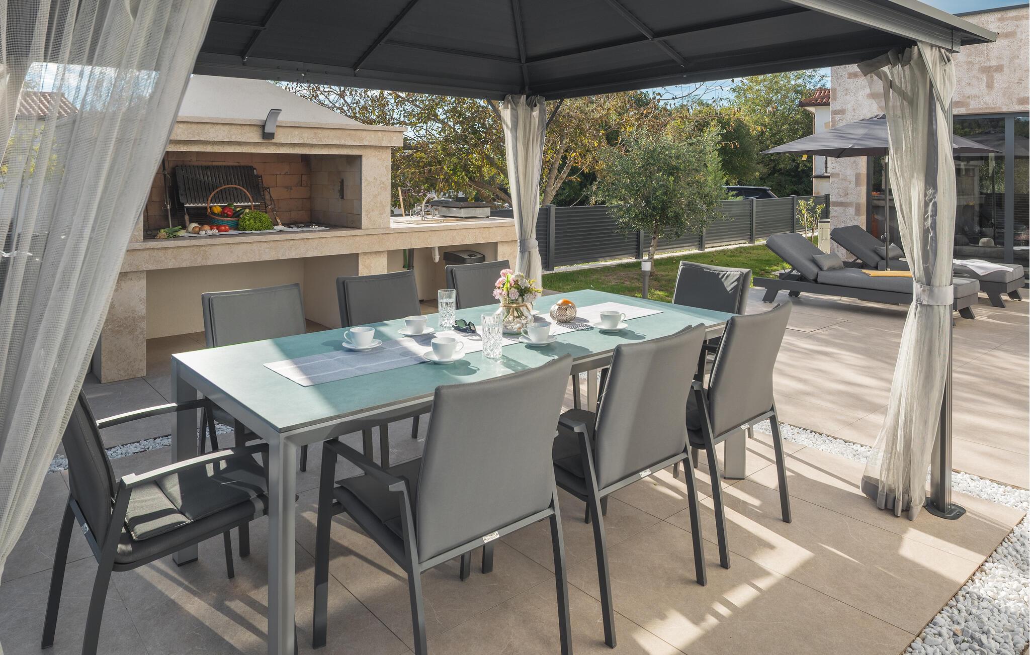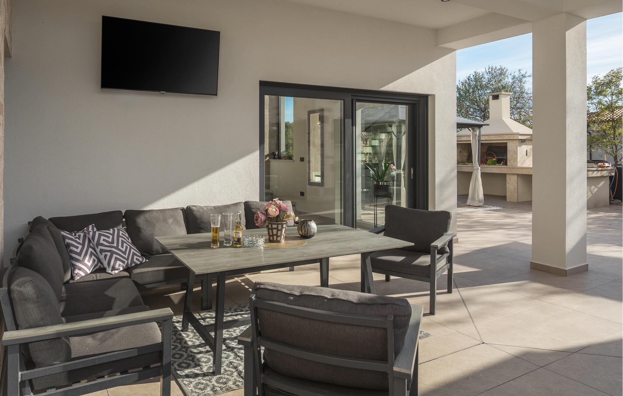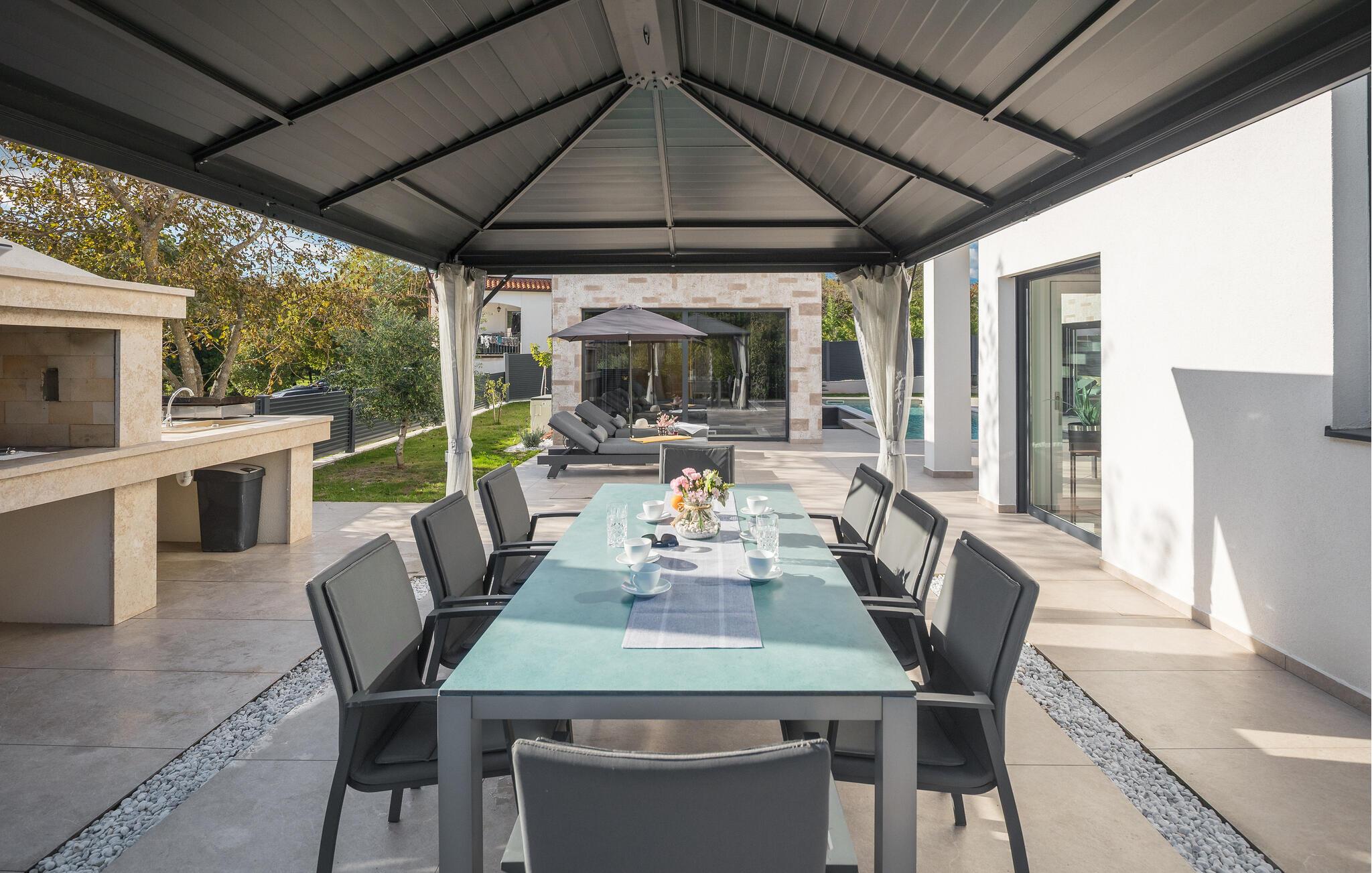 Træd udenfor og bliv overrasket over de mange faciliteter på det stilfulde udendørsområde. Dyk ned i den forfriskende pool eller slap af på liggestolene, nyd en solnedgang i det overdækkede loungeområde og organiser atmosfæriske grillaftener.