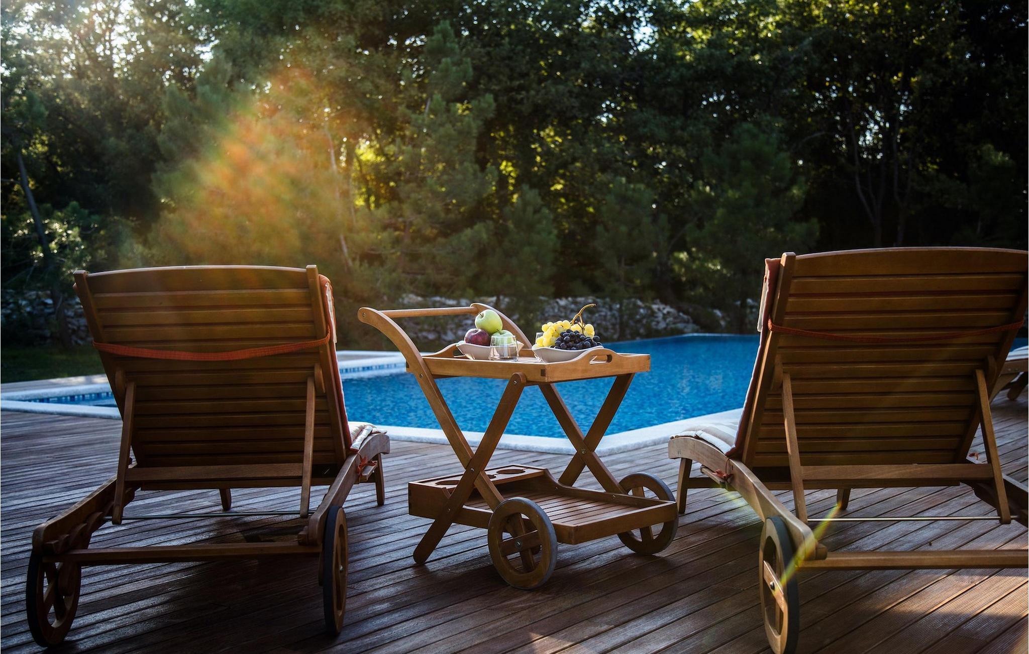 Der Pool der Villa schaut auf einen Wald, der die Villa von einer Seite umgibt und Gemütlichkeit und Komfort bietet. Ein Essbereich im Freien mit Grill ist ebenso vorhanden wie auch zwei umschlossene Parkplätze.