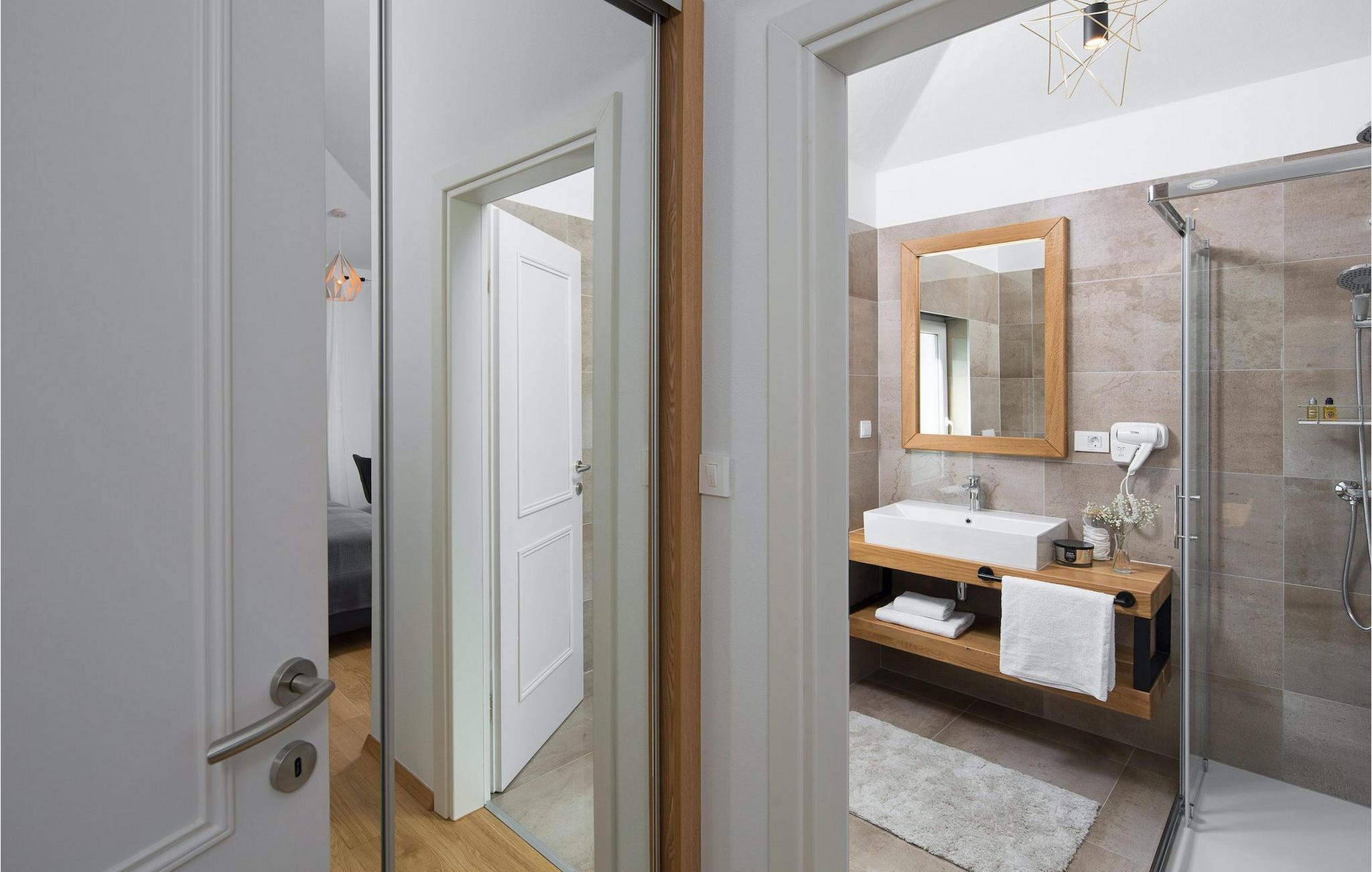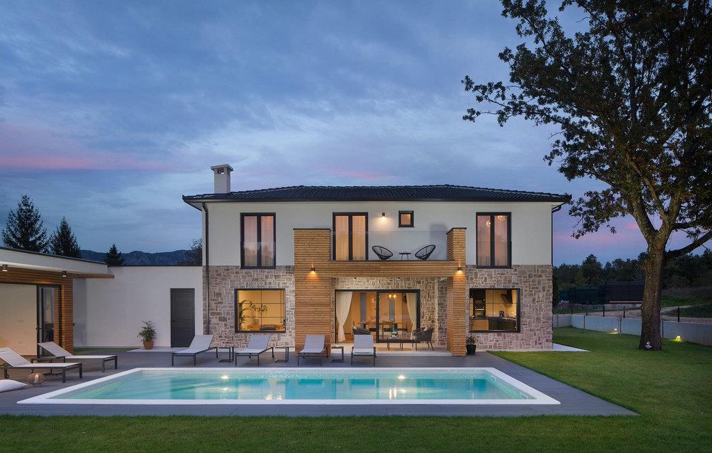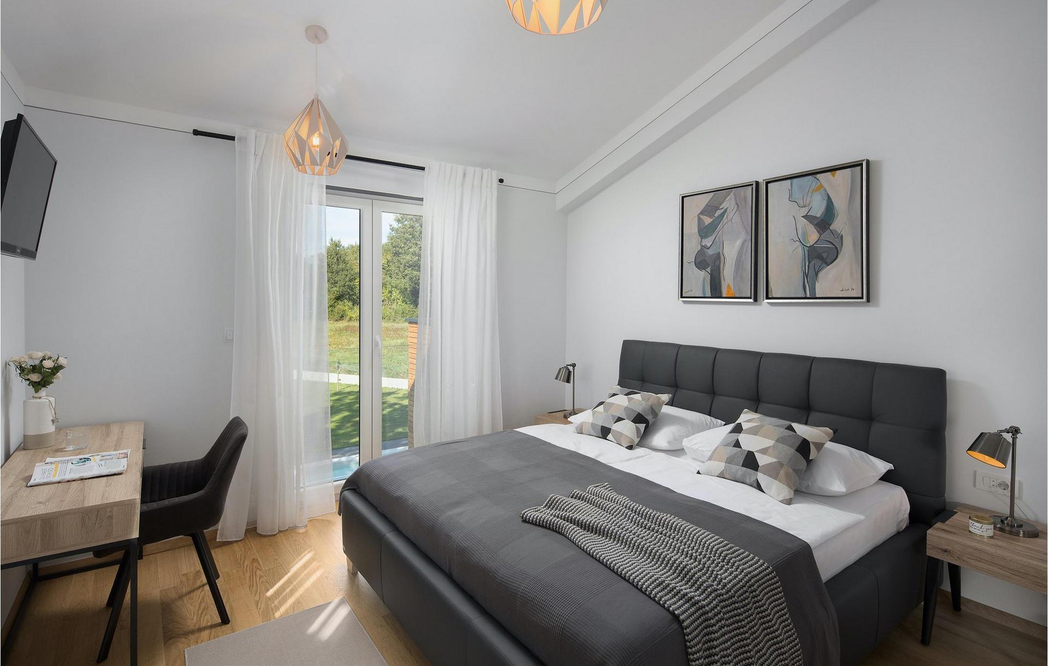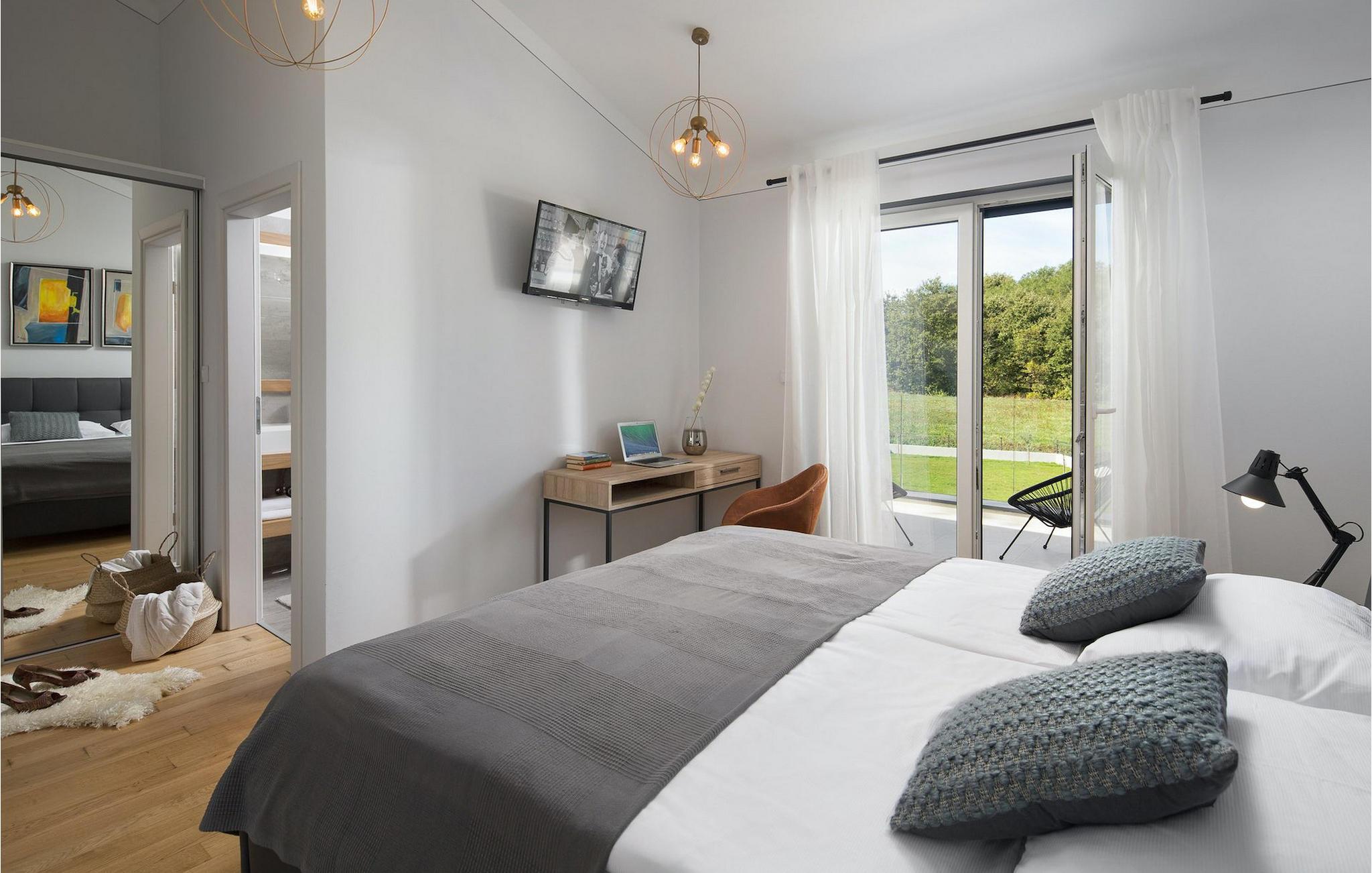 Drømmer du om en afslappet ferie i en skøn, moderne villa med privat pool i Istrien? Villa Analucija II venter på dig! I stueetagen finder du fællesrummene, hvor I kan samles og tilbringe en masse tid sammen, mens de 3 soveværelser ligger på første sal, og de tilbyder overnatning for op til 6 gæster. Når du træder ind i villaen, kommer du til det rummelige, meget stilfulde værelse, som forbinder stue og spisestue med det fuldt udstyrede køkken i et åbent koncept. Herfra kan du nyde udsigten over den indbydende pool og lige udenfor finder du en overdækket veranda med havemøbler, ideel til morgenmad. Det adskilte objekt ved siden af villaen er det smukke, veludstyrede sommerkøkken med underholdningsrummet. Slap af ved poolen eller tilbered grillretter til venner og familie. På første sal finder du komfortable soveværelser i lyse farvetoner, med moderne malerier på væggene, som vækker rummet endnu mere. Hvert soveværelse råder over et tv, aircondition og eget badeværelse. Det ene soveværelse har udgang til den store altan. Den første strand ligger kun 7 km væk, men den opvarmede pool byder også på en god forfriskning, mens du også kan hvile dig på en af de mange liggestole eller bare solbade.Villa Analucija II ligger i landsbyen Krsan, midt i byen. smukt bakket landskab og uberørt natur, ideel til vandre- eller cykelture. Udforsk baglandet og prøv Istriens specialiteter som trøfler, prosciutto eller tag bare et godt glas istrisk Malvazija på en tur på en af vinruterne. I dette område er der små, men charmerende byer som Labin og Rabac. Den gamle bydel i Labin ligger på den østlige side af halvøen Istrien. Det er et sted rigt på atelier og det ideelle sted at nyde kunst på hvert trin gennem byen. Rabac, en tidligere fiskerby, er stedet, hvor du kan finde gode strande og restauranter. I området Labin-Rabac kan du spille tennis, minigolf, beachvolley, dykke og nyde forskellige vandsportsaktiviteter. Den nærmeste strand ligger kun 7 km væk (Plomin) fra villaen.