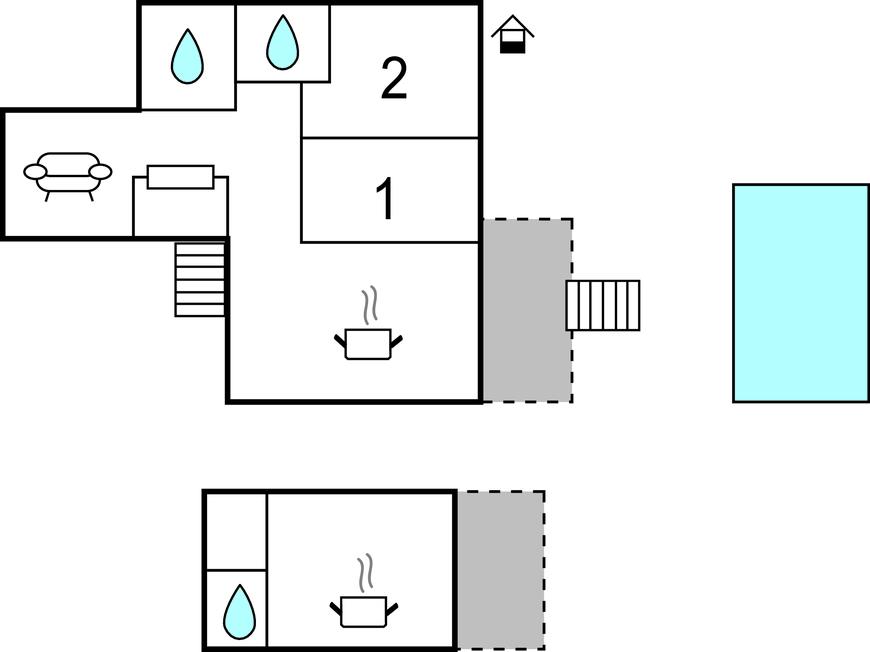 Huset består af en høj stueetage med egen indgang, som er adskilt fra det tilstødende hus via en mur. Interiøret består af et spisekøkken, to soveværelser og et badeværelse. På den indbydende, bageste del af haven er poolen og grillen, hvor I kan tilberede fisk- og kødretter udendørs. De yngste familiemedlemmer får det sjovt på den store grund med frugttræer.