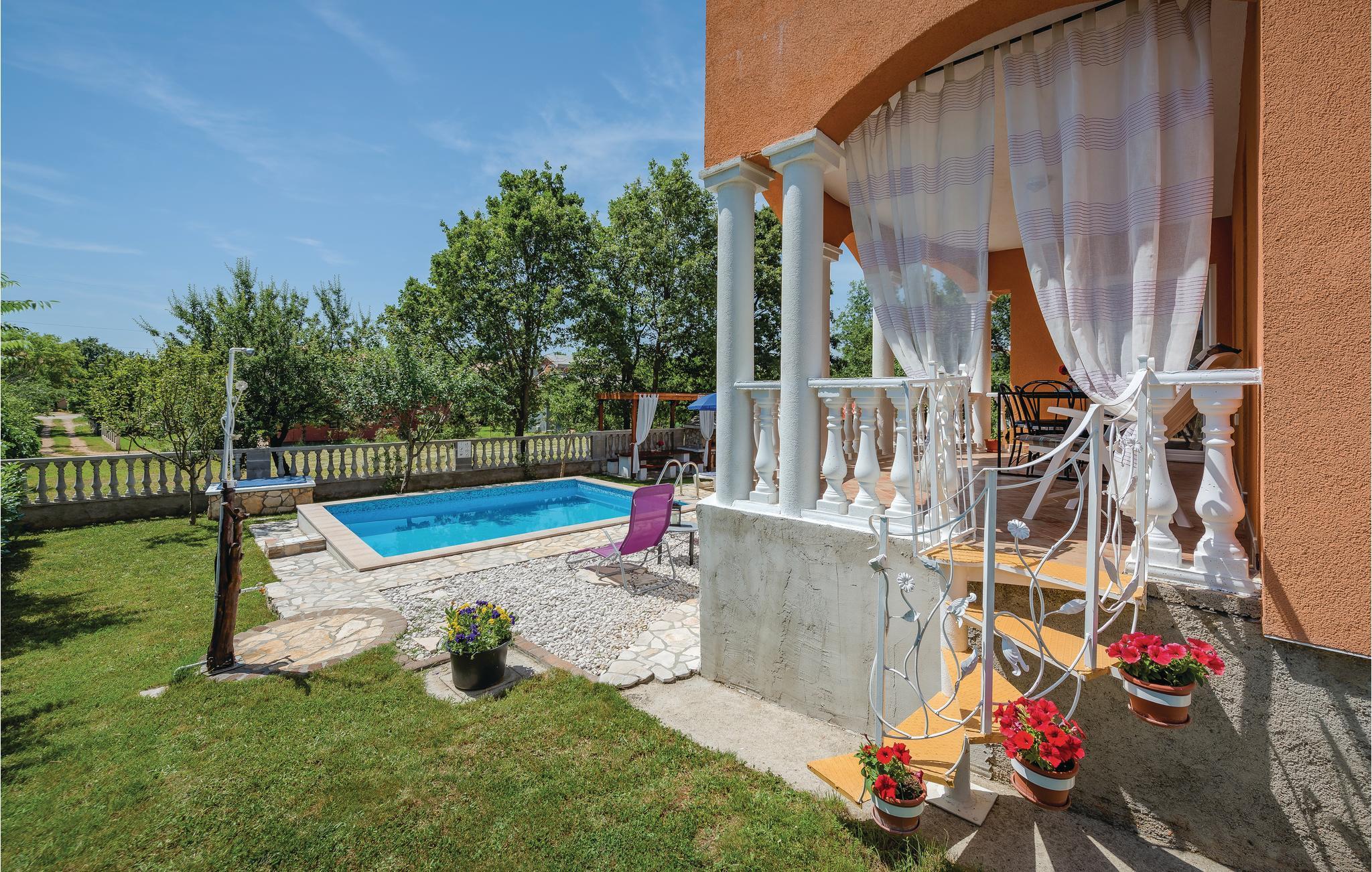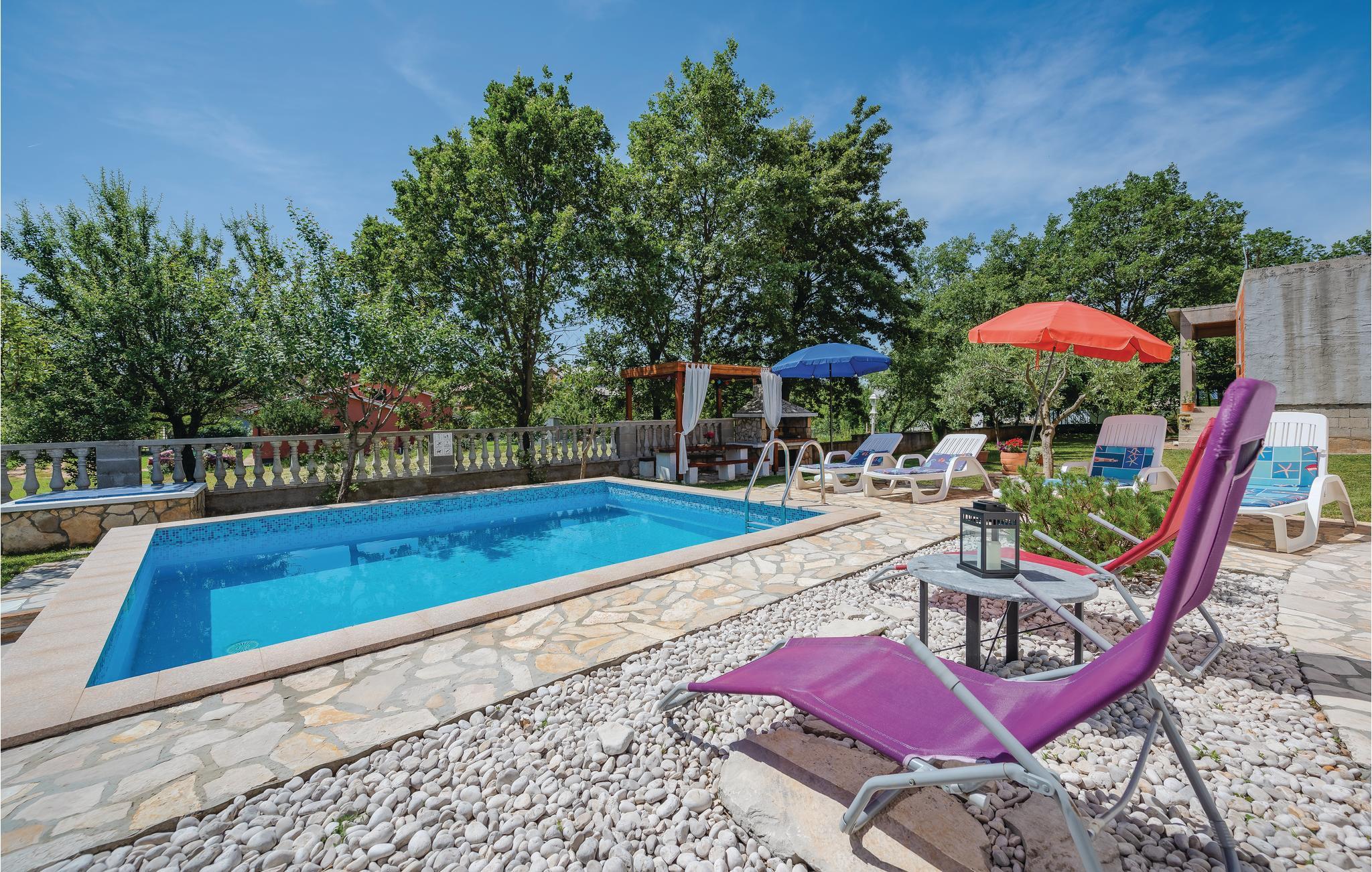 Dette skønne feriehus med pool, ligger blot en femten minutters køretur i bil, fra de skønneste badestrande i Istrien. De ligger i badebyen Rabac. Huset er oplagt til ferie for to familier, da det rummer to lejligheder, der hver har egen privat indgang. Ferielejligheden i stueplan har udgang til en stor overdækket terrasse med udsigt over haven og poolen, samt et køkken, spise- og opholdsstue med kamin. Tilbered lækker feriemad på den udendørs grill og slap af i haven i den friske luft. Besøg den gamle bydel i Labin, som er en rigtig kunstnerby. Oplev også Pula med det gamle romerske amfiteater og nationalparken Brijuniøerne.