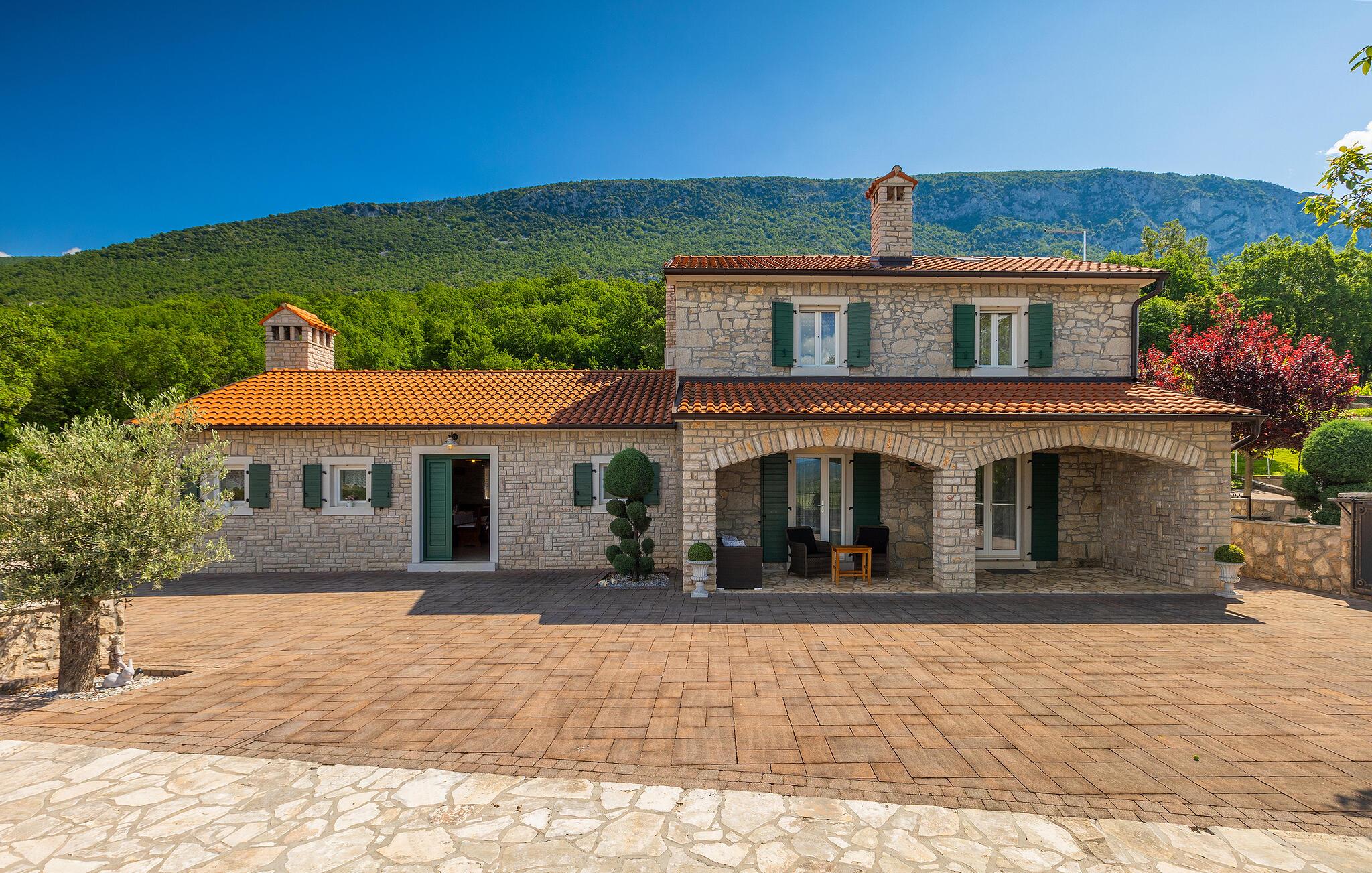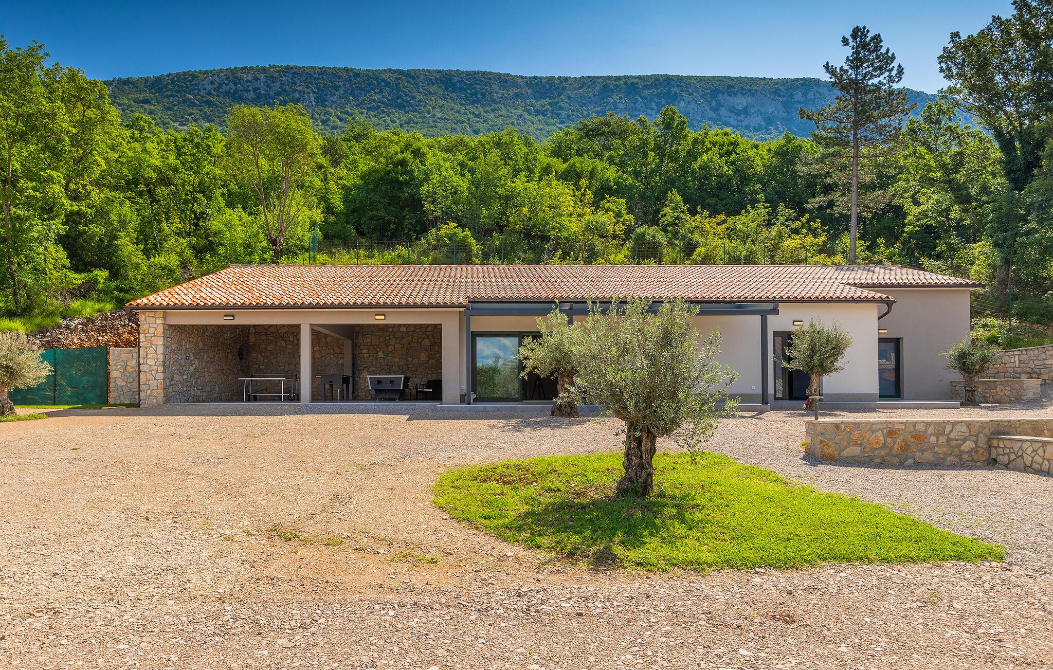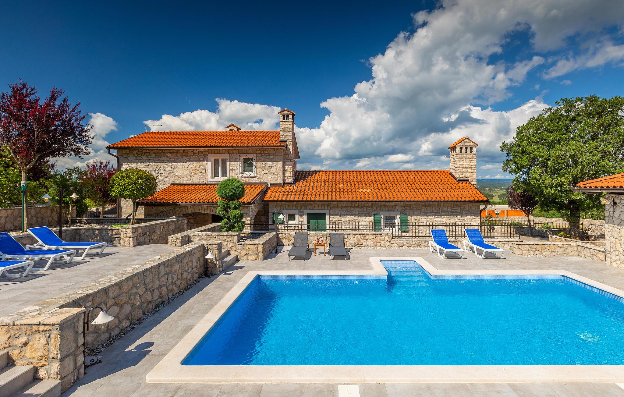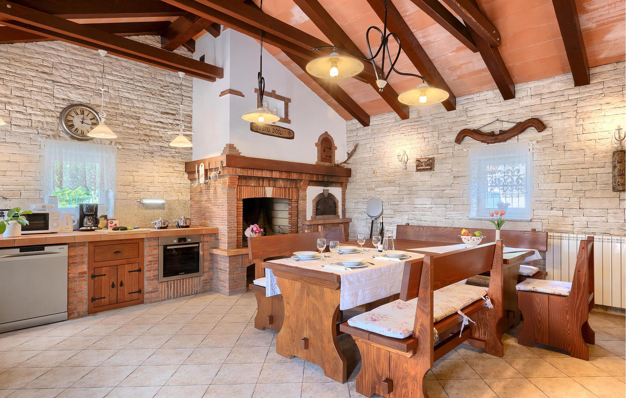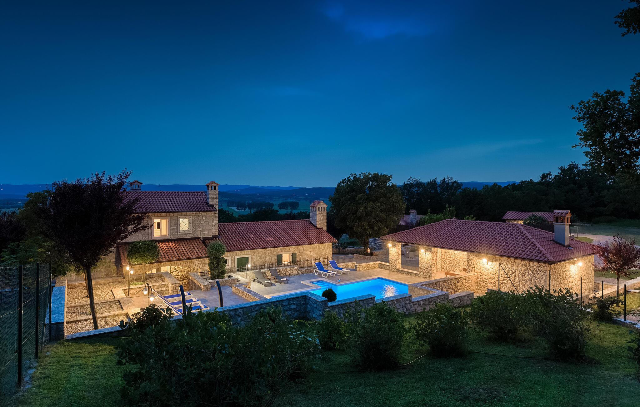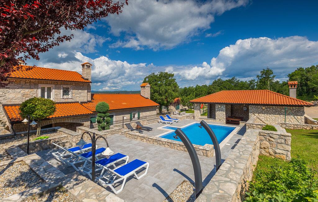 Villa Skavre er et magisk sted, hvor glæde, afslapning og lykke er garanteret. Det ligger på bakkerne nær Kvarner-kysten med en fantastisk udsigt over det omkringliggende landskab. Ejerne har en lille hjortefarm i nærheden af villaen, hvilket vil være en vidunderlig oplevelse for enhver gæst, der tilbringer deres tid der, da man kan svømme i poolen og nyde udsigten til dyrene, der frit løber rundt. En ægte stressaflastning for enhver naturelsker! Villaen har 3 soveværelser, hver med dobbeltsenge, 3 badeværelser og en elegant og moderne opholdsstue med 3 fuldt udstyret køkkener og en hyggelig stue. Her finder I en ekstra soveplads - en komfortabel sovesofa, passende til 2 gæster. Og hvis en del af jeres gruppe har brug for lidt hvile, mens den anden ønsker at tilbringe en lang nat med at nyde kroatiske specialiteter, har ejeren endda sørget for denne lille detalje. Lige ved siden af hovedhuset ligger et mindre hus bestående af et underholdningsrum med pizzaovn og et toilet.