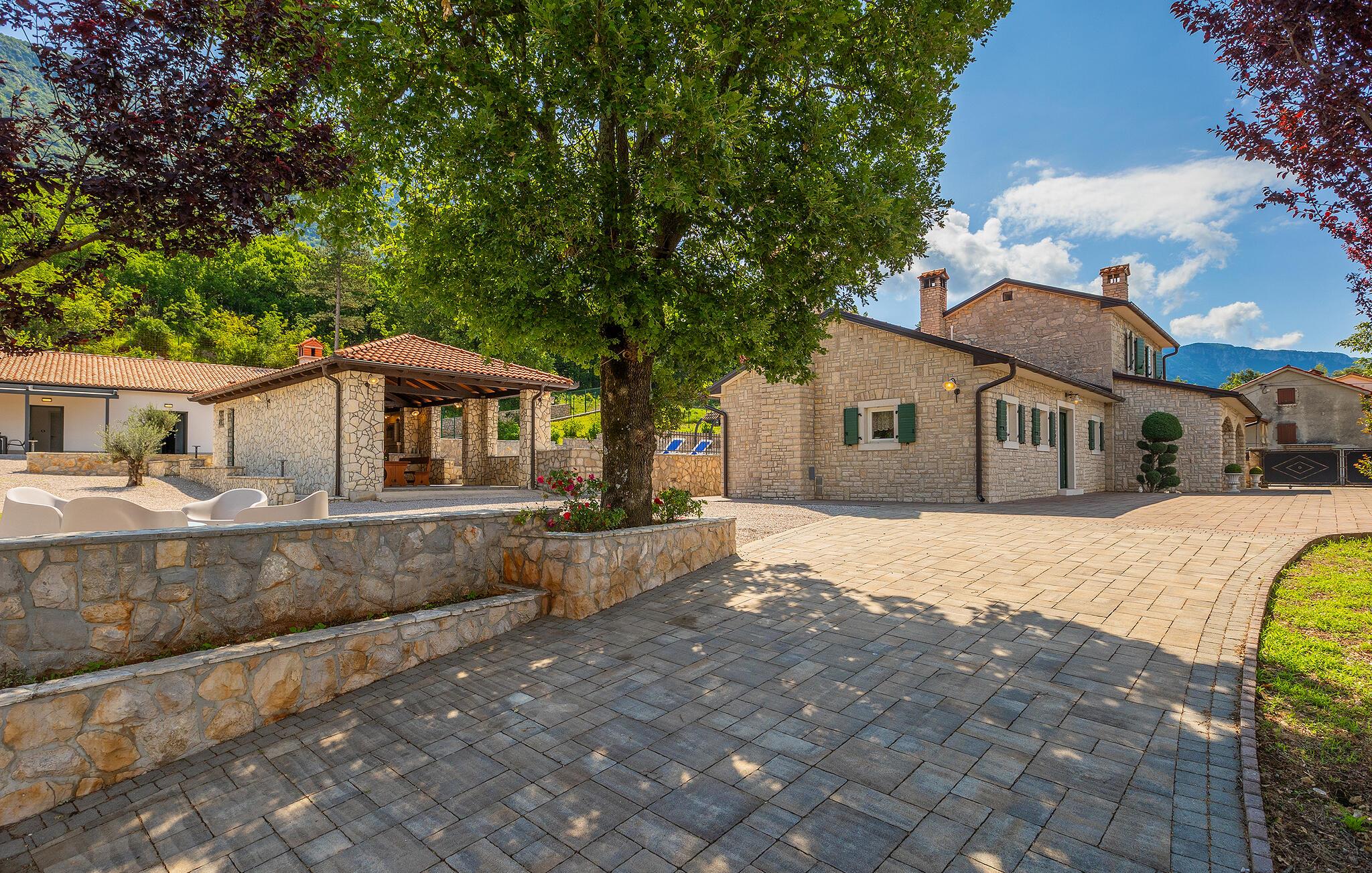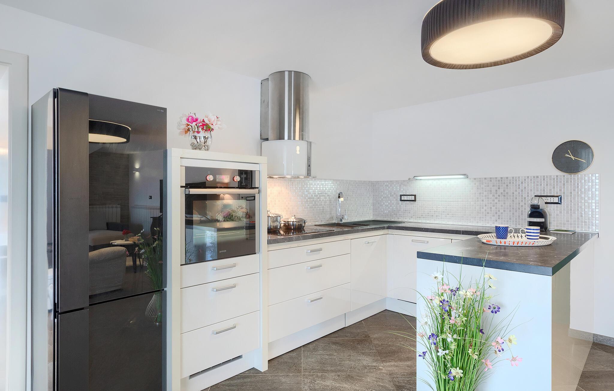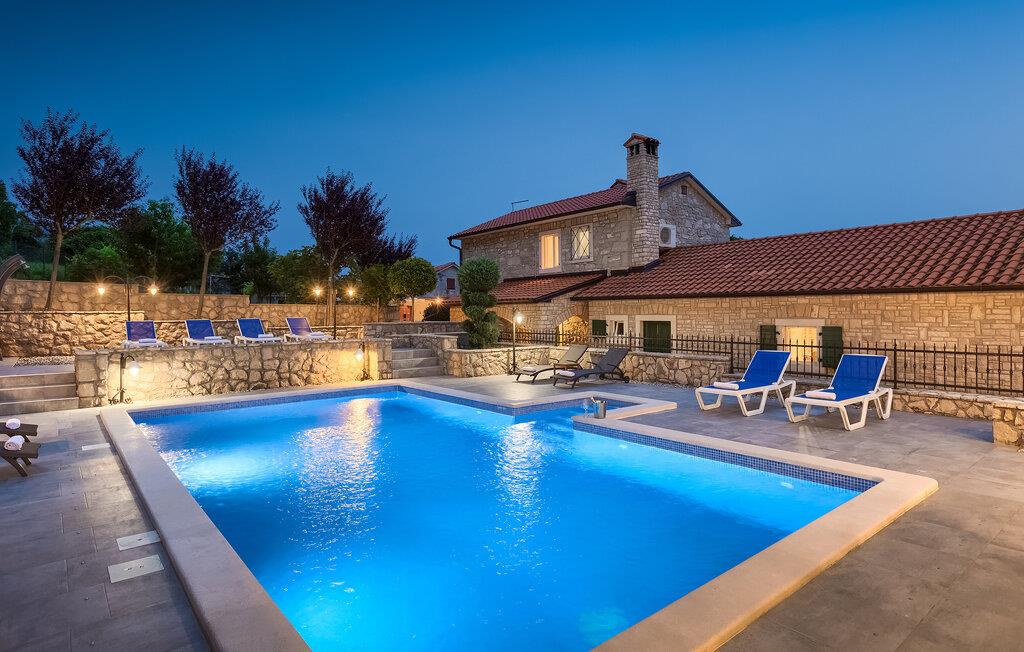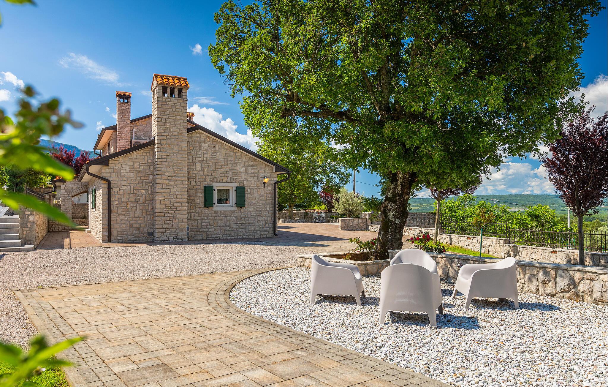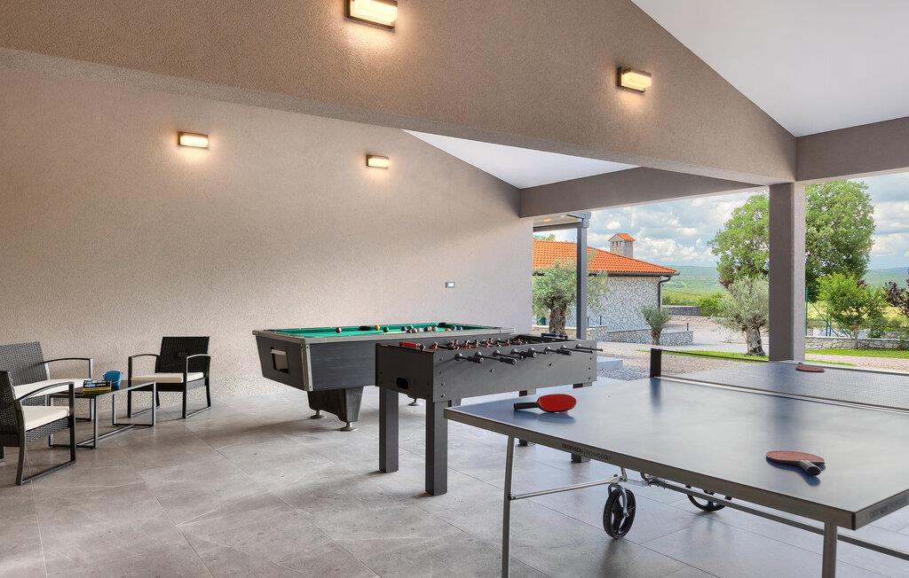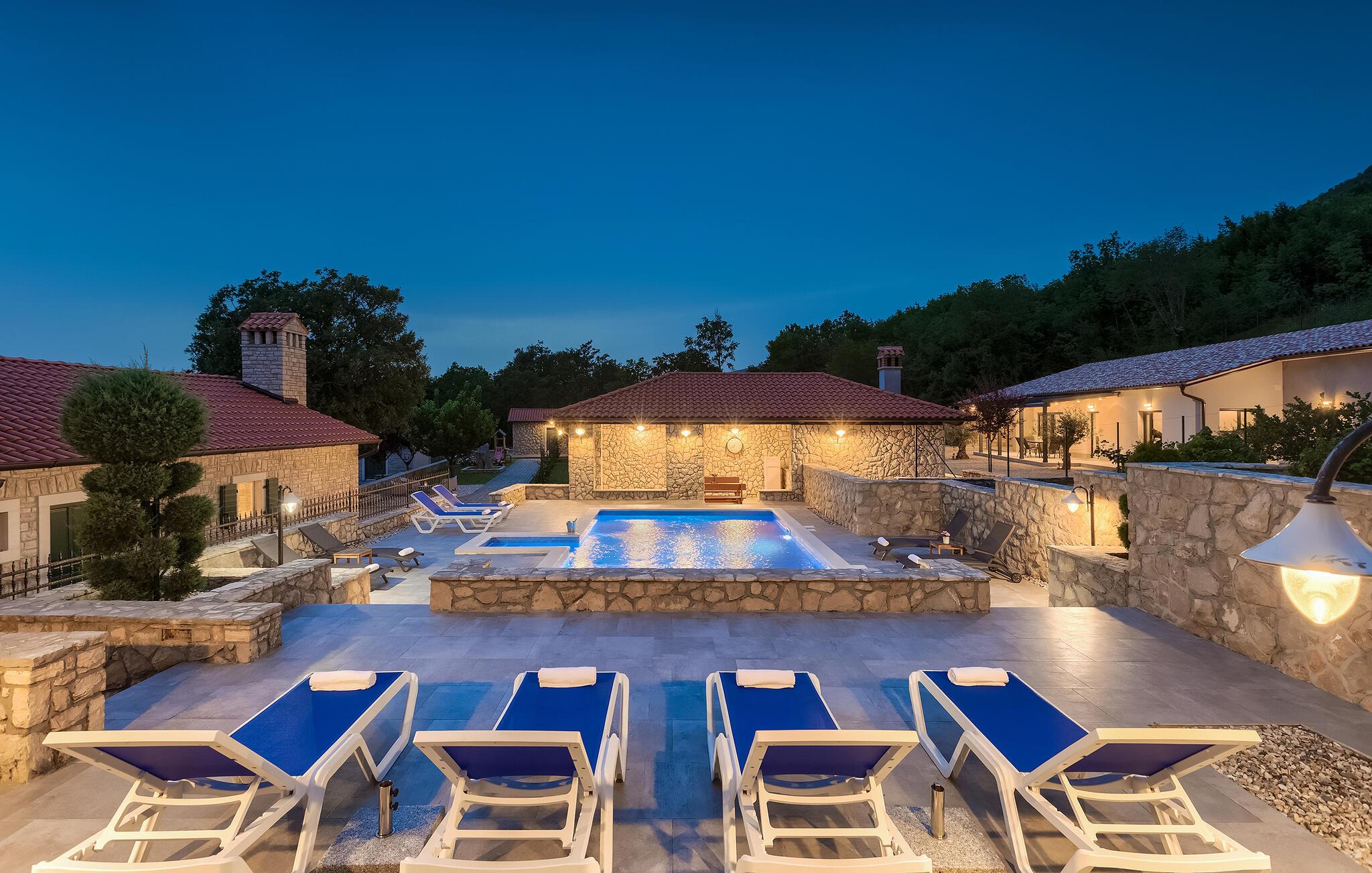 Villa Skavre er et magisk sted, hvor glæde, afslapning og lykke er garanteret. Det ligger på bakkerne nær Kvarner-kysten med en fantastisk udsigt over det omkringliggende landskab. Ejerne har en lille hjortefarm i nærheden af villaen, hvilket vil være en vidunderlig oplevelse for enhver gæst, der tilbringer deres tid der, da man kan svømme i poolen og nyde udsigten til dyrene, der frit løber rundt. En ægte stressaflastning for enhver naturelsker! Villaen har 3 soveværelser, hver med dobbeltsenge, 3 badeværelser og en elegant og moderne opholdsstue med 3 fuldt udstyret køkkener og en hyggelig stue. Her finder I en ekstra soveplads - en komfortabel sovesofa, passende til 2 gæster. Og hvis en del af jeres gruppe har brug for lidt hvile, mens den anden ønsker at tilbringe en lang nat med at nyde kroatiske specialiteter, har ejeren endda sørget for denne lille detalje. Lige ved siden af hovedhuset ligger et mindre hus bestående af et underholdningsrum med pizzaovn og et toilet.