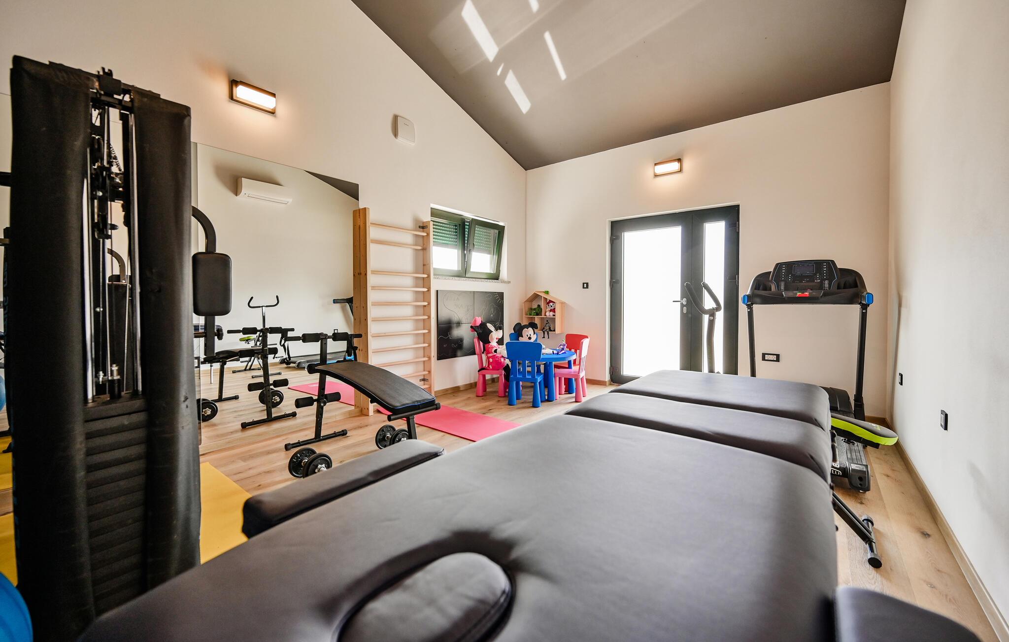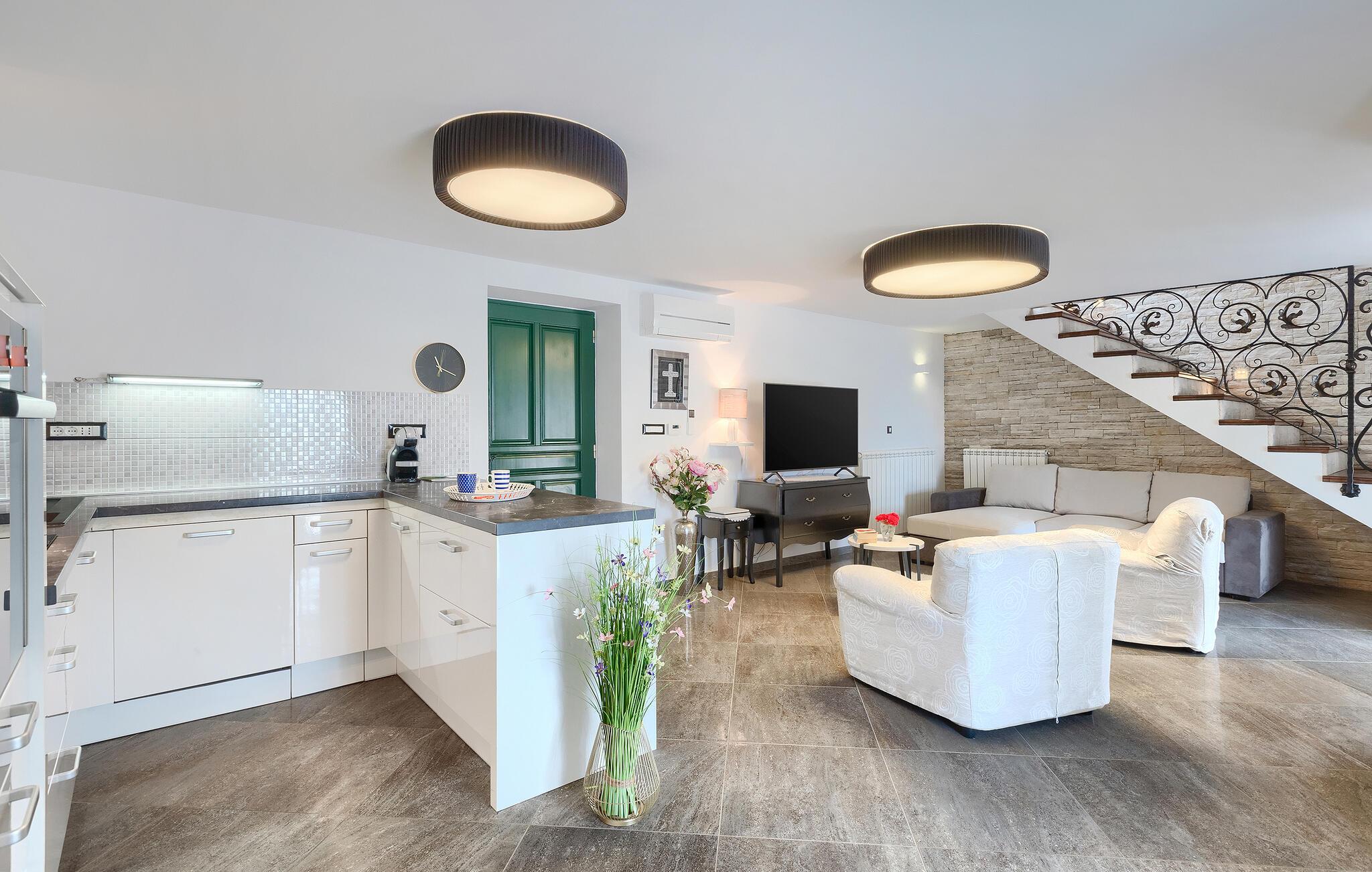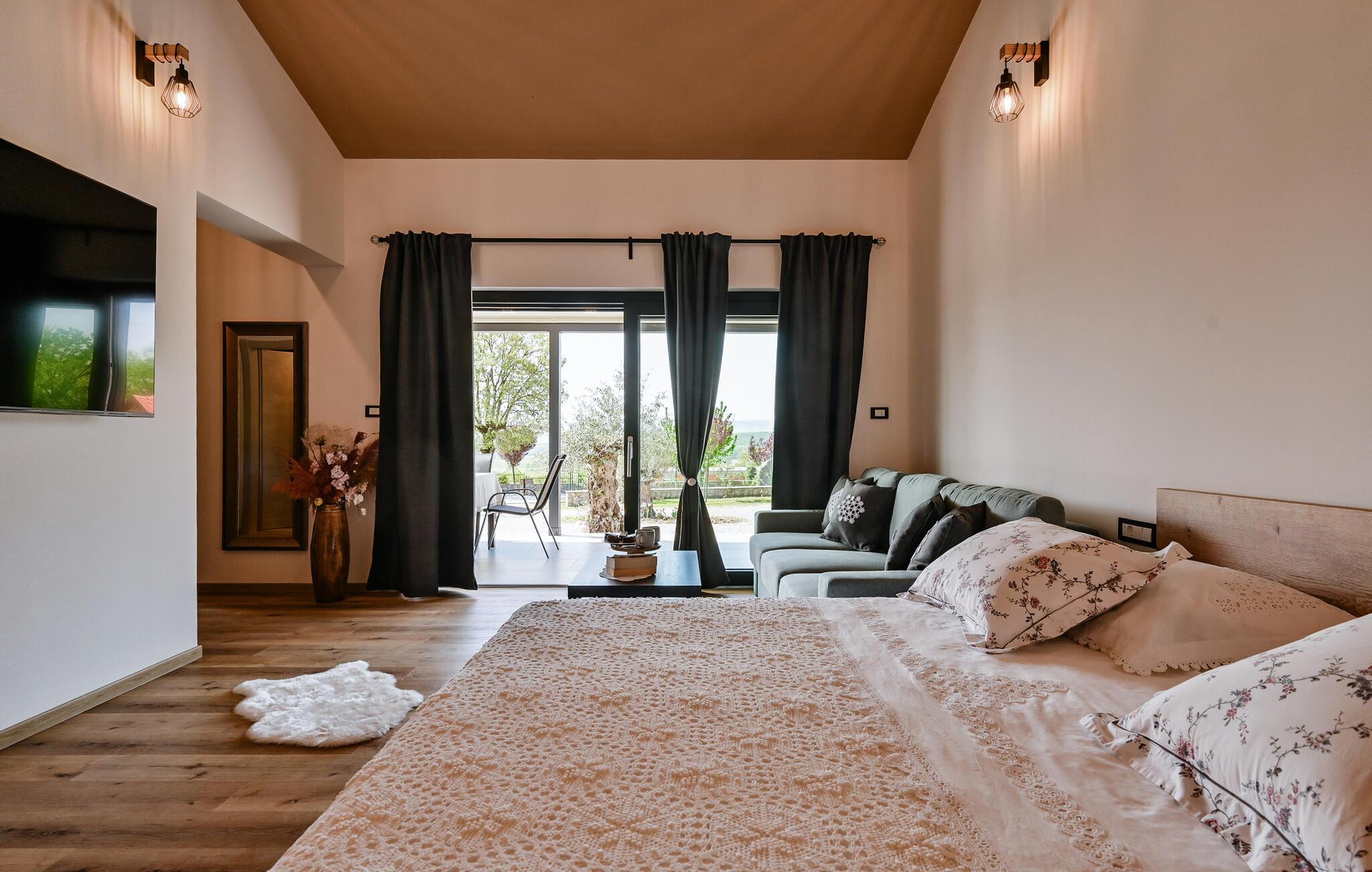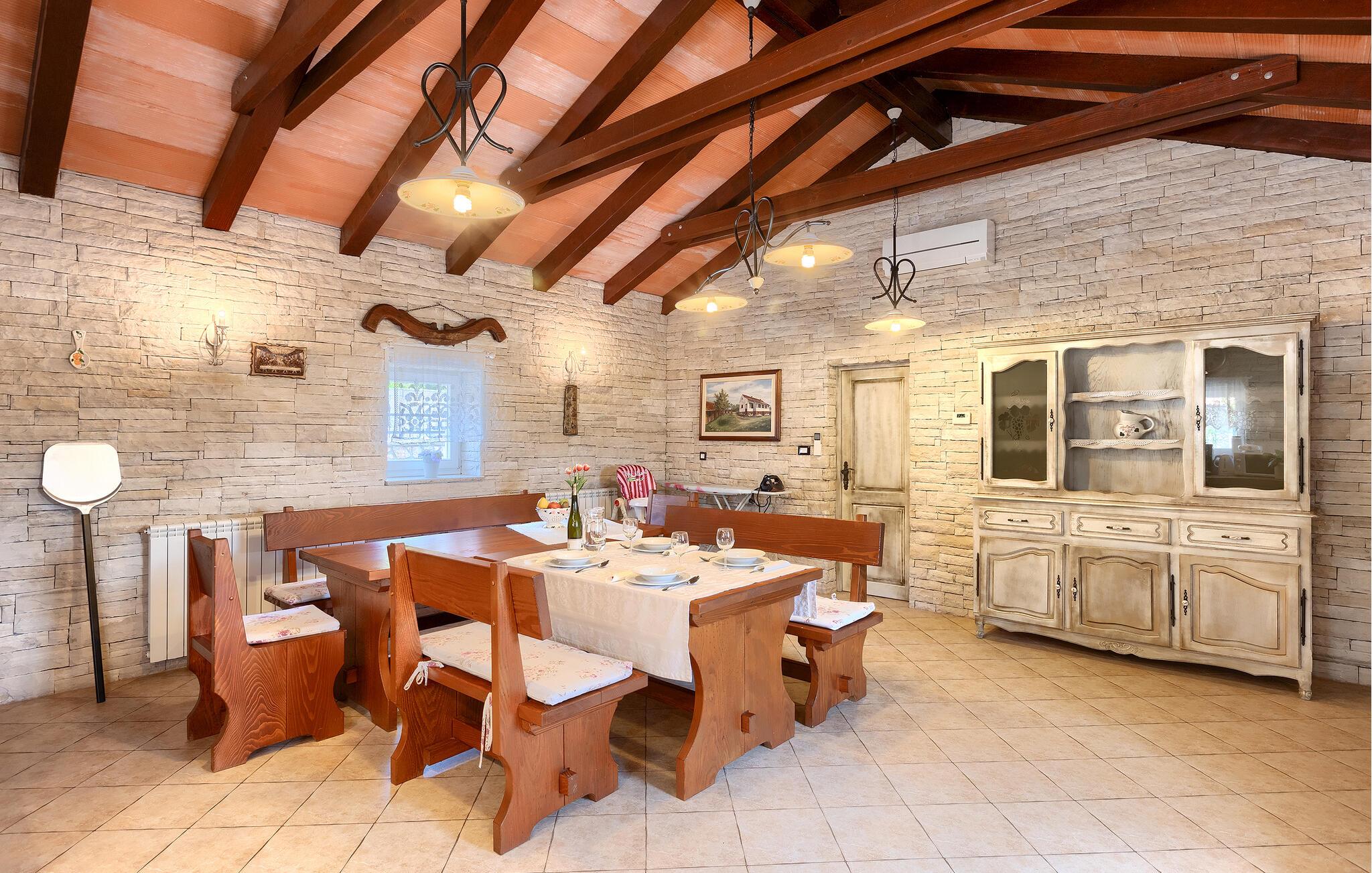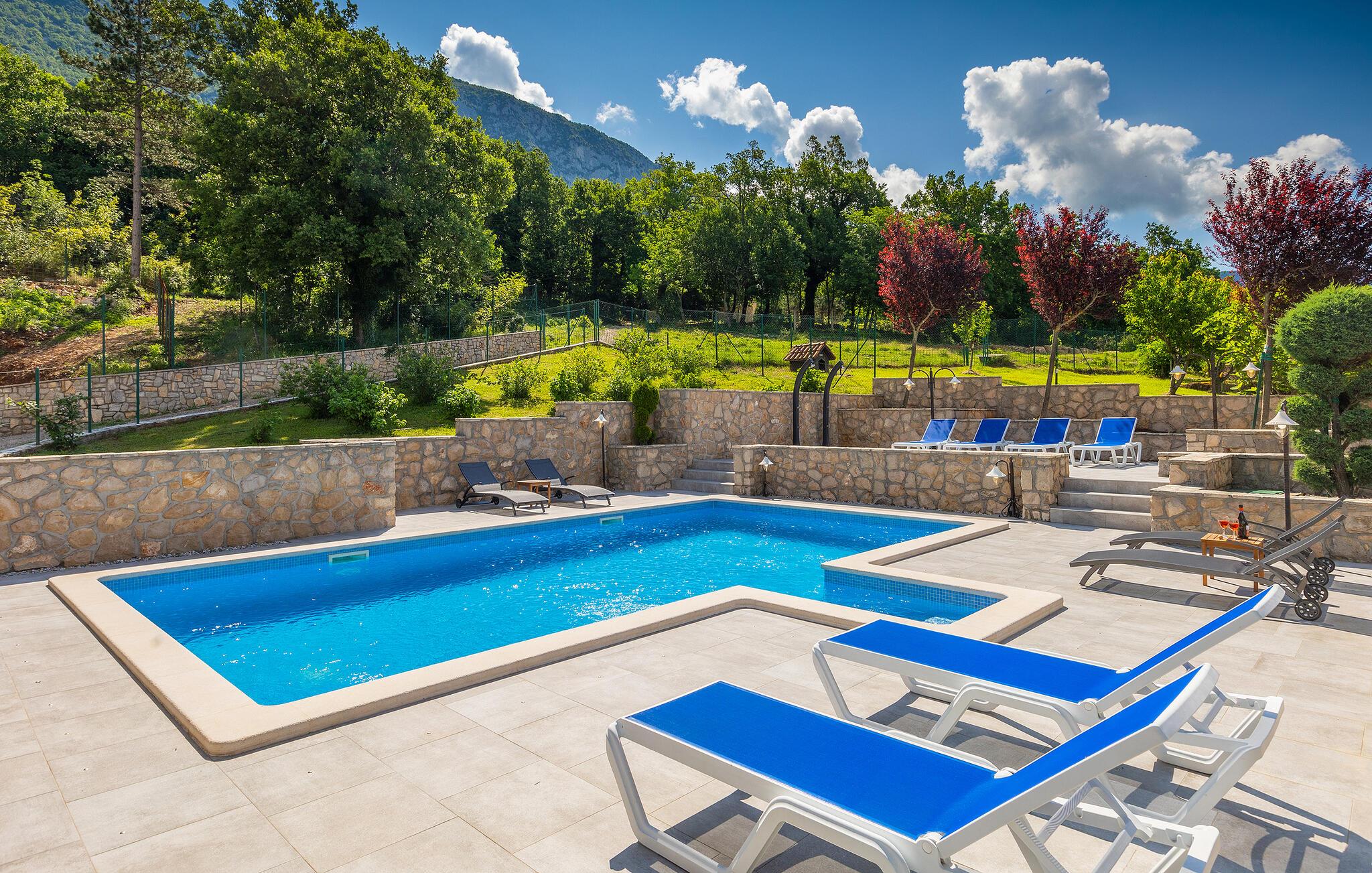 Villa Skavre er et magisk sted, hvor glæde, afslapning og lykke er garanteret. Det ligger på bakkerne nær Kvarner-kysten med en fantastisk udsigt over det omkringliggende landskab. Ejerne har en lille hjortefarm i nærheden af villaen, hvilket vil være en vidunderlig oplevelse for enhver gæst, der tilbringer deres tid der, da man kan svømme i poolen og nyde udsigten til dyrene, der frit løber rundt. En ægte stressaflastning for enhver naturelsker! Villaen har 3 soveværelser, hver med dobbeltsenge, 3 badeværelser og en elegant og moderne opholdsstue med 3 fuldt udstyret køkkener og en hyggelig stue. Her finder I en ekstra soveplads - en komfortabel sovesofa, passende til 2 gæster. Og hvis en del af jeres gruppe har brug for lidt hvile, mens den anden ønsker at tilbringe en lang nat med at nyde kroatiske specialiteter, har ejeren endda sørget for denne lille detalje. Lige ved siden af hovedhuset ligger et mindre hus bestående af et underholdningsrum med pizzaovn og et toilet.