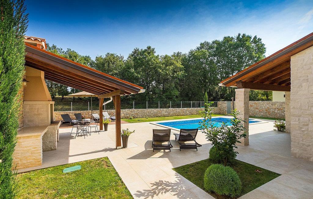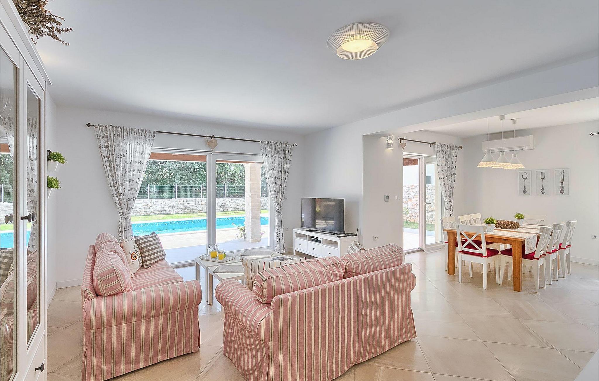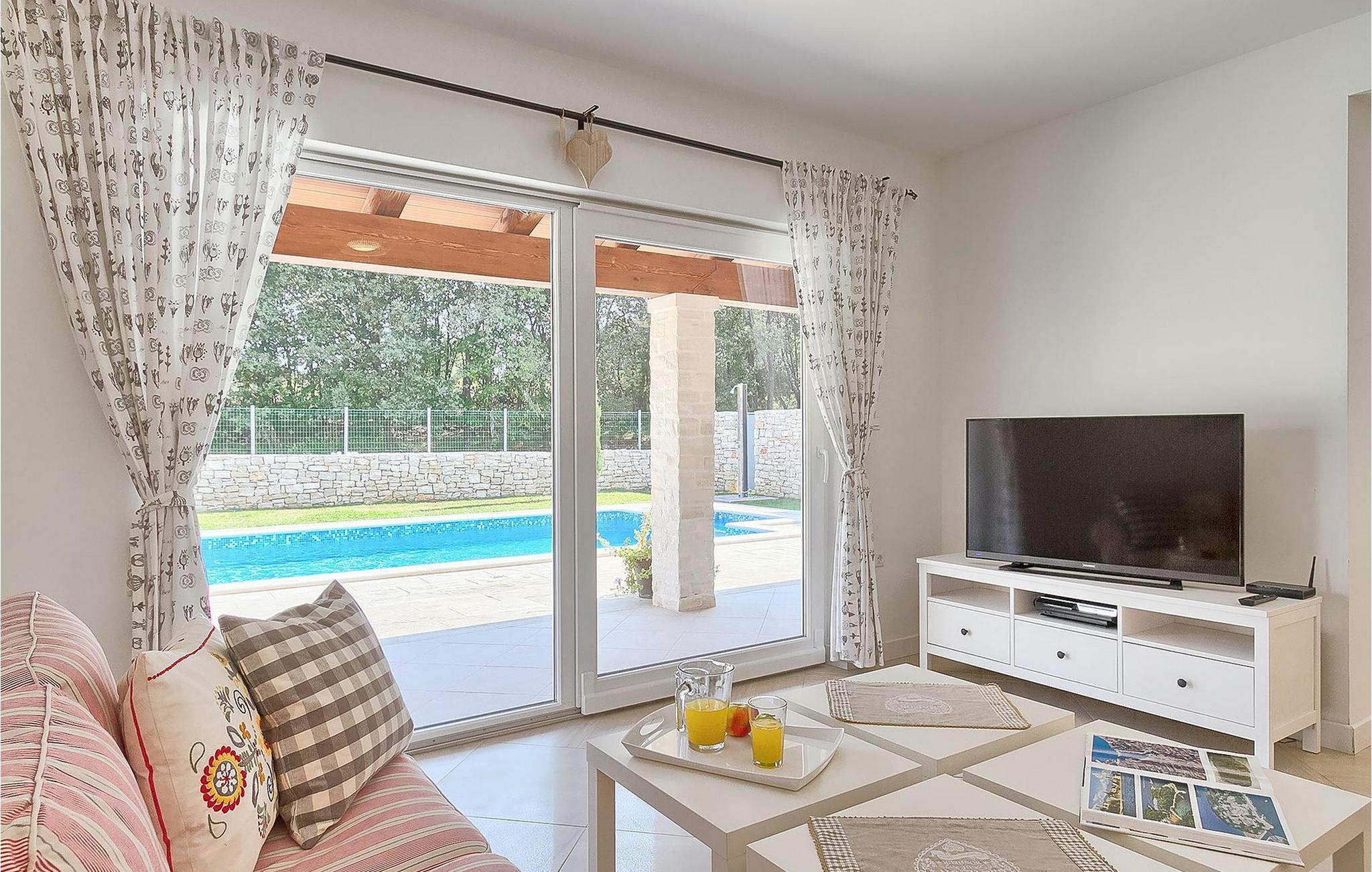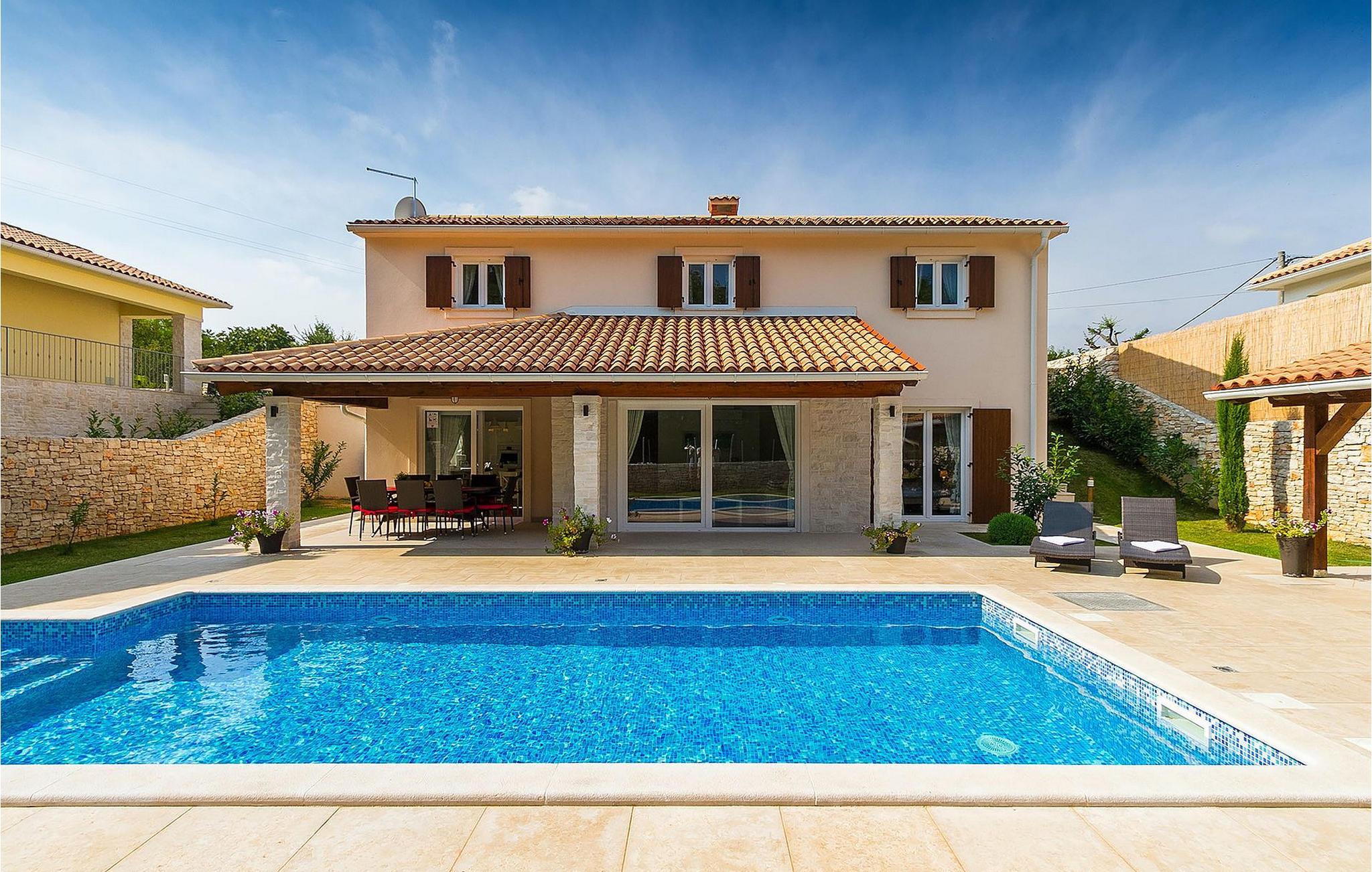 Charmerende villa Natasha er det ideelle valg til en ferie under den varme istriske sol. Ved første øjekast kan man se, at villaen er indrettet med vægt på at skabe en familiær atmosfære. Villaen byder på fire lyse og komfortable soveværelser og kan rumme op til otte gæster. Fra siden af parkeringspladsen kommer du ind på villaens øverste etage, hvor du finder tre soveværelser med aircondition og tre badeværelser. To soveværelser er udstyret med en dobbeltseng hver og har eget badeværelse. Det tredje soveværelse har to enkeltsenge. På øverste etage er der også et tredje, separat badeværelse. I stueetagen af villaen er der et soveværelse med aircondition med direkte adgang til poolen, et badeværelse og en lys stue med et tv, der er forbundet med spisestuen og fuldt udstyret køkken i et åbent rum koncept. Hele rummet har aircondition. Vores yngre gæster vil blive glade for at se, at der er en PlayStation 3 til deres rådighed. Ved siden af huset er der en overdækket terrasse med spisebord. grillelskere vil blive glade for at se det udendørs overdækkede område med kulgrill. I villaens have er der en swimmingpool og liggestole til at slappe af og nyde solen. Du kan også spille dart for en sjov ferie i pausen mellem svømning i den opvarmede pool og afslapning i solen. Ejendommen er fuldt indhegnet og har privat parkering til 3 biler.
