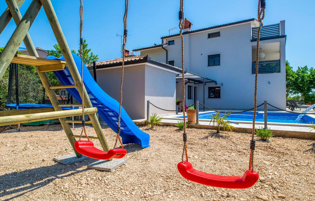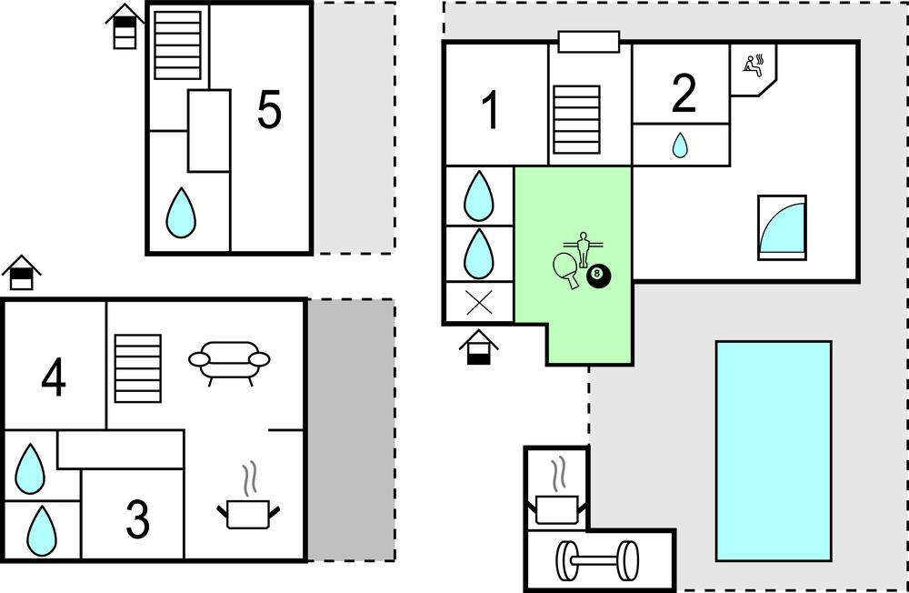 Her er adskillige underholdningsmuligheder for voksne og børn samt et fitnessrum til jeres personlige træning. Wellnessområdet, med whirlpool og sauna, tilbyder udsigt over det grønne og haven, hvor poolen, legepladsen og et udendørs køkken ligger.