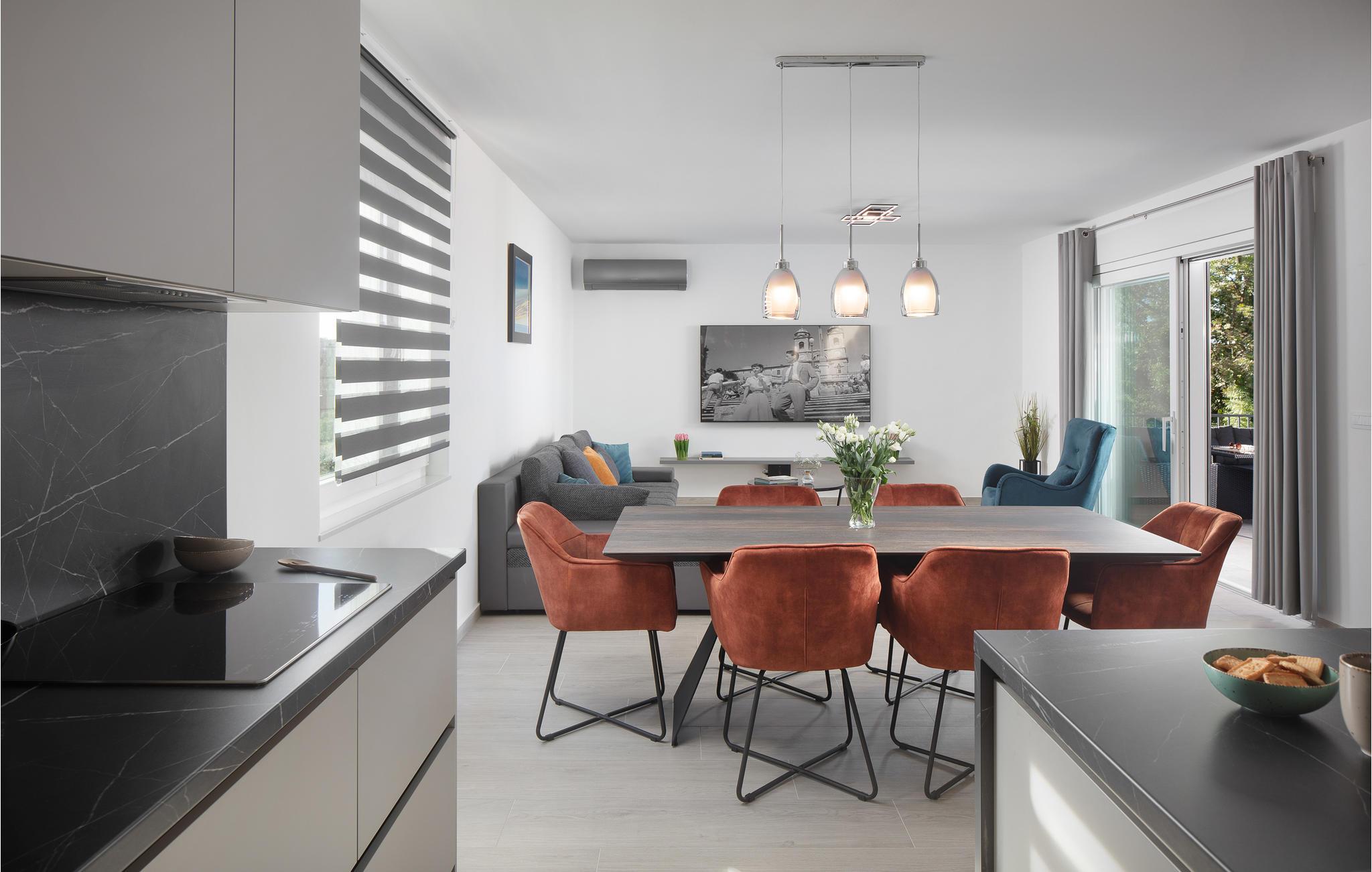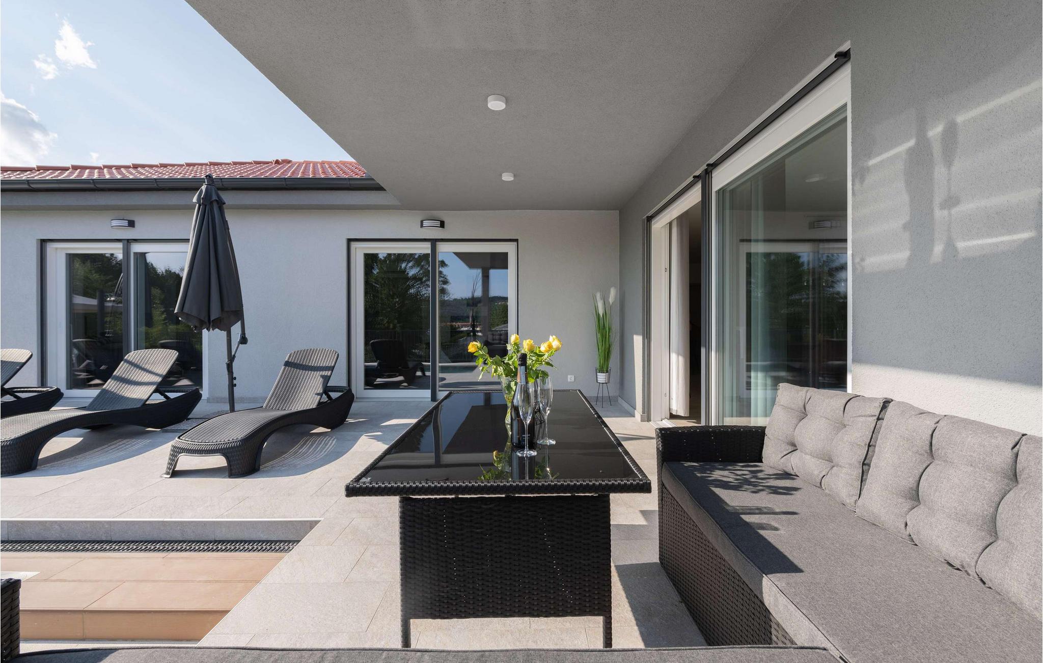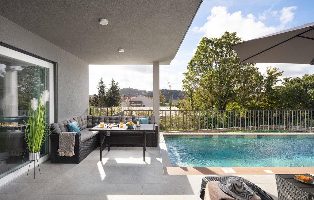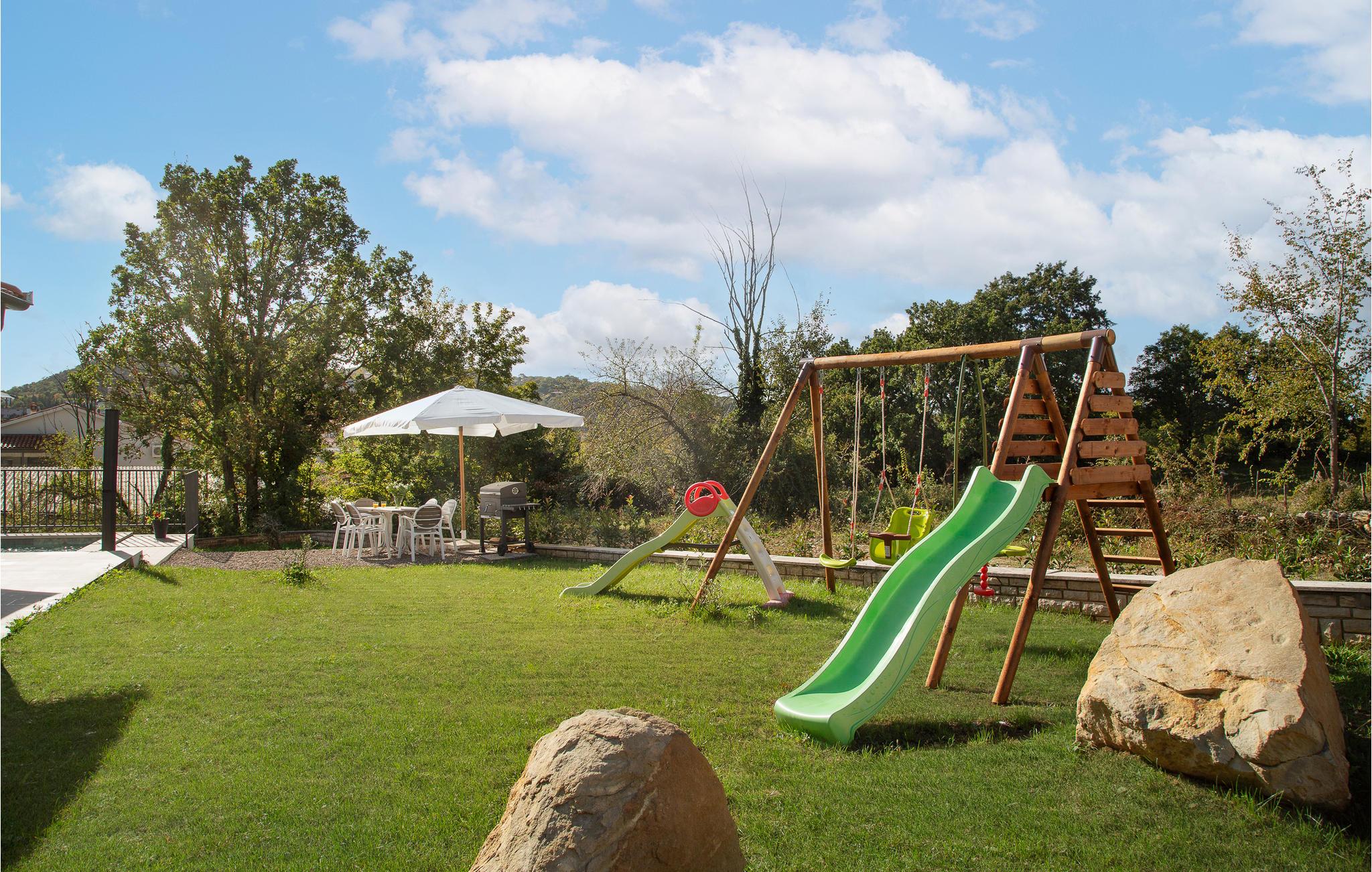 Villa Si ligger i middelalderbyen Labin i Istrien, på en bakke over Rabac. Den rige kulturarv i byen Labin bringes til live gennem forskellige kunststudier og unge, der mødes på caféer rundt om i byen. Et sandt paradis på jorden, omgivet af uberørt natur og grønt, vil Villa Si helt sikkert tilbyde dig en fredelig ferie i fuldstændig privatliv, som du har drømt om i lang tid! Villaen er bygget i 2023 i en nutidig og moderne arkitektonisk stil. Gæsterne råder over 170 m2 boligareal, det samlede areal af ejendommen er 400 m2. Villaen ligger kun 5 km fra havet, så du er samtidig tæt på det rene og klare Adriaterhav og til gengæld langt væk fra byens stress og jag. Det er fuldt airconditioneret og har plads til maksimalt 6 personer, med det optimale antal 4. Du kan bruge det moderne udstyret køkken, ideelt til at tilberede lækre måltider til hele familien eller en gruppe af bedste venner. Der er også en spisestue med et spisebord med plads til 6 og en stue med en behagelig sofa, et sofabord, en lænestol og et tv. Gæsterne er indkvarteret i to soveværelser med dobbeltsenge (180x200), yderligere to personer kan sove på sovesofaen. Et soveværelse har eget badeværelse med badekar, og villaen har et andet badeværelse med bruser. På den udendørs terrasse kan du komfortabelt forfriske dig i den 26 m² store og 1,6 m dybe pool, mens du kan solbade på 6 liggestole ved siden af. En yderligere funktion ved poolen er 3 massagedyser. På terrassen er der også et udendørs opholdsområde til at nippe til morgenkaffe, et udendørs spisebord og en udendørs kulgrill. Yderligere faciliteter på Villa Si inkluderer en vaskemaskine og et strygejern, til børn er der et fodertrug og en barneseng til rådighed. Fans af en aktiv ferie vil blive glade for fitnessrummet i nabohuset, 30 meter fra villaen. Villaens gårdhave byder på 2 private parkeringspladser. Attraktioner og lokale aktiviteter til rådighed for dig er vinture eller olivenolieture, vandsport, cykling, dykning, golf eller besøg af byer og historiske monumenter. Istrien er fuld af skjulte skatte, og Labin er bestemt en af dem. Du får mulighed for at smage det gastronomiske tilbud, der vil blæse dit sind med god prosciutto, ost og trøfler. Gå heller ikke glip af at smage en dråbe olivenolie og prisvindende istriske vine som Teran eller Merlot. Labin har en charmerende bymidte omgivet af befæstninger med talrige bevarede paladser og kulturelle monumenter, der kombinerer fortid og nutid på en usædvanlig måde. Du kan spise frokost eller middag på restauranter eller pizzeriaer, hvor du kan spise fremragende kager og drikke kaffe i skyggen af den smukke terrasse på den centrale plads i den gamle bydel i Labin. Du vil ikke gå glip af sjov og ferie, så tag til Istrien og tag mindet om den smukkeste ferie i dine drømme! Velkommen til Villa Si!