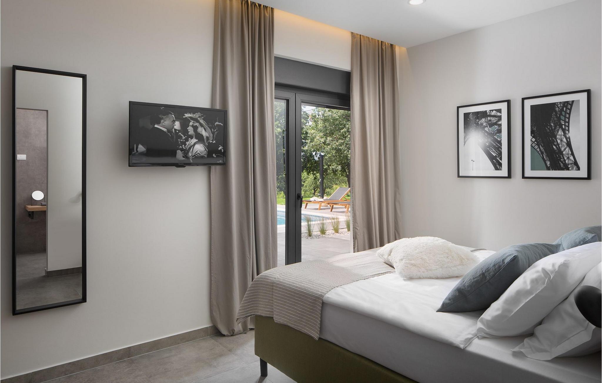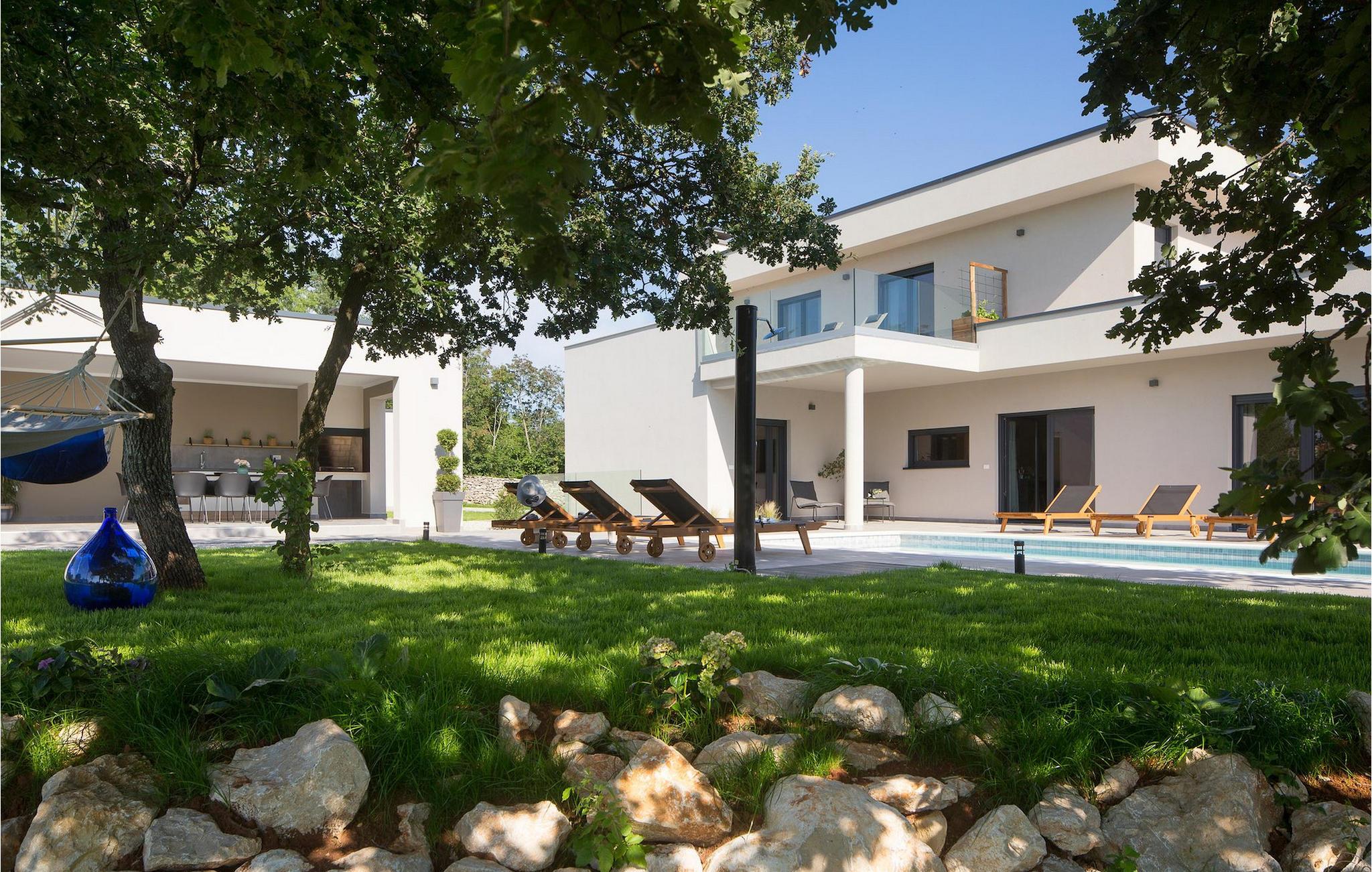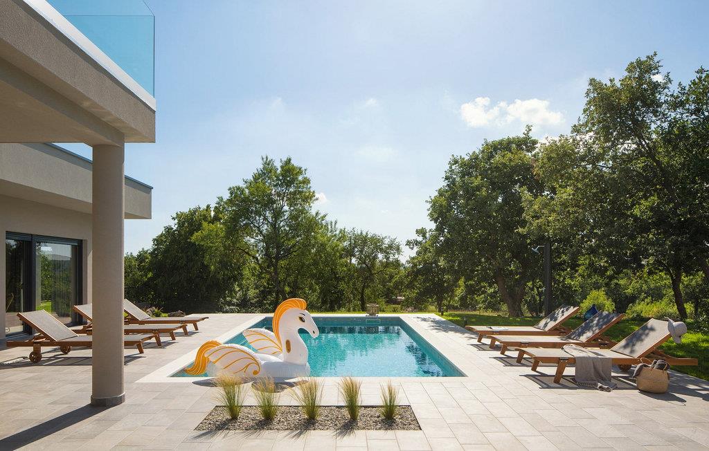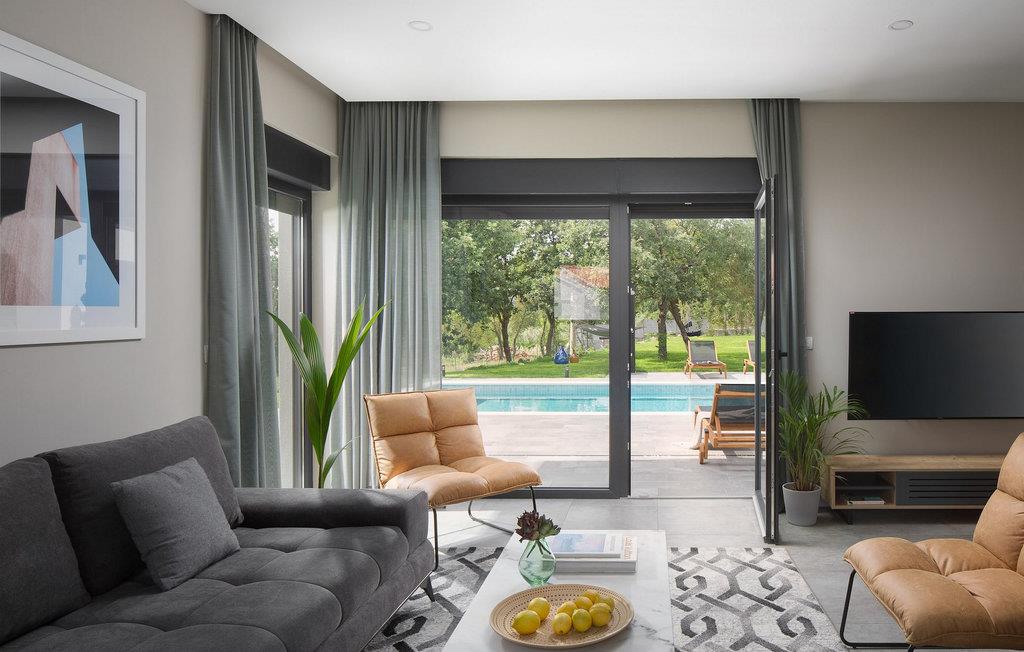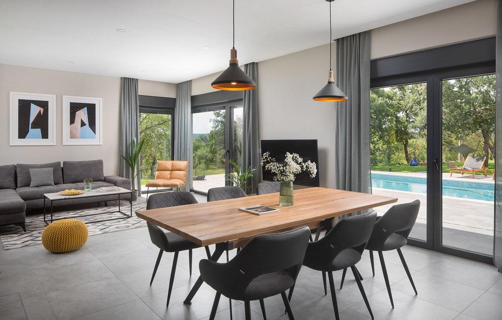 Villa Sent er en moderne villa med privat pool og en fantastisk panoramaudsigt over det idylliske Istriske landskab. Hvis du drømmer om en perfekt ferie, er dette et sted at bo. I stueetagen af villaen finder du en åben stue, spisestue og et køkken. Stueetagen indeholder også et soveværelse med eget badeværelse, begge velegnet til at rumme gæster med nedsat mobilitet. På første sal i villaen finder du yderligere to soveværelser med eget badeværelse. Du kan også nyde dine solnedgange på balkonen på første sal med udsigt over det omkringliggende område. I kælderen er der et legerum for børn med dart, bordfodbold, bordtennis og et poolbord. Hvis du kan lide at dyrke yoga eller kan lide at dyrke motion, er dette rum også perfekt til det, og her er en Orbitrek fitnessmaskine til din rådighed, som holder dig i perfekt form under ferien. I det udvendige område af villaen er der en overdækket udendørs spisestue med køkken, hvor du kan tilberede og nyde et tilfredsstillende sommermåltid. Rundt om poolen er der liggestole, hvor du kan slappe af, og en stor swimmingpool vil give din krop velfortjent afslapning på varme sommerdage. Solbad, nyd en kold drink, eller gå en tur gennem det rummelige land, som strækker sig over 4900 m2, inklusive en smuk olivenlund. Book Villa Sendt nu, og gør disse drømme til virkelighed. VIGTIGT: Yngre grupper er ikke tilladt. Middelalderbyen Labin ligger på en bakke med udsigt over kystbyen Rabac, og det er det historiske og administrative centrum i det østlige Istrien. Der blev fundet tidlige bosættelser i området langt tilbage til bronzealderen, hvilket gør hele det omkringliggende område til et paradis for historie- og kunstinteresserede med sin rige kulturelle og arkitektoniske arv. Kun tre kilometer væk ligger Rabac, en malerisk kystfiskerby, også kendt som Kvarnerbugtens perle. På grund af den smukke bugt og pragtfulde, tamme omgivelser er det et paradis for turister. Fra Labin kan du planlægge mange dagsture rundt omkring i Istrien, da området er godt forbundet med større veje. Hvis du ønsker at besøge større kystbyer, er Pula, Rovinj og Porec hver cirka en time væk i bil. Der er mange cykelveje og vandrestier i det omkringliggende område, så hvis du vil nyde den smukke natur, så husk at tjekke dem ud.