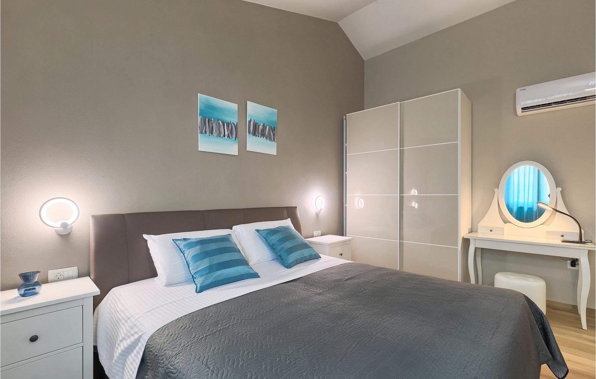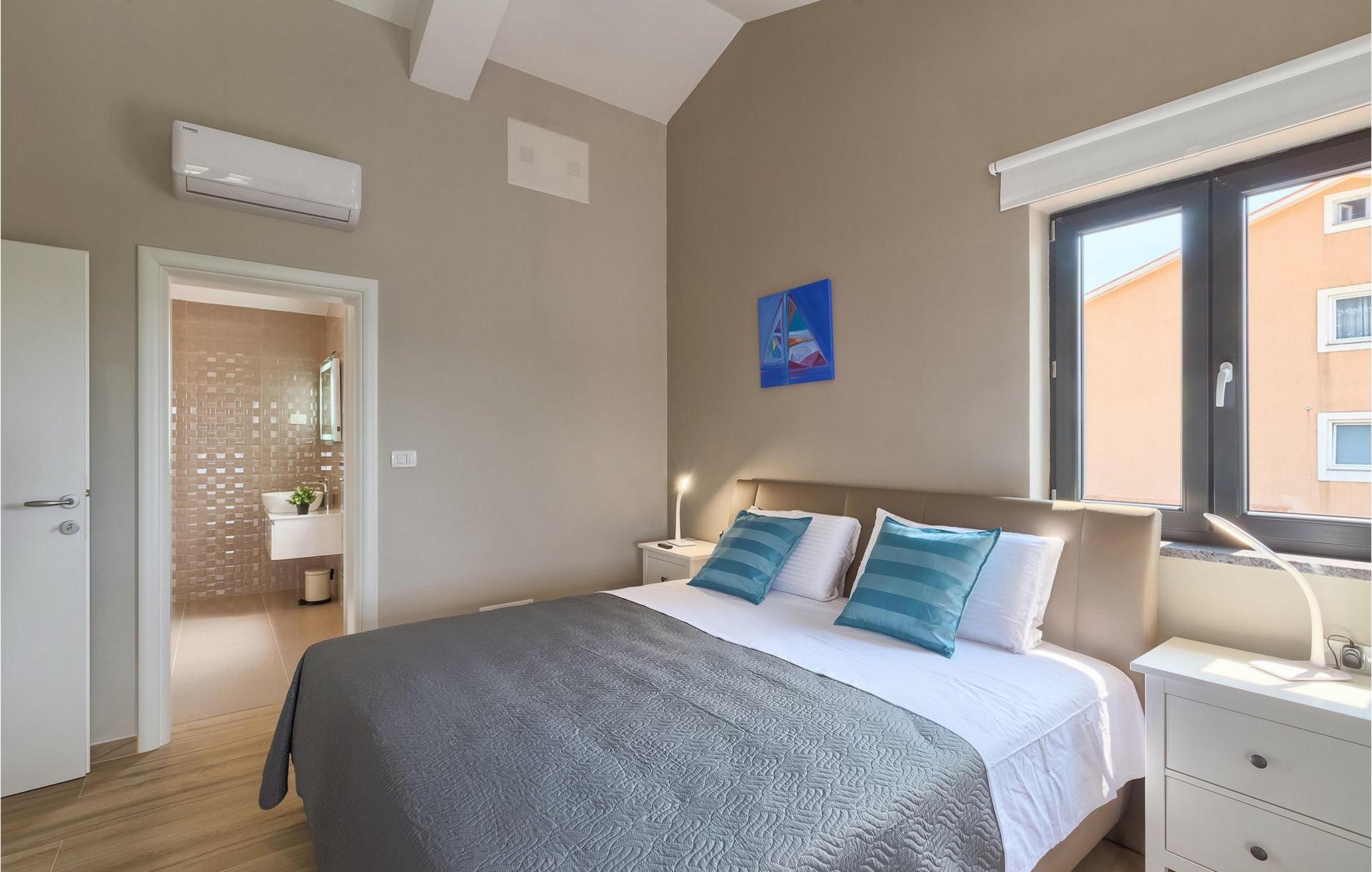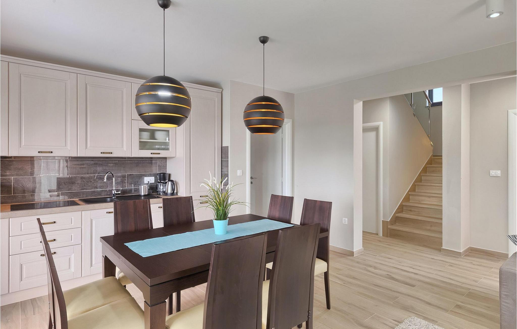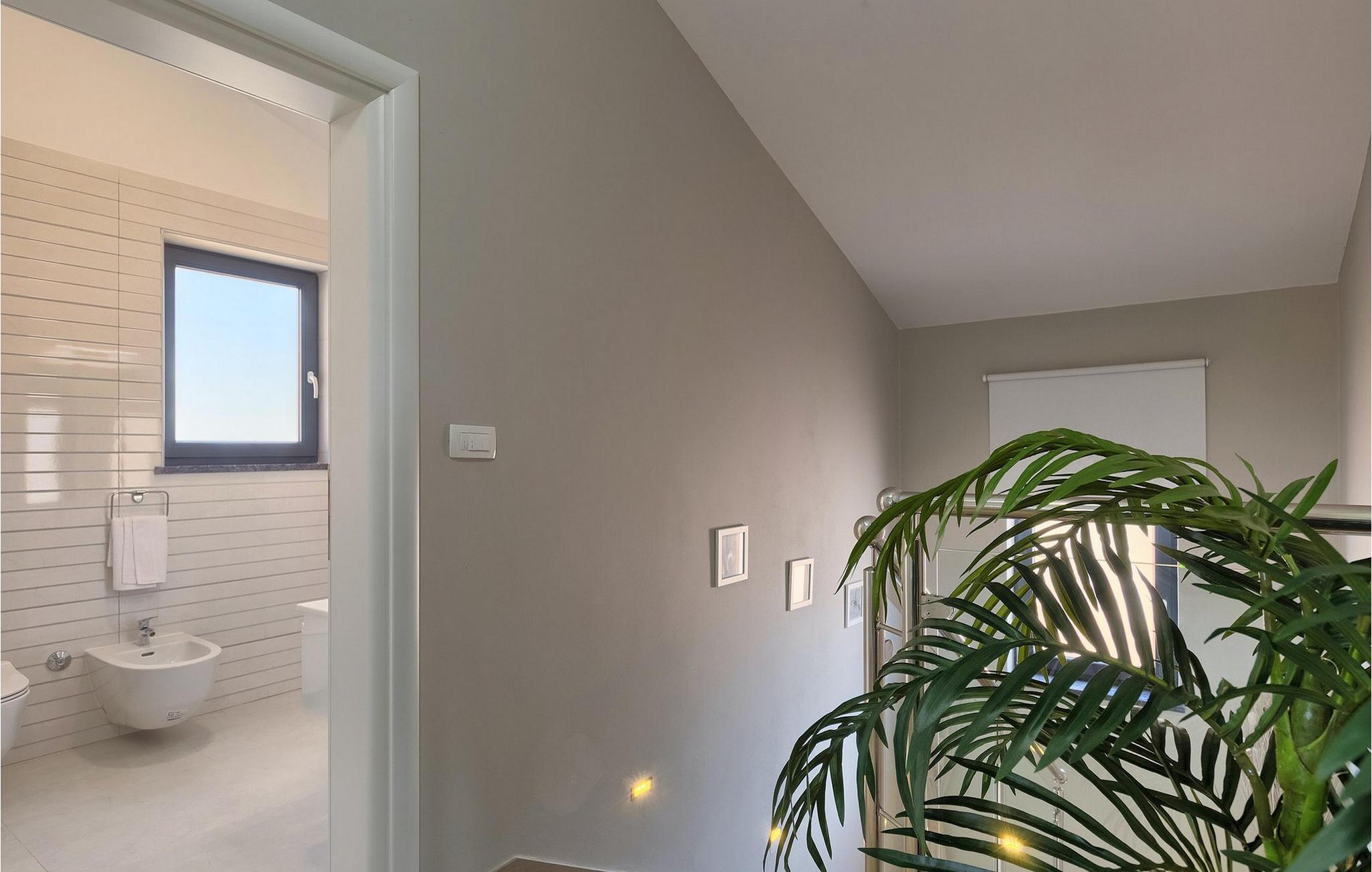 Den moderne villa Fiolla med privat pool ligger i den lille istriske by Labin og er et ideelt valg til en ferie væk fra byens stress og jag. Villaen ligger på en grund på 600 kvadratmeter og har i alt plads til 8 gæster. Når du træder ind i villaen, vil du straks føle dig godt tilpas takket være de lyse toner, som villaen er indrettet i. Stueetagen af villaen består af et åbent rum med stue, spisestue og fuldt udstyret køkken, toilet, soveværelse og et badeværelse. Fra spisestuen kan I gå gennem skydedøren ud på terrassen og nyde udsigten over villaens omgivelser. På første sal er de resterende 3 soveværelser og to badeværelser. Alle soveværelser er dobbeltværelser, har tv og aircondition, og det ene har en sovesofa.