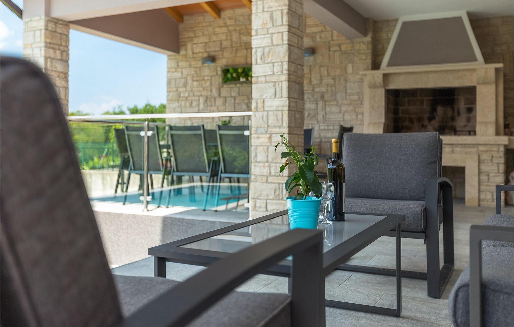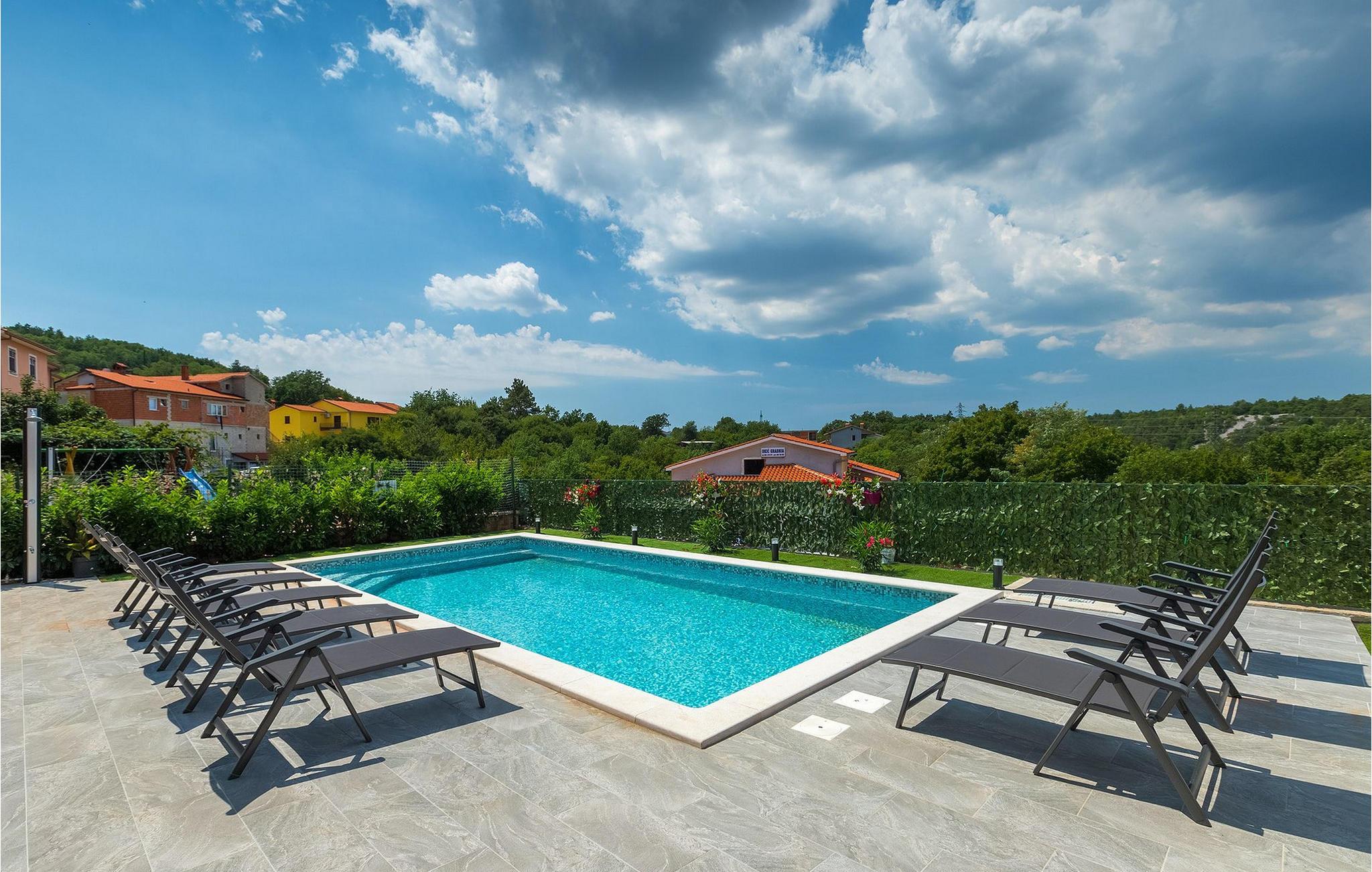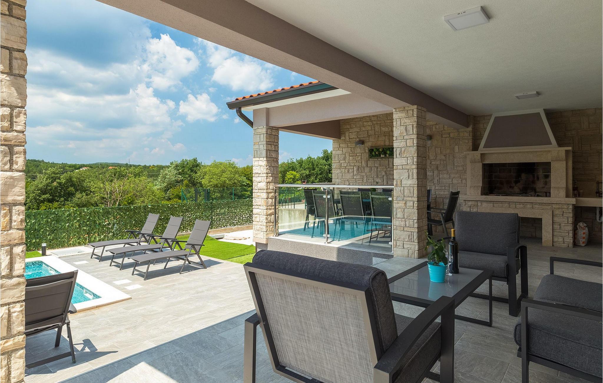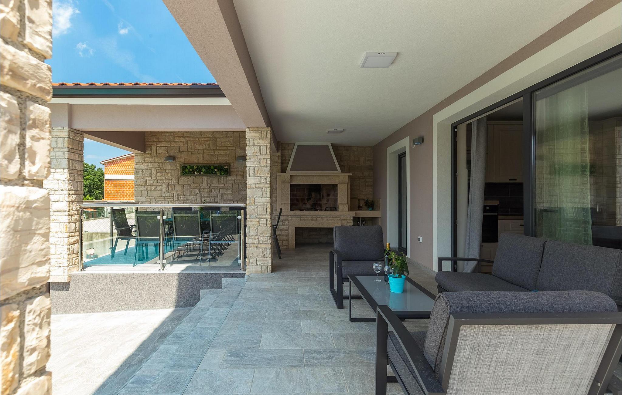 Den overdækkede terrasse med spisebord er ideel til udendørs spisning, hvilket er særligt rart i sommermånederne. Herfra har du udsigt til poolen, hvorom der er liggestole. Vi er sikre på, at du vil nyde at tilbringe tid her, nyde solen og svømme. Der er også en grill til rådighed for villaens gæster, hvor du hurtigt kan tilberede et lækkert måltid :) Denne smukke villa tilbyder en god base, hvorfra du kan udforske denne uspolerede region, og er nedsænket i det herlige, bølgende istriske landskab, men kun en stenkast fra Adriaterhavets smaragdblå vand og afsondrede naturlige strande. Den gamle bydel Labin ligger på den østlige side af halvøen Istrien, omkring 40 km fra Pula og 60 km fra Rijeka. Det er et sted rigt på atelier og det ideelle sted at nyde kunst på hvert trin gennem byen. Rabac, en tidligere fiskerby, er stedet, hvor du kan finde gode strande og restauranter.
