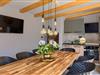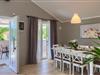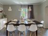 Til et fælles måltid eller socialt samvær er der udekøkken med spisestue, som er helt overdækket og har skydedør. Træbjælker kombineret med moderne dekoration gør hele rummet behageligt for sammenkomster af familie eller venner.