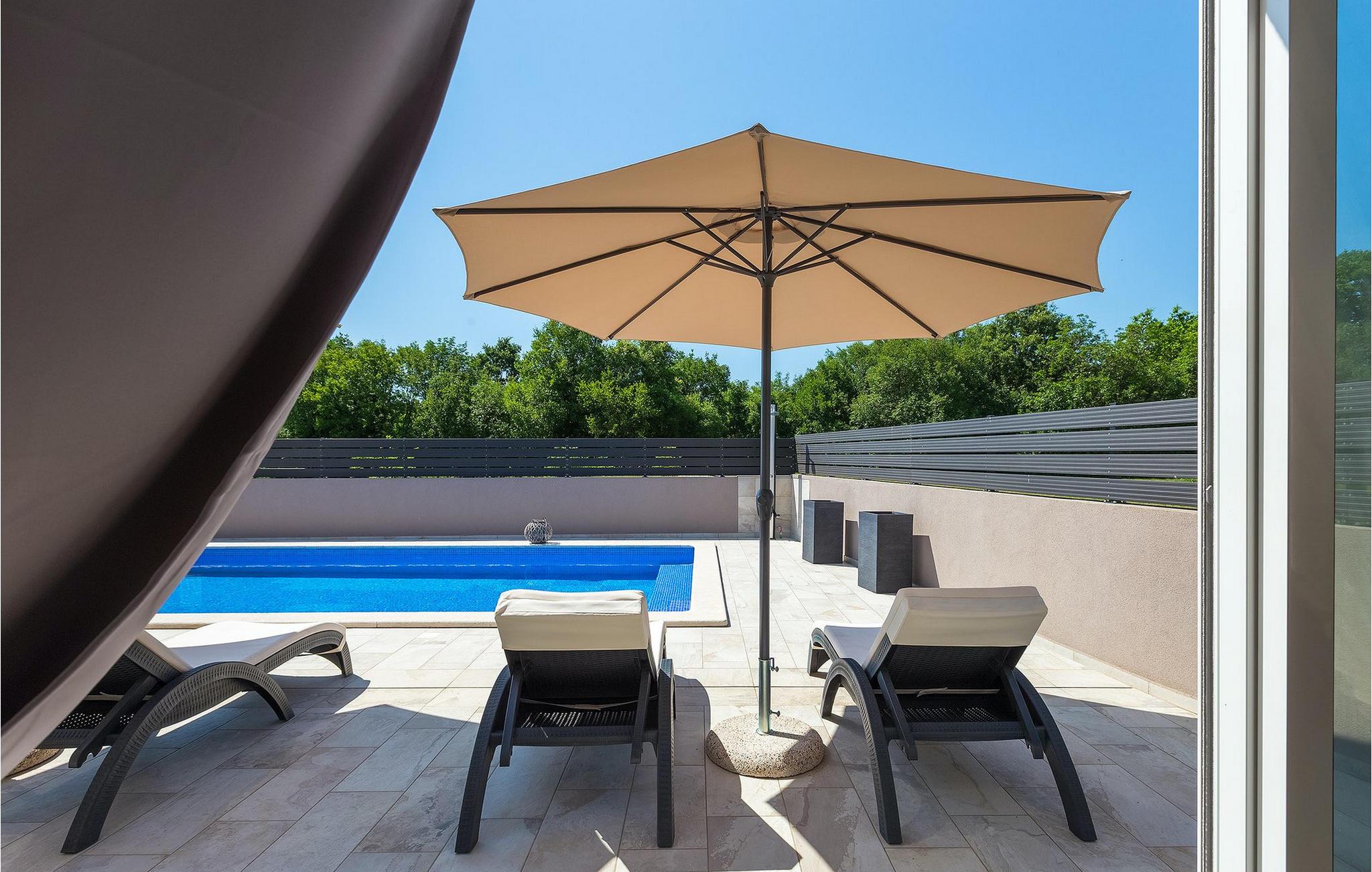I det udendørs område er der swimmingpool, omgivet af seks liggestole og to parasoller, hvor du kan solbad og nyd udsigten til de grønne trætoppe omkring villaen.