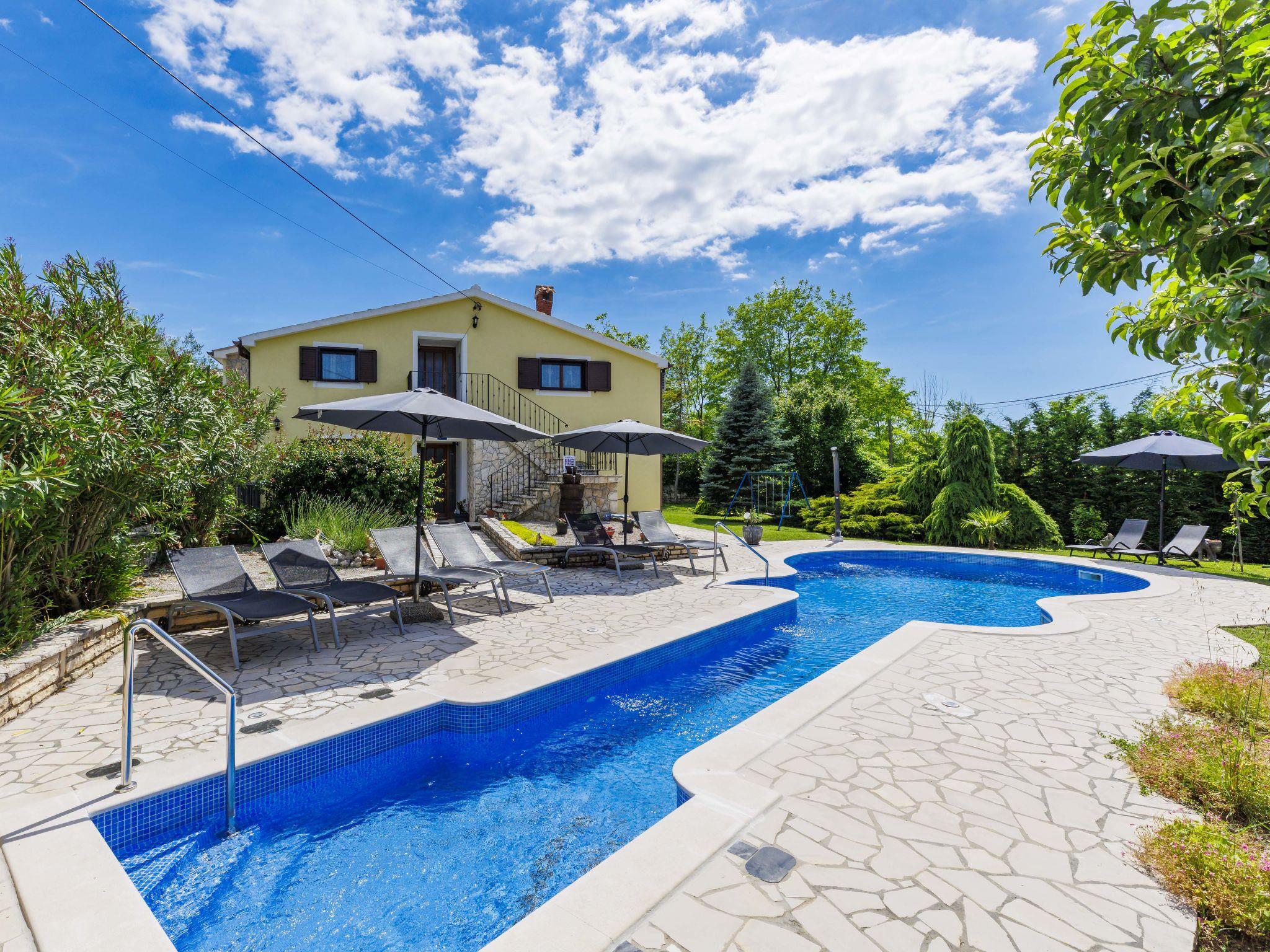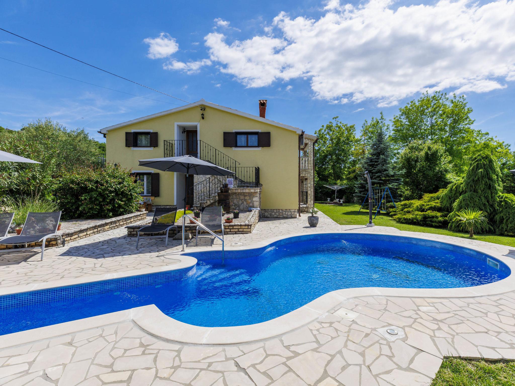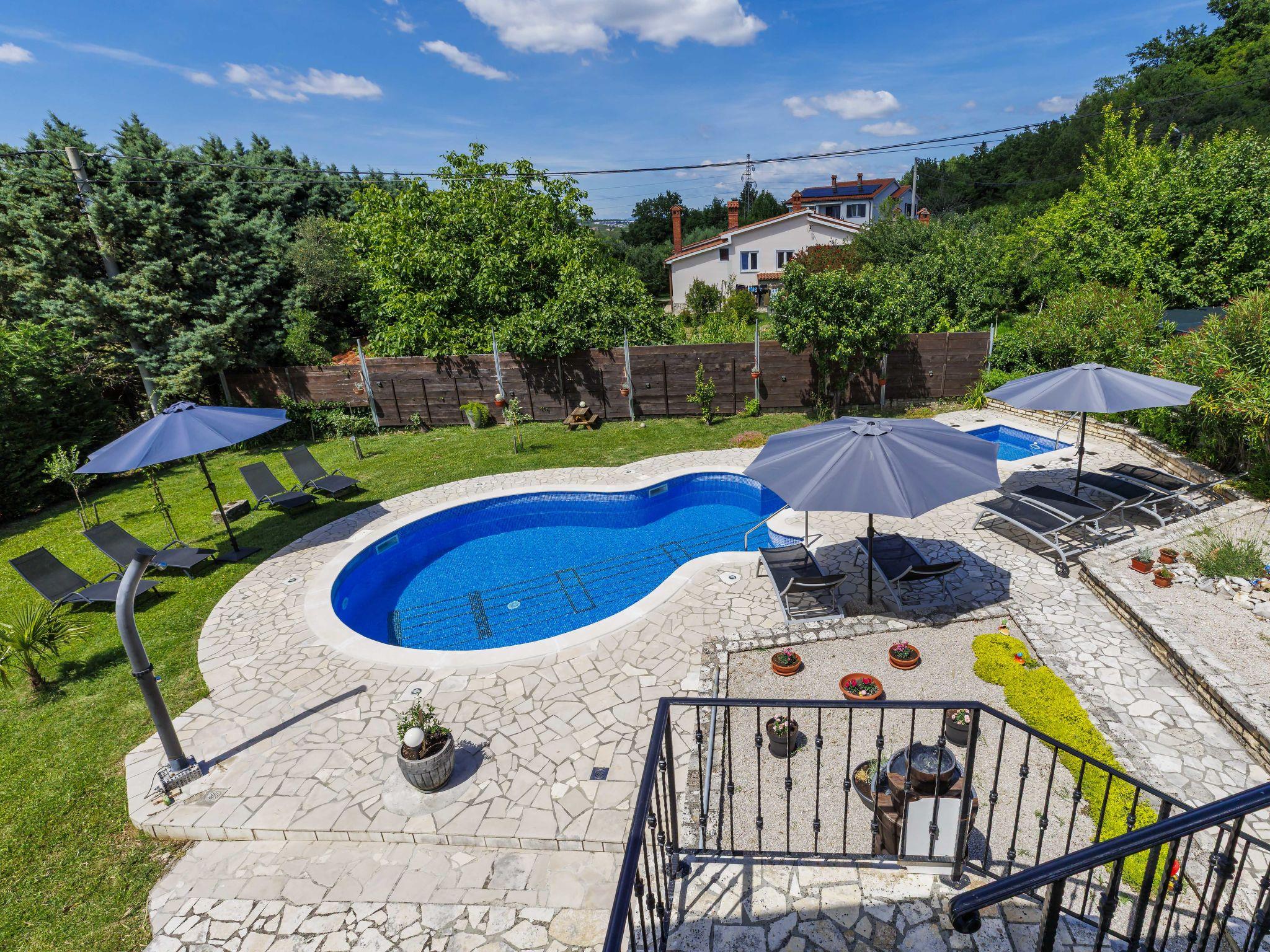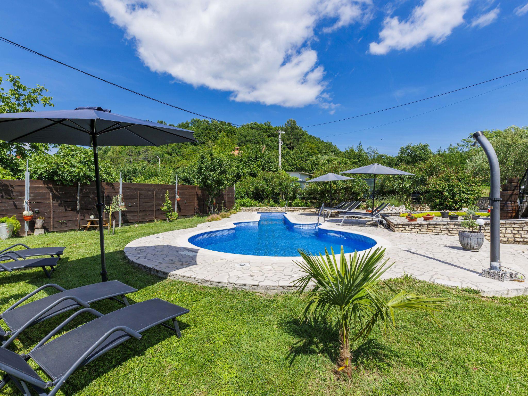 Semi-detached house "Ve-Ma", 2 storeys. In the hamlet Kapelica 2.5 km from the centre of Labin, in a quiet, sunny position, 6 km from the sea. Private: property 1'700 m2, garden, swimming pool (60 m2, depth 70 - 150 cm, seasonal availability: 18.May. - 29.Sep.) with internal staircase. Unconventional pool shape. Outdoor shower, barbecue. In the house: internet access, washing machine. Parking at the house on the premises. Shop 2.5 km, restaurant 2 km, bus stop 3.4 km, pebble beach 6 km, rocky beach 6 km. Cycle lane 100 m. The owner does not accept any youth groups. The house consists of 2 apartments, rented as one unit.