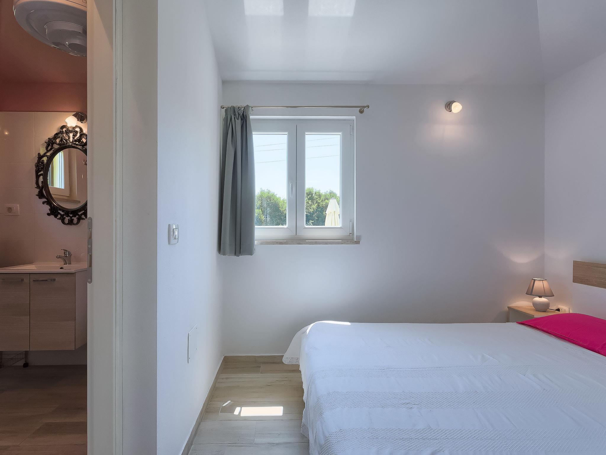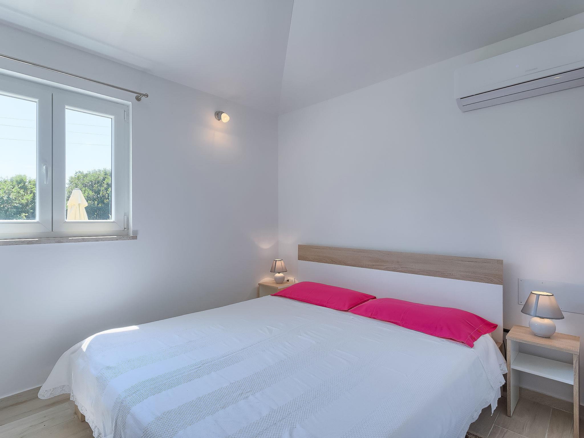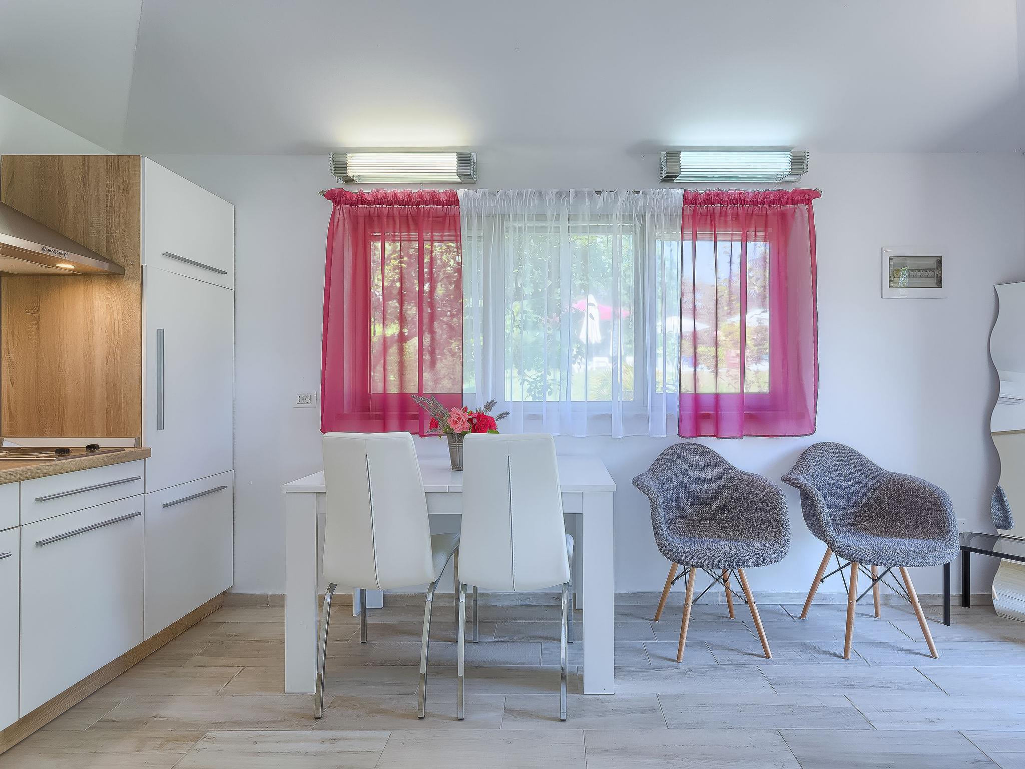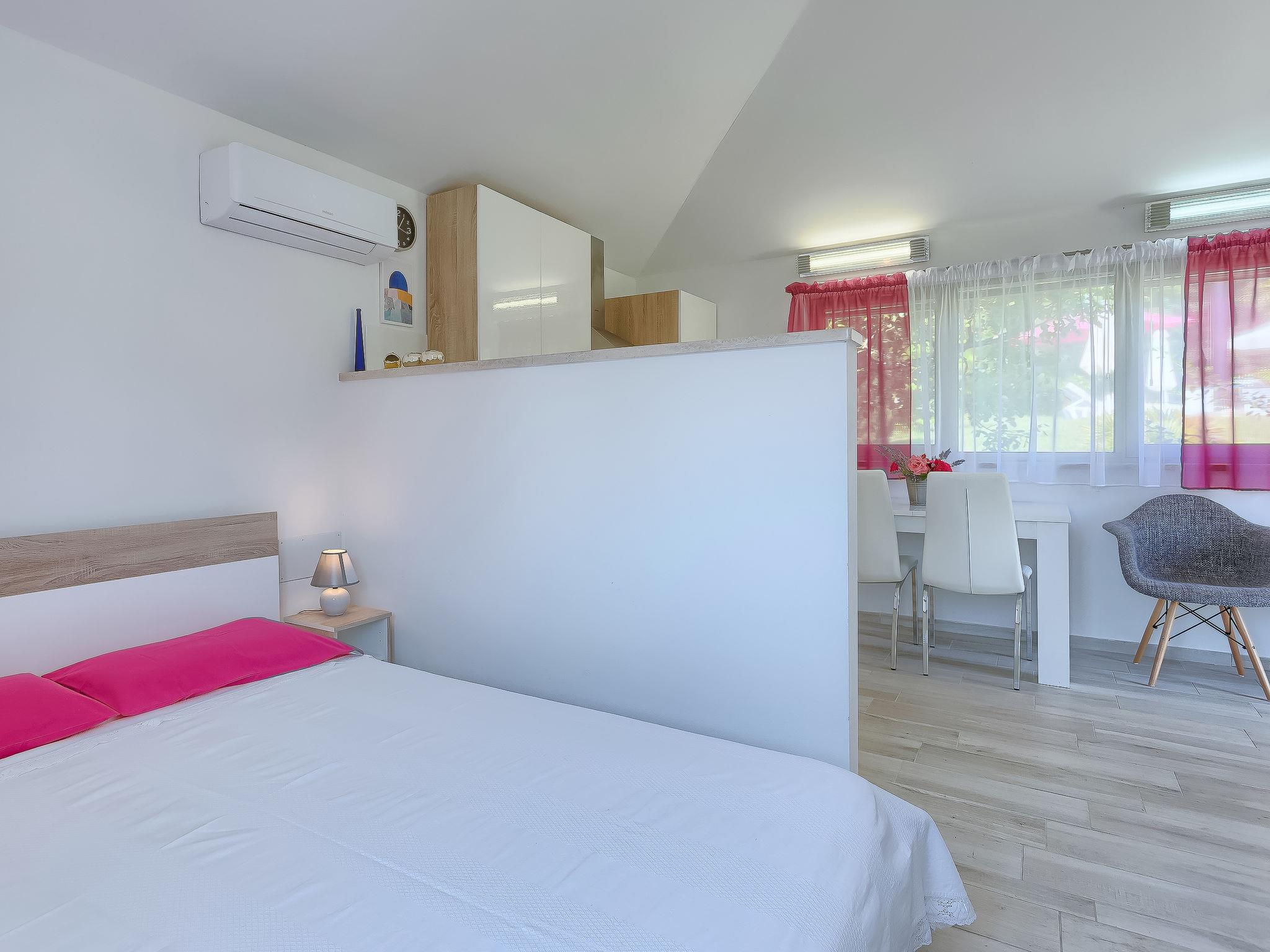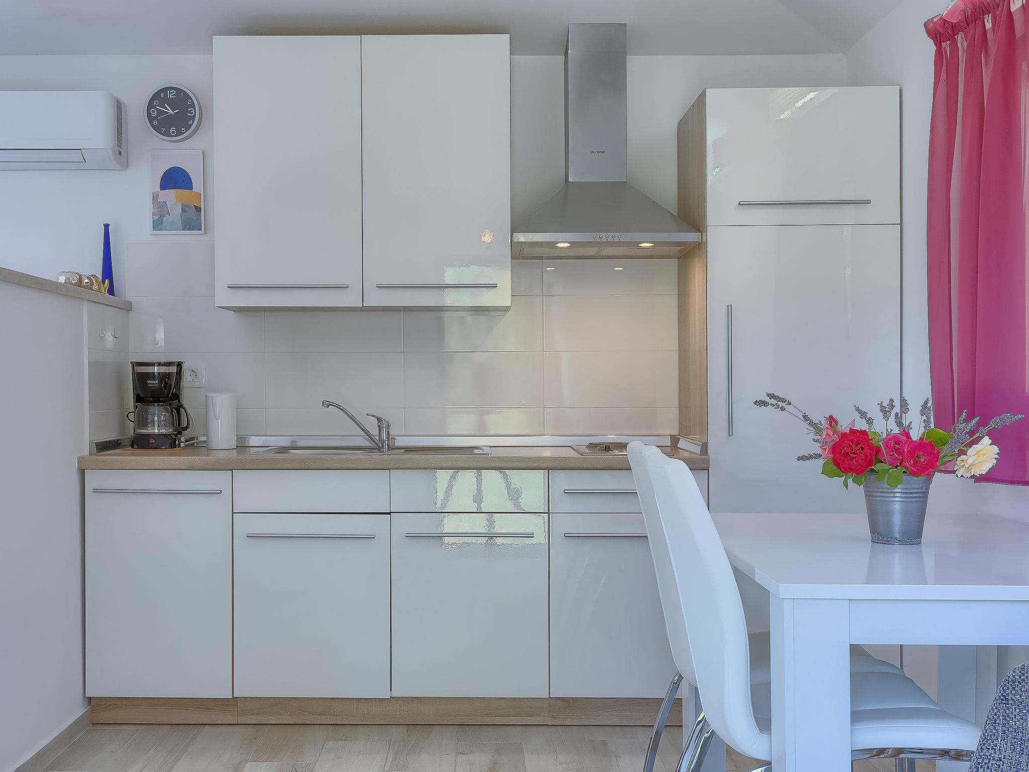 1-room house 30 m2. Living/sleeping room with 1 french bed (160 cm, length 200 cm), satellite TV (flat screen), air conditioning. Open kitchen (2 hot plates, electric coffee machine) with dining table. Shower/WC. Air-conditioning (extra). Terrace 15 m2. Terrace furniture. View of the garden. Facilities: Internet (WiFi, free). KLASA:UP/I-335-03/18-01/130