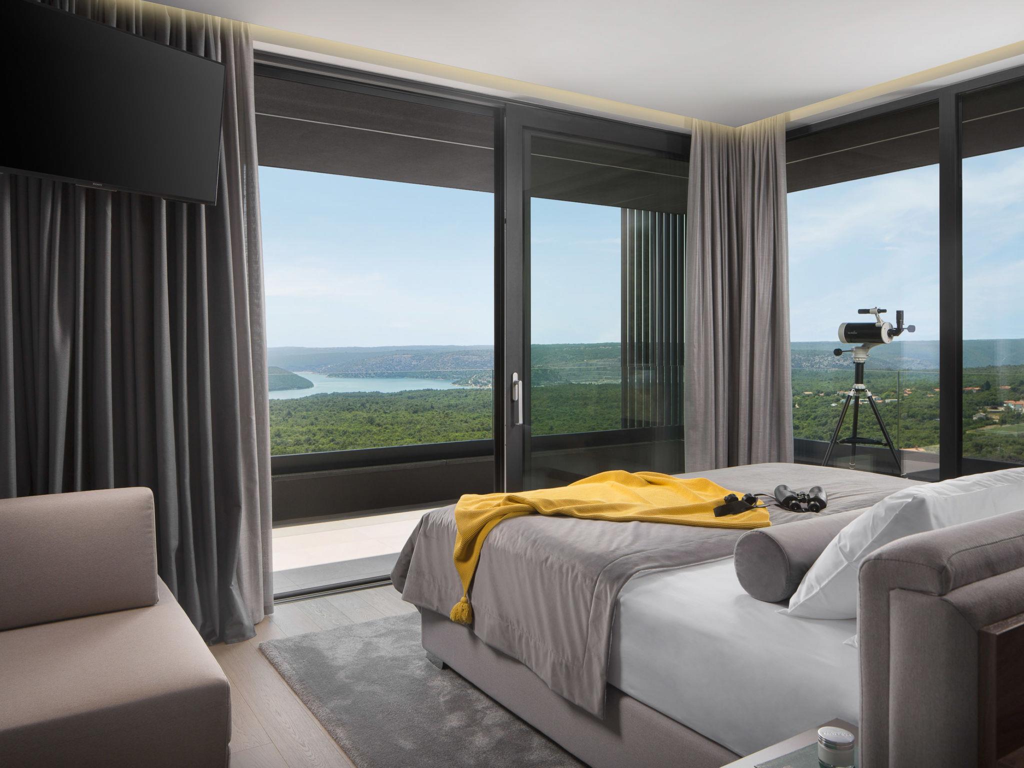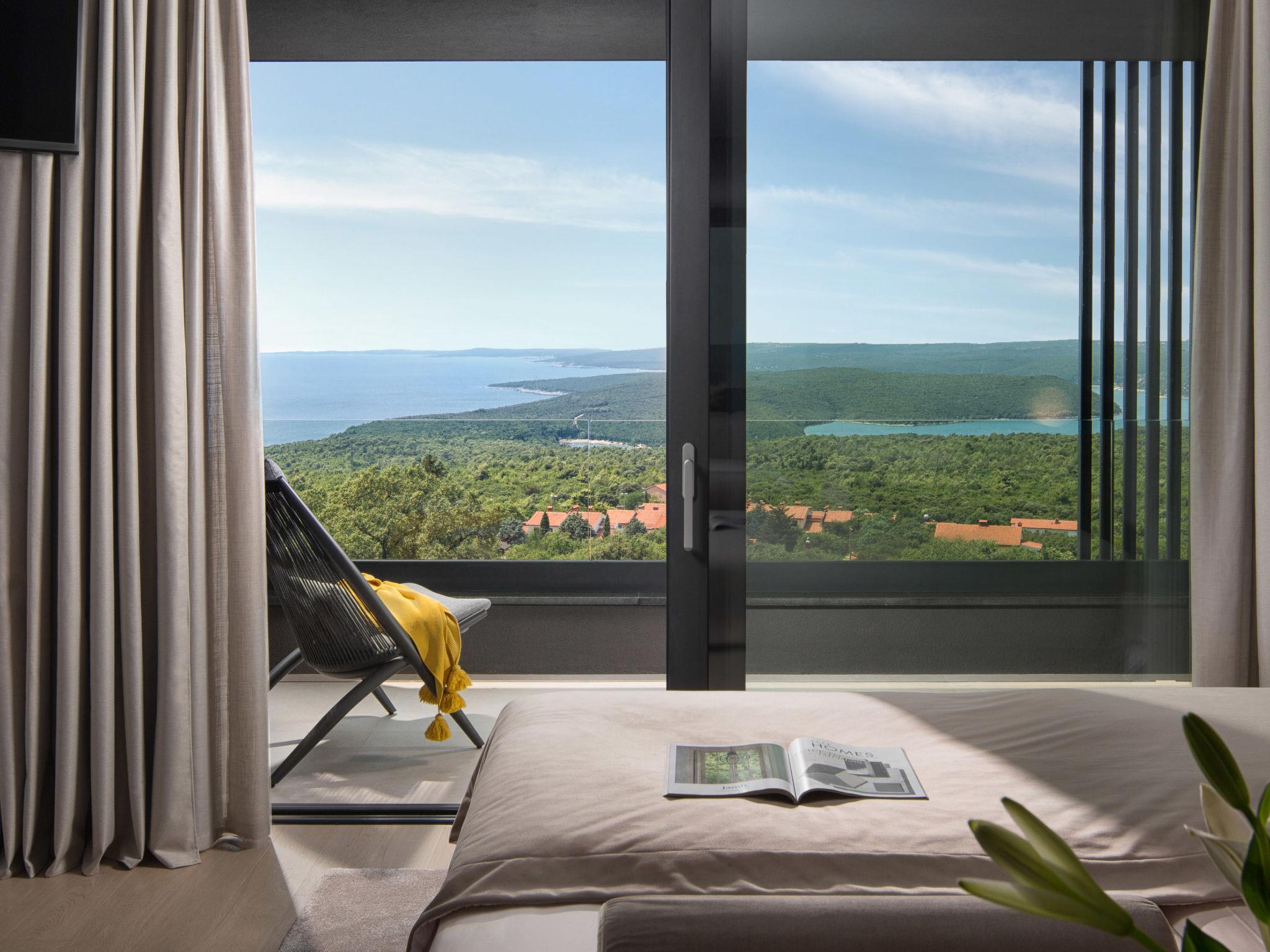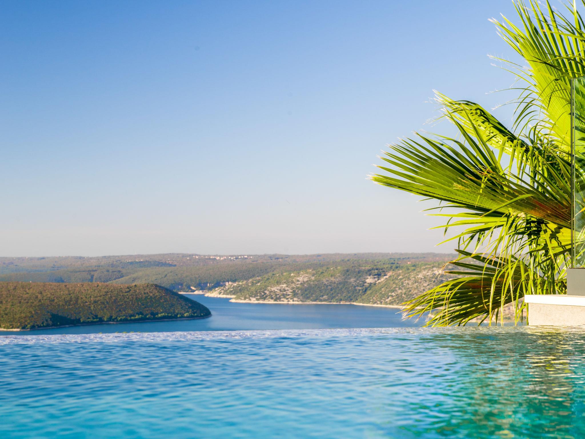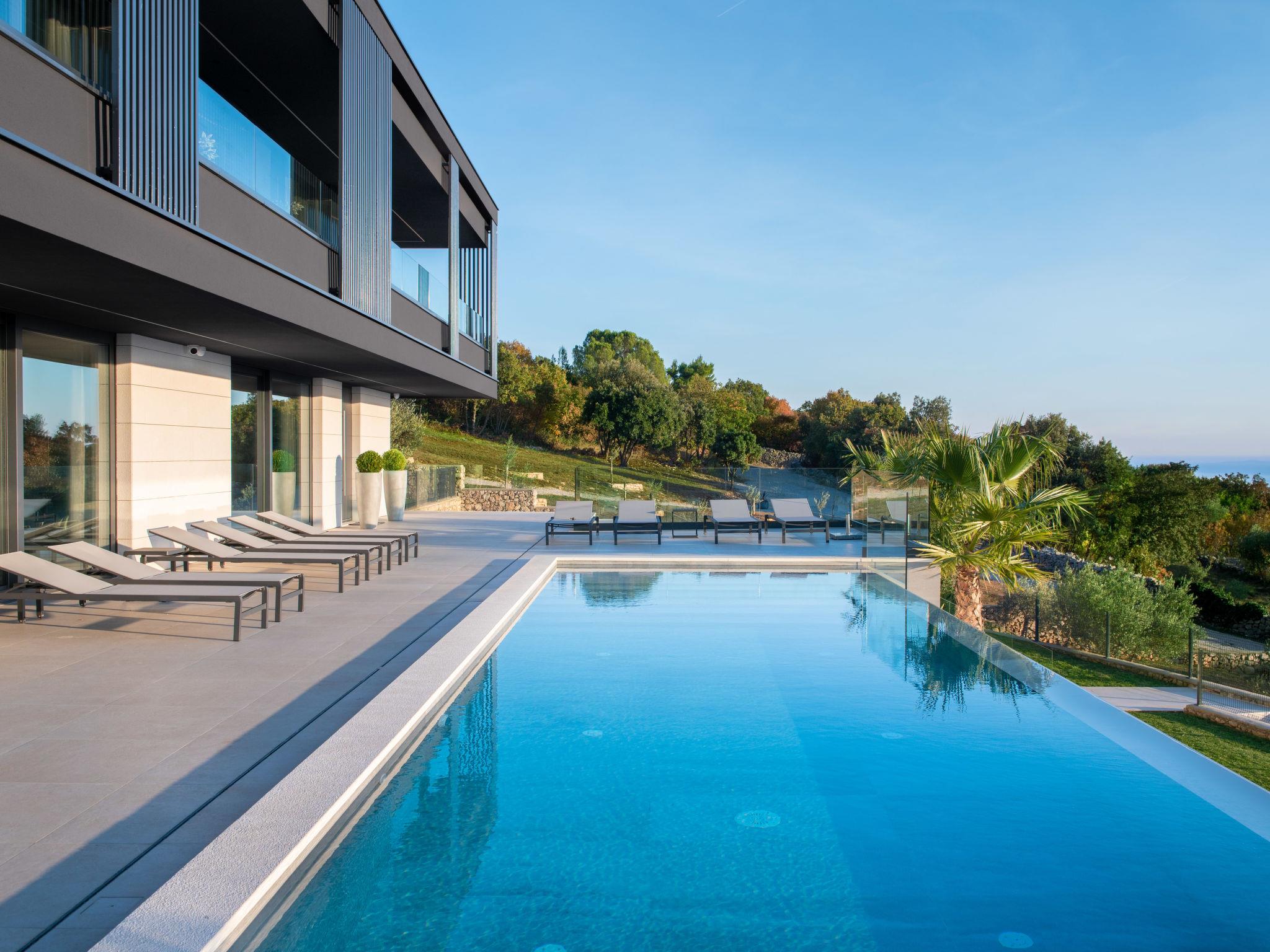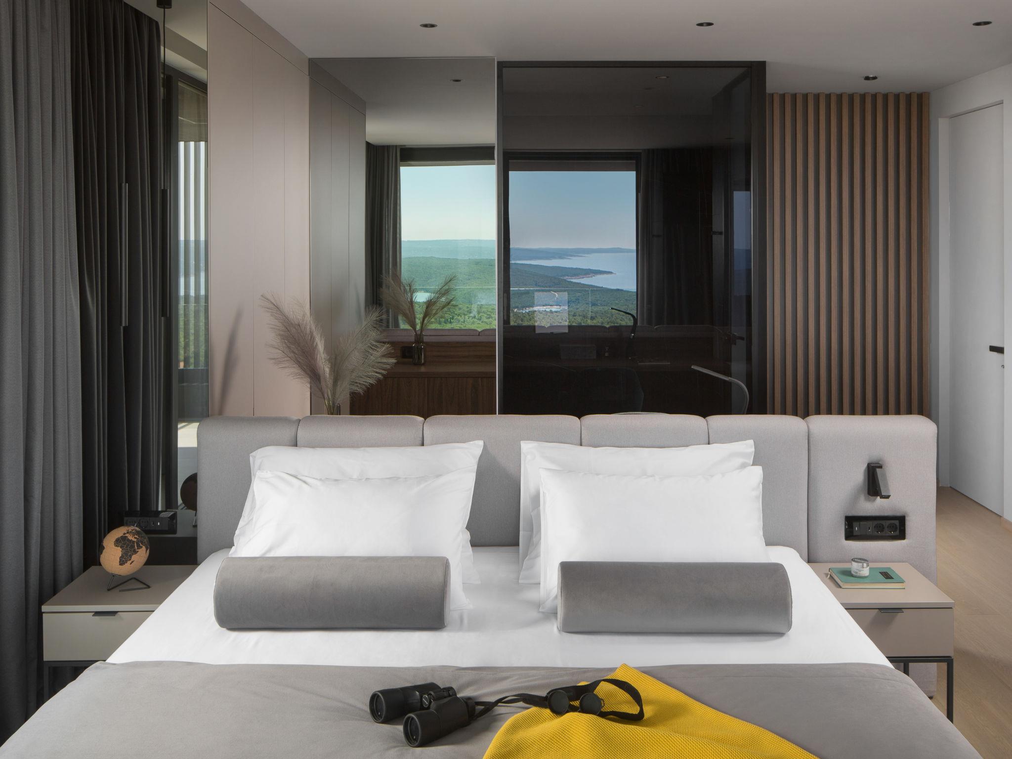 Koromacno 15 km from Labin: Very luxurious villa "Panoramica", 2 storeys, surrounded by trees and fields. In the hamlet Viškovici 15 km from the centre of Labin, in a quiet, sunny, elevated position, 1.1 km from the sea, 1.1 km from the beach. Private: property 8'240 m2 with lawn and trees, swimming pool angular (64 m2, depth 145 cm, seasonal availability: 01.Jan. - 31.Dec.) with internal staircase. Outdoor shower, hot tub, pool house with cooking stove, table tennis, barbecue, children's playground, pool maintenance by the owner/gardener. In the house: internet access, sauna, fitness room, massage (extra). Spa area, billiard table, central heating system, air conditioning, laundry, bicycles available (extra). Available: bicycles (6). Motor access to the house. Parking (for 6 cars) at the house on the premises, single garage. E-charging station. Shop 1 km, restaurant 1 km, bus stop 16.4 km, pebble beach 1.1 km, rocky beach 1.1 km. Marina 1.5 km, surf school 1.5 km.