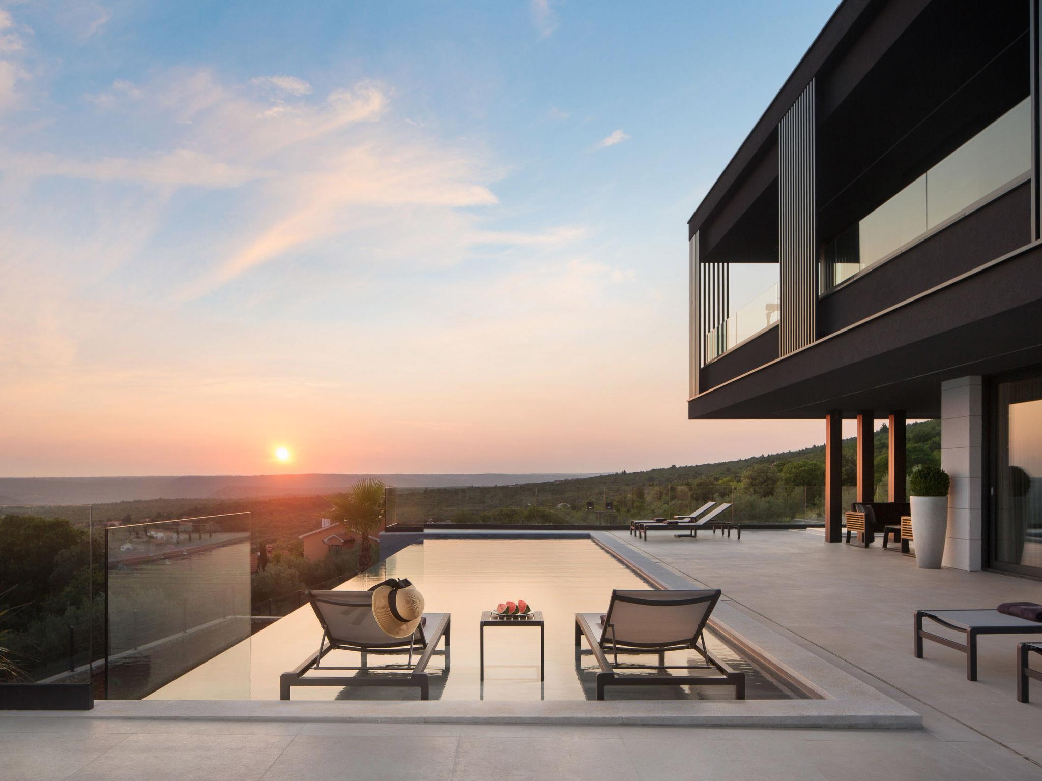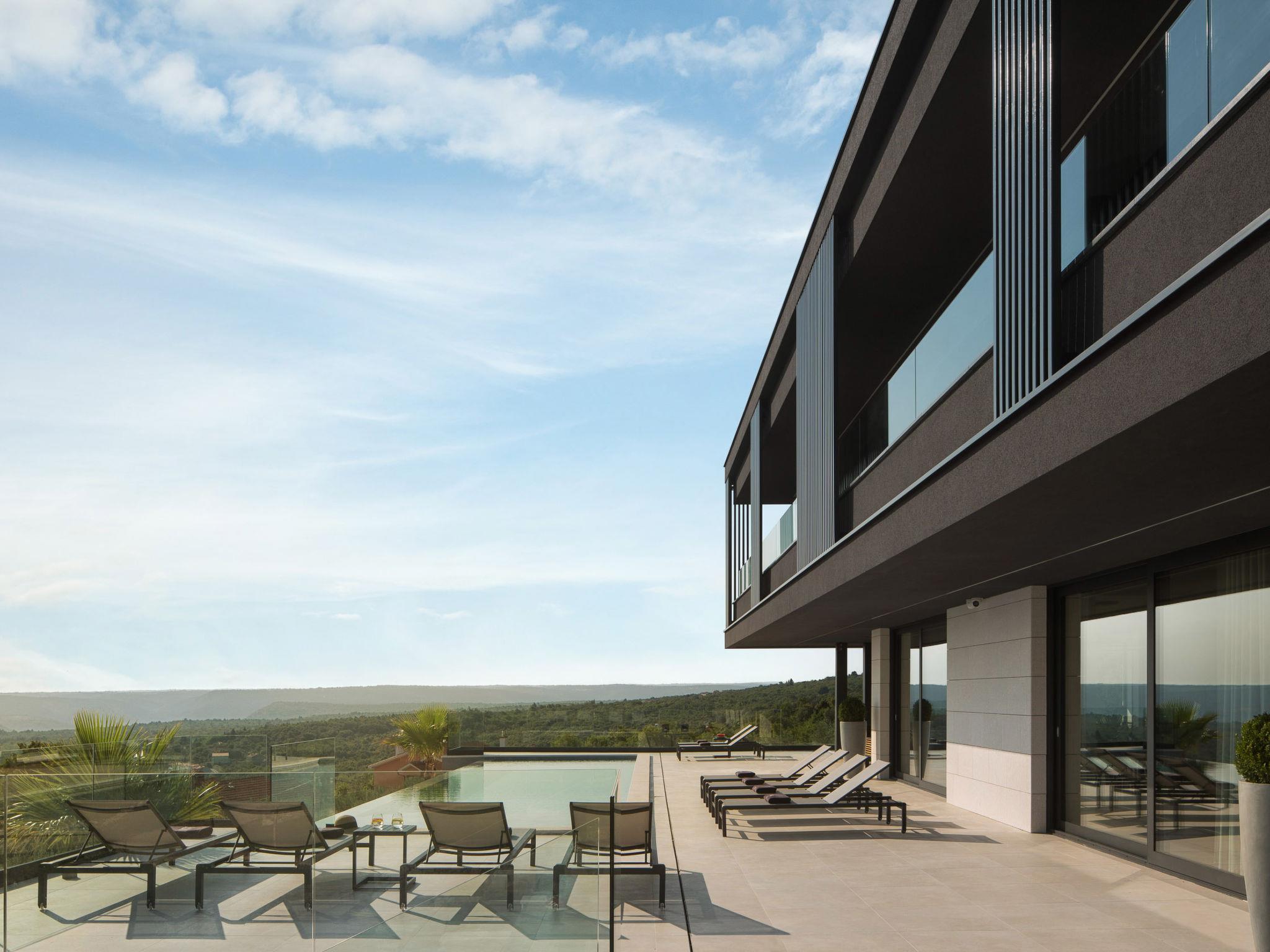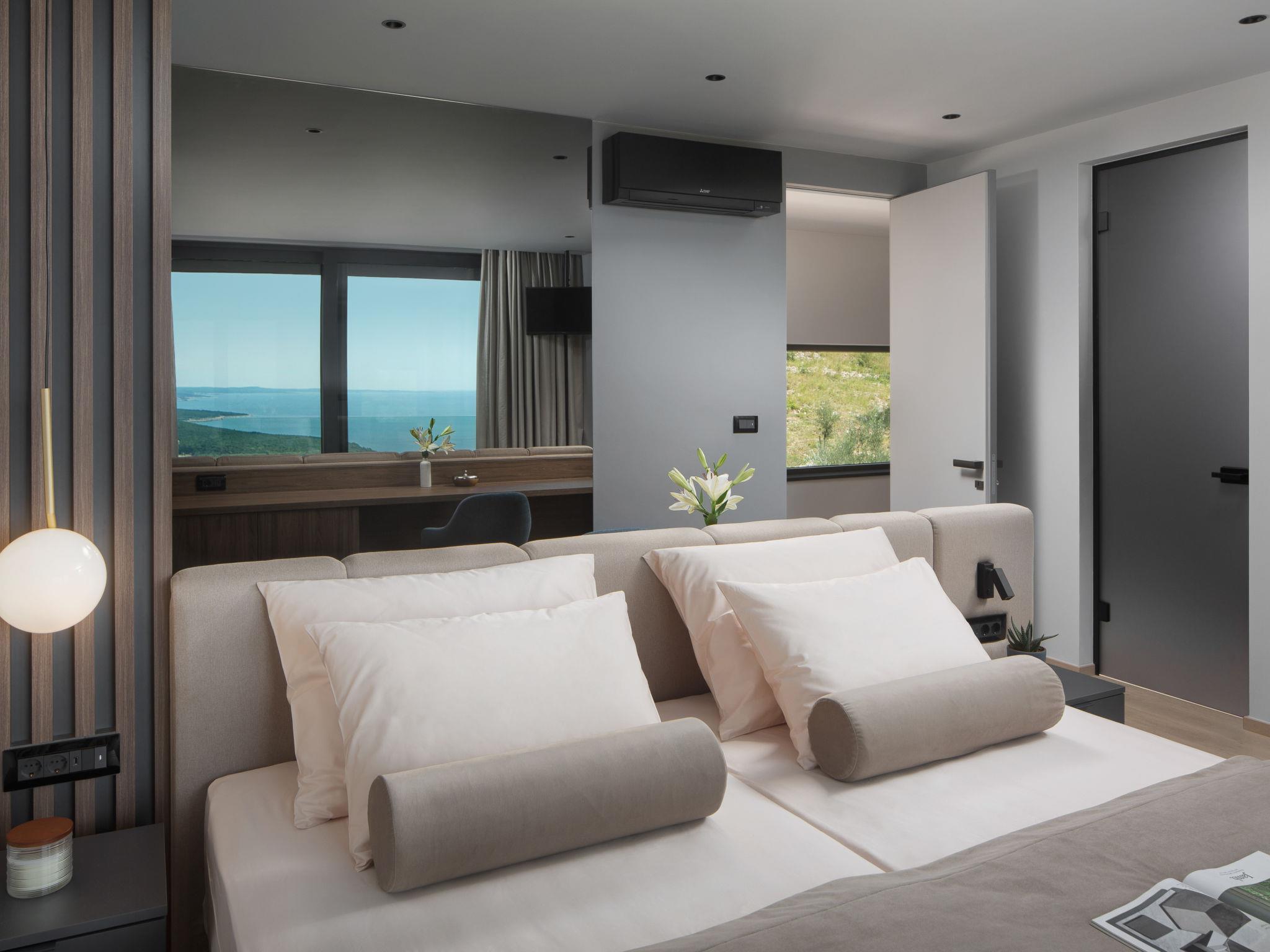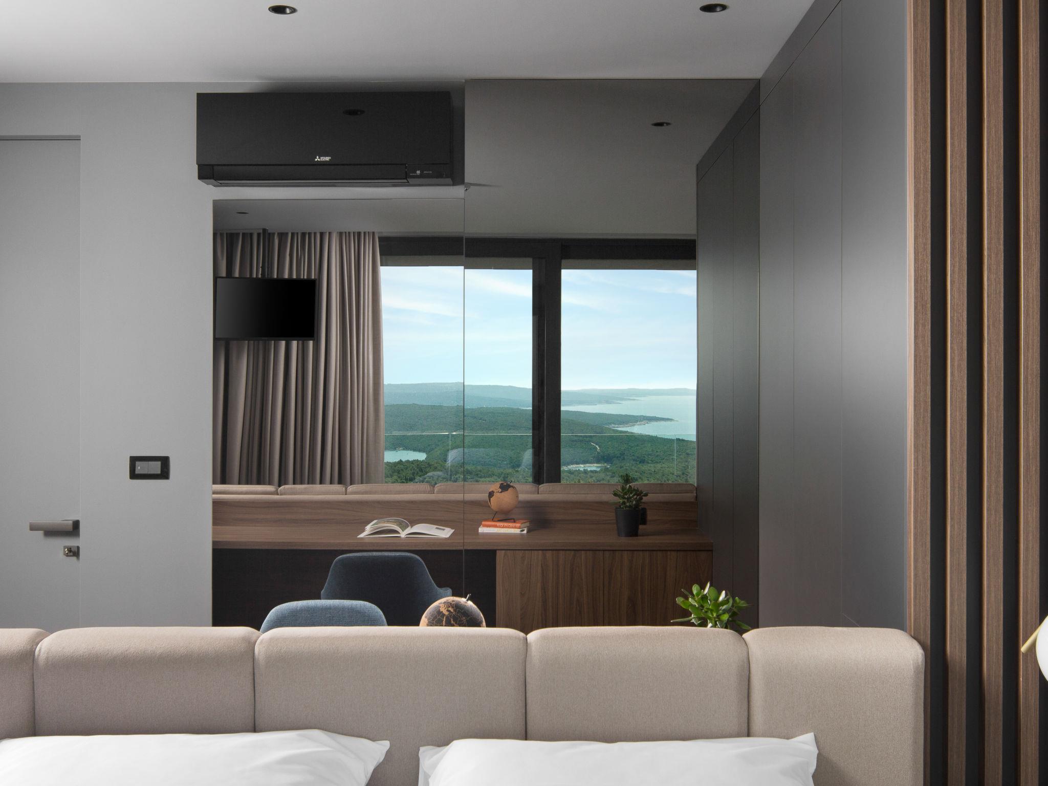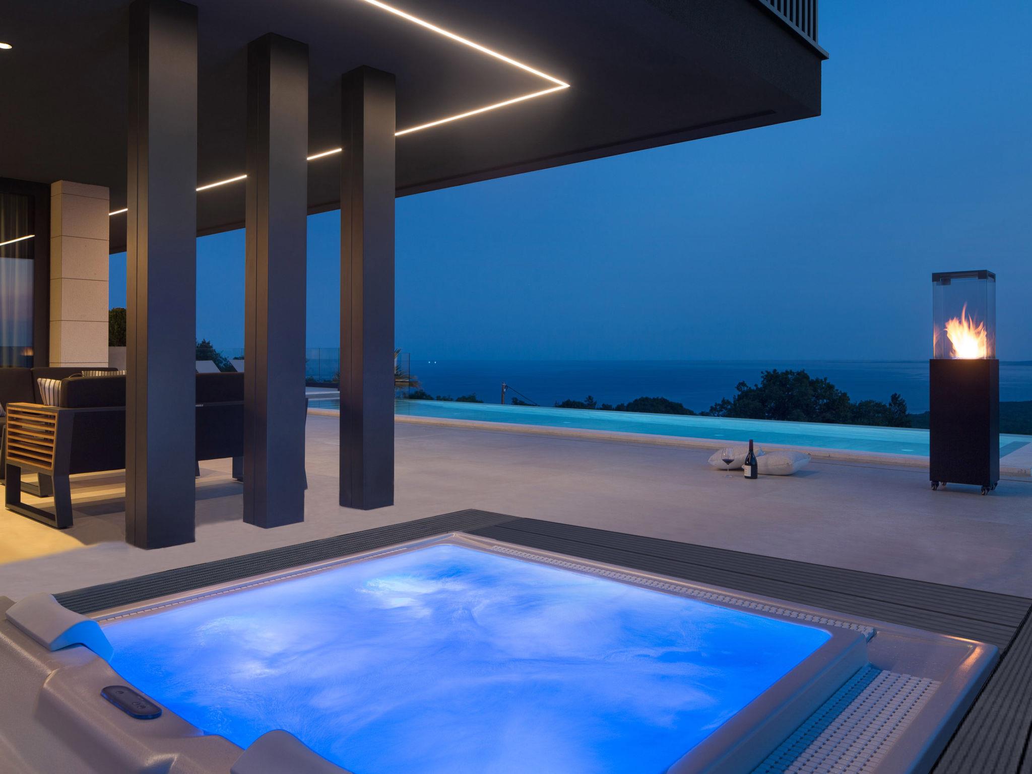 Koromacno 15 km from Labin: Very luxurious villa "Panoramica", 2 storeys, surrounded by trees and fields. In the hamlet Viškovici 15 km from the centre of Labin, in a quiet, sunny, elevated position, 1.1 km from the sea, 1.1 km from the beach. Private: property 8'240 m2 with lawn and trees, swimming pool angular (64 m2, depth 145 cm, seasonal availability: 01.Jan. - 31.Dec.) with internal staircase. Outdoor shower, hot tub, pool house with cooking stove, table tennis, barbecue, children's playground, pool maintenance by the owner/gardener. In the house: internet access, sauna, fitness room, massage (extra). Spa area, billiard table, central heating system, air conditioning, laundry, bicycles available (extra). Available: bicycles (6). Motor access to the house. Parking (for 6 cars) at the house on the premises, single garage. E-charging station. Shop 1 km, restaurant 1 km, bus stop 16.4 km, pebble beach 1.1 km, rocky beach 1.1 km. Marina 1.5 km, surf school 1.5 km.