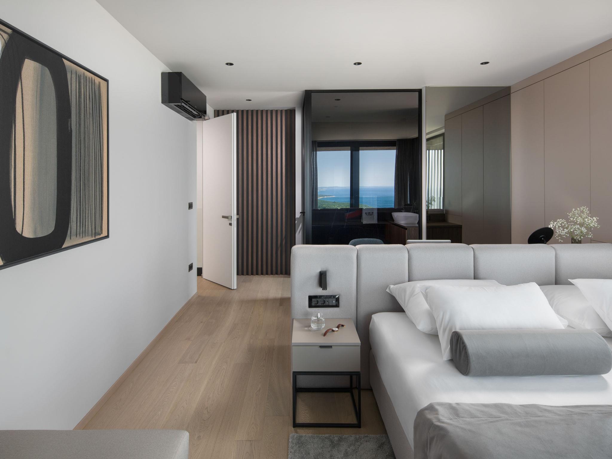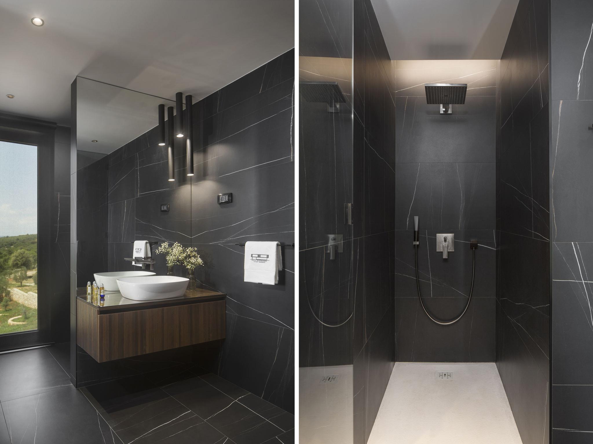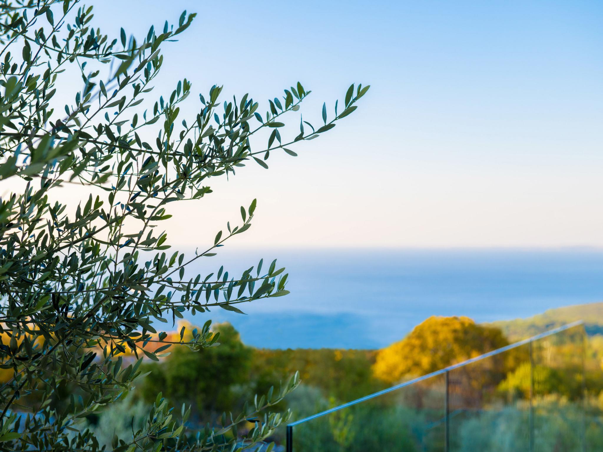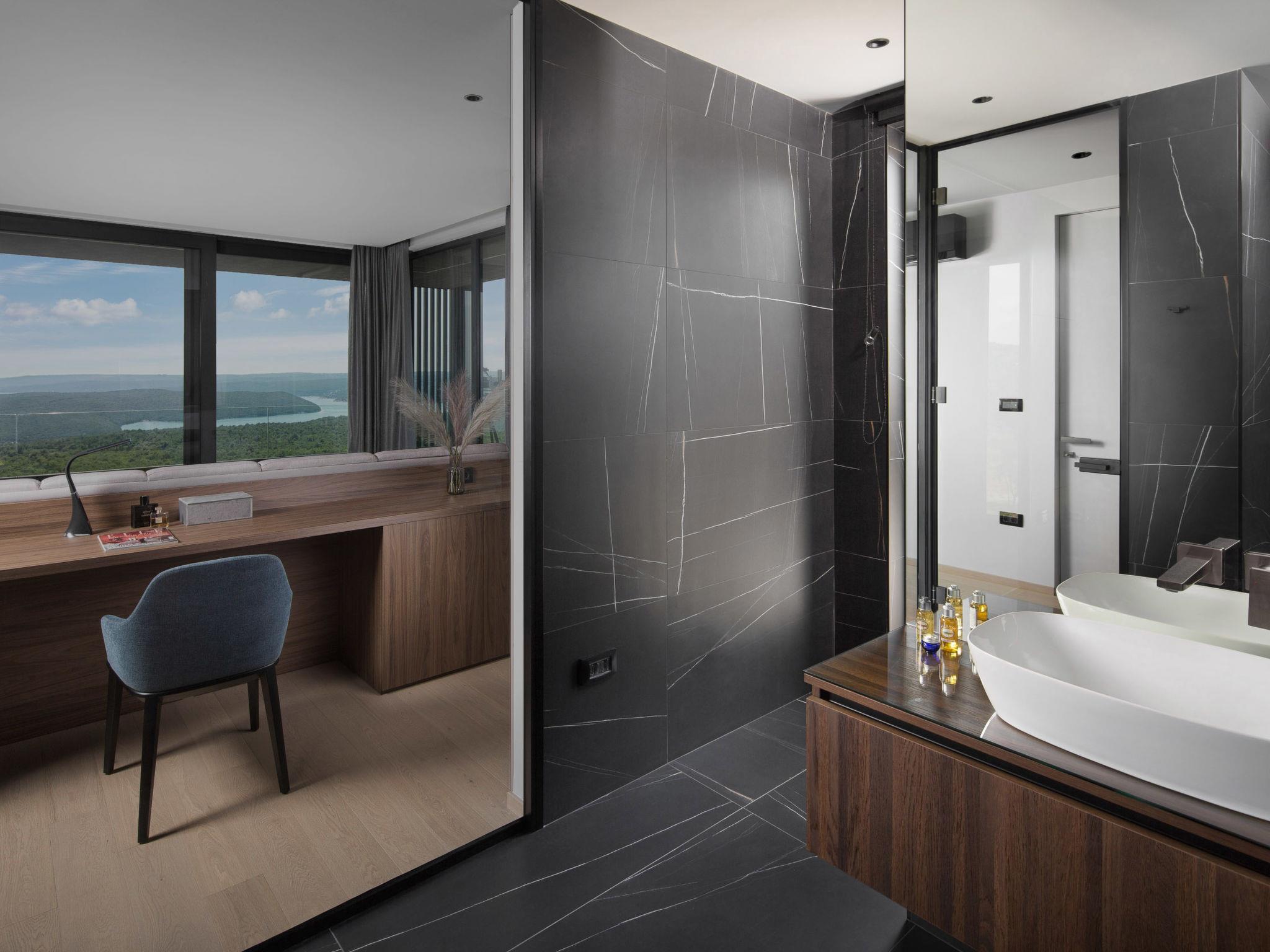 Koromacno 15 km from Labin: Very luxurious villa "Panoramica", 2 storeys, surrounded by trees and fields. In the hamlet Viškovici 15 km from the centre of Labin, in a quiet, sunny, elevated position, 1.1 km from the sea, 1.1 km from the beach. Private: property 8'240 m2 with lawn and trees, swimming pool angular (64 m2, depth 145 cm, seasonal availability: 01.Jan. - 31.Dec.) with internal staircase. Outdoor shower, hot tub, pool house with cooking stove, table tennis, barbecue, children's playground, pool maintenance by the owner/gardener. In the house: internet access, sauna, fitness room, massage (extra). Spa area, billiard table, central heating system, air conditioning, laundry, bicycles available (extra). Available: bicycles (6). Motor access to the house. Parking (for 6 cars) at the house on the premises, single garage. E-charging station. Shop 1 km, restaurant 1 km, bus stop 16.4 km, pebble beach 1.1 km, rocky beach 1.1 km. Marina 1.5 km, surf school 1.5 km.