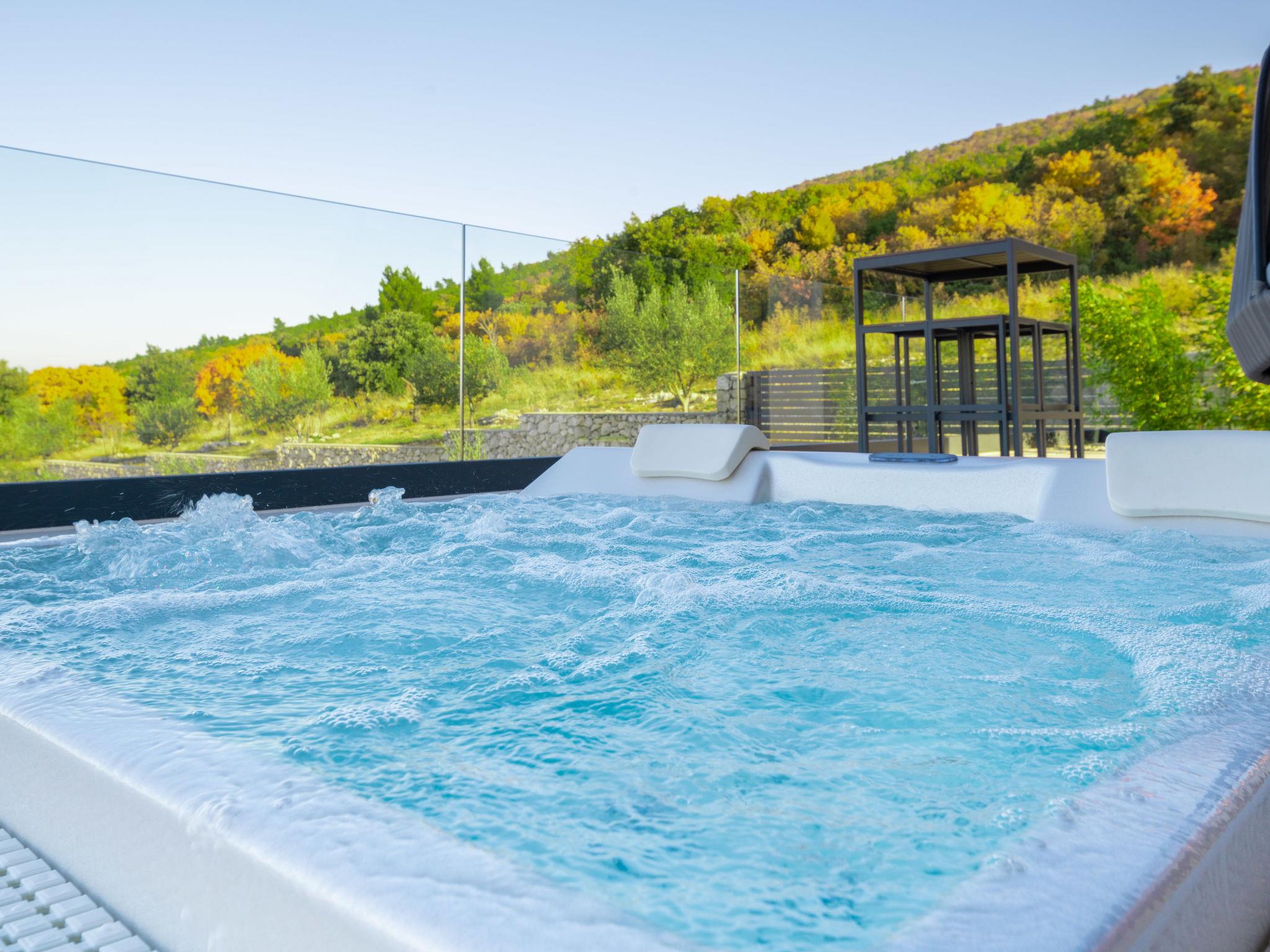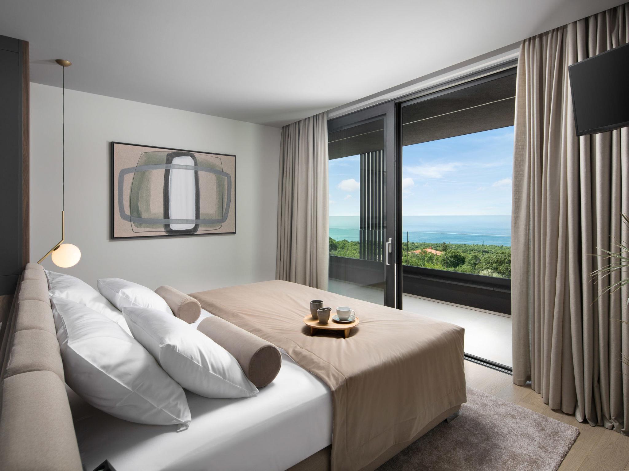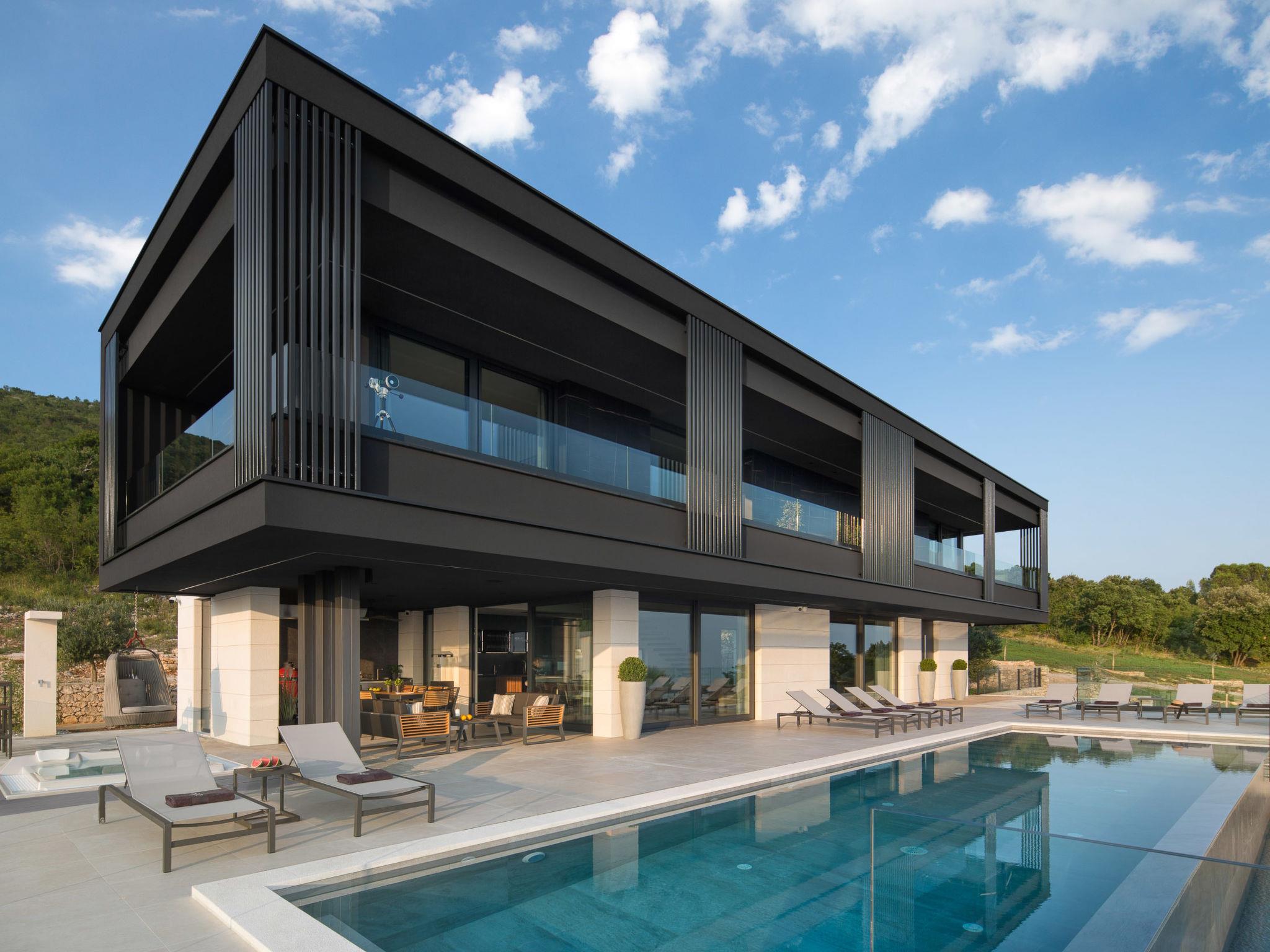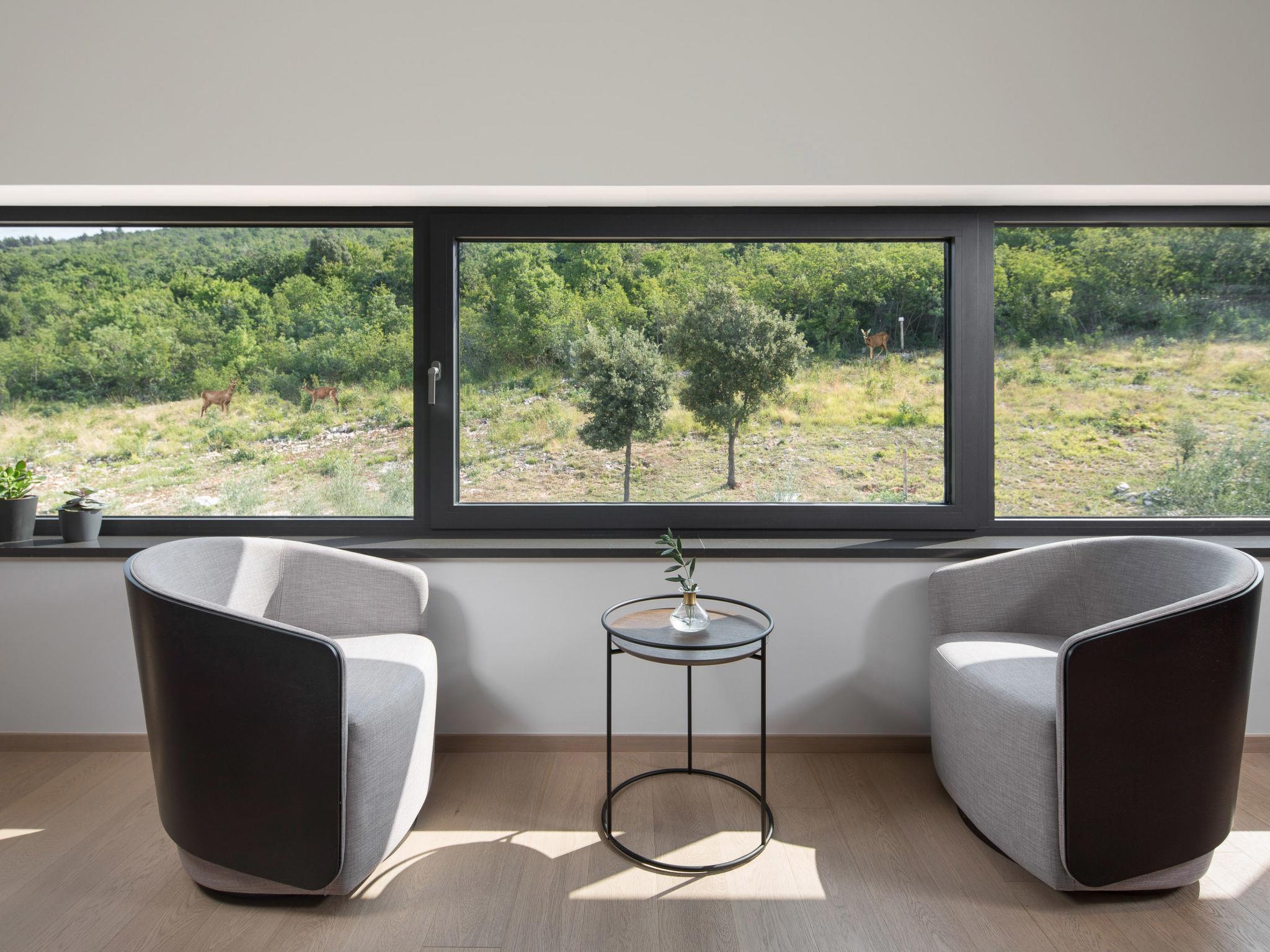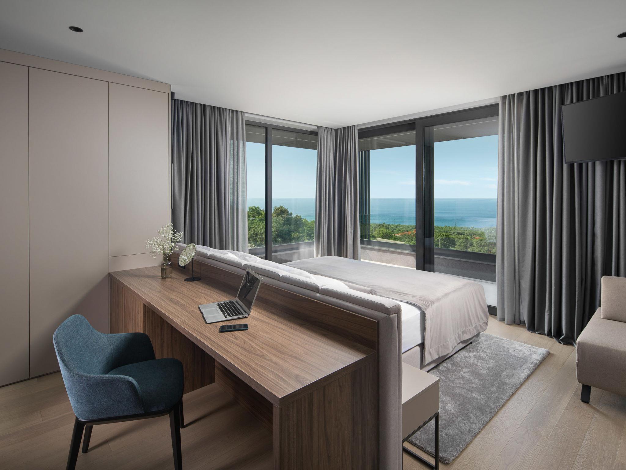 Koromacno 15 km from Labin: Very luxurious villa "Panoramica", 2 storeys, surrounded by trees and fields. In the hamlet Viškovici 15 km from the centre of Labin, in a quiet, sunny, elevated position, 1.1 km from the sea, 1.1 km from the beach. Private: property 8'240 m2 with lawn and trees, swimming pool angular (64 m2, depth 145 cm, seasonal availability: 01.Jan. - 31.Dec.) with internal staircase. Outdoor shower, hot tub, pool house with cooking stove, table tennis, barbecue, children's playground, pool maintenance by the owner/gardener. In the house: internet access, sauna, fitness room, massage (extra). Spa area, billiard table, central heating system, air conditioning, laundry, bicycles available (extra). Available: bicycles (6). Motor access to the house. Parking (for 6 cars) at the house on the premises, single garage. E-charging station. Shop 1 km, restaurant 1 km, bus stop 16.4 km, pebble beach 1.1 km, rocky beach 1.1 km. Marina 1.5 km, surf school 1.5 km.