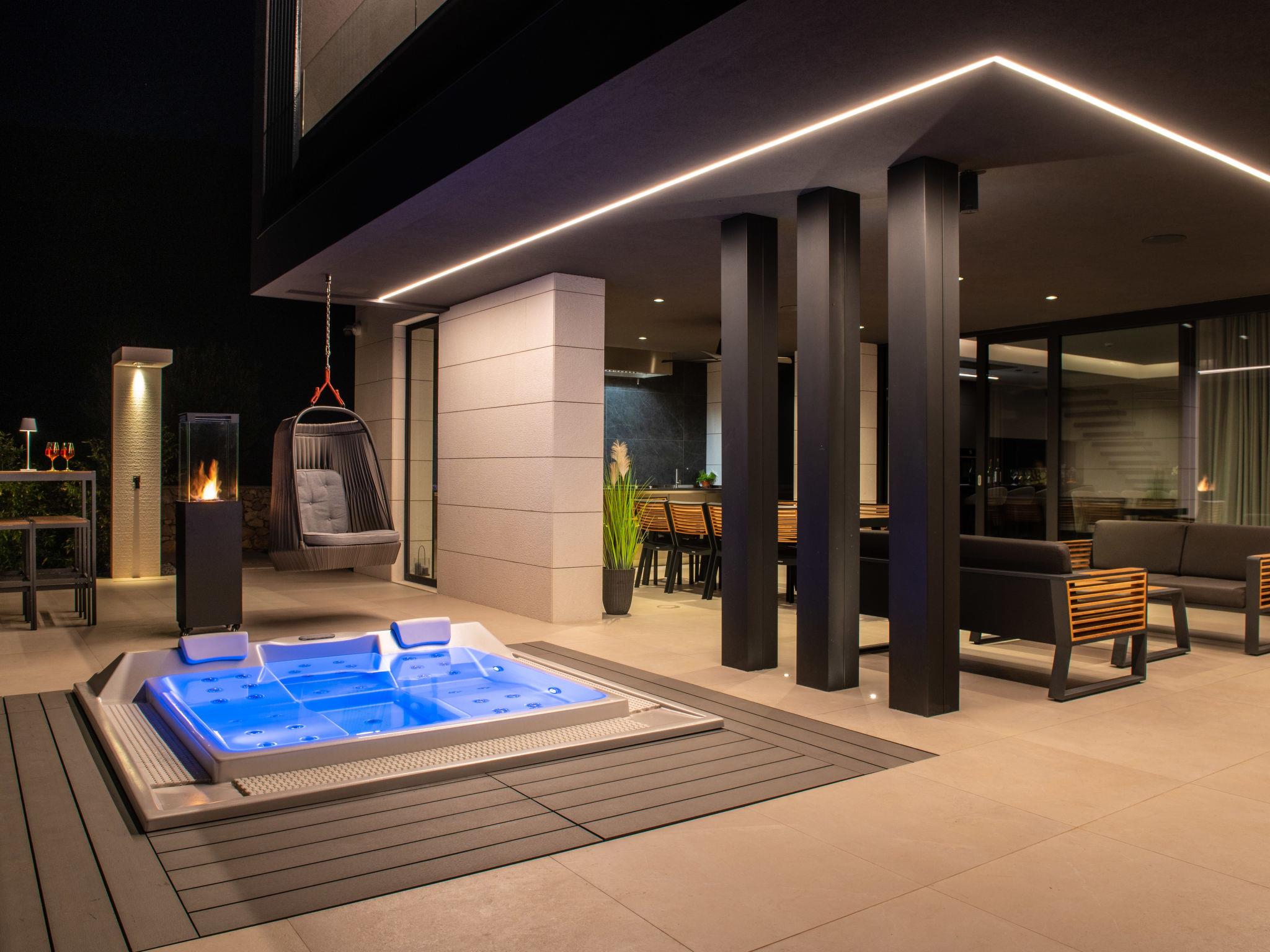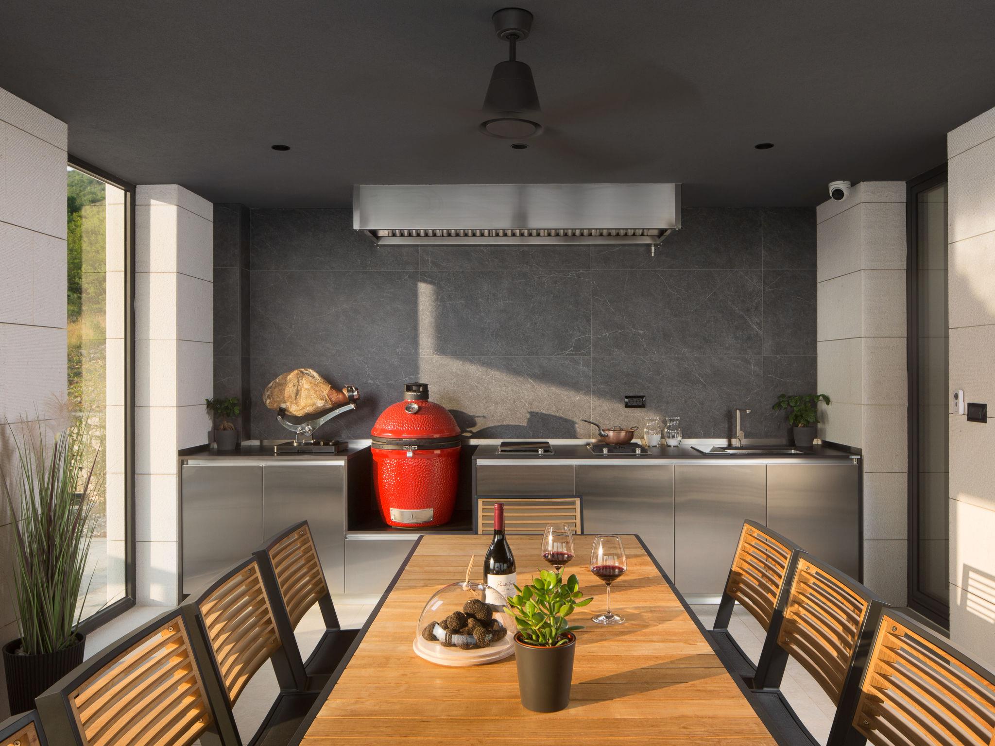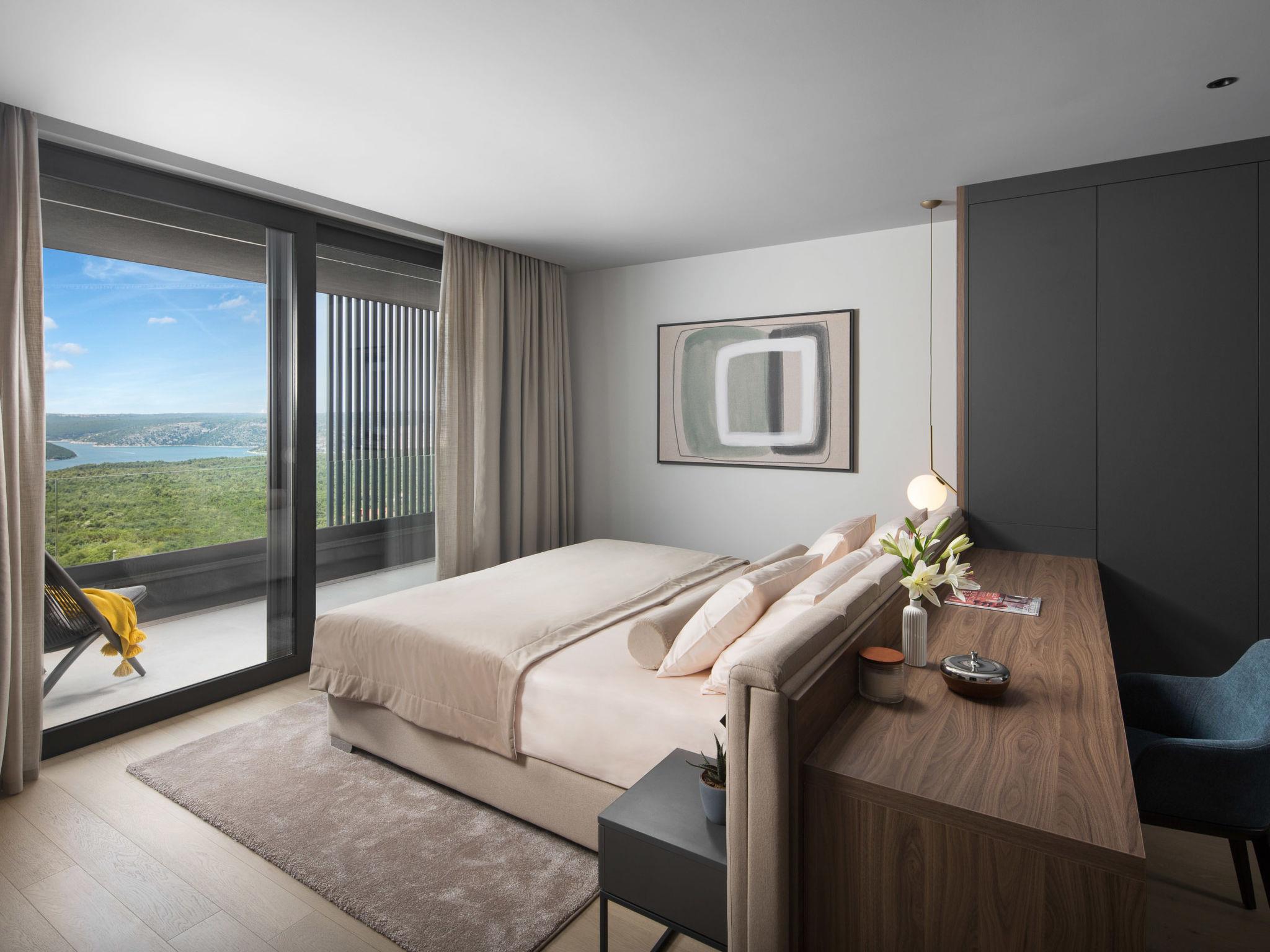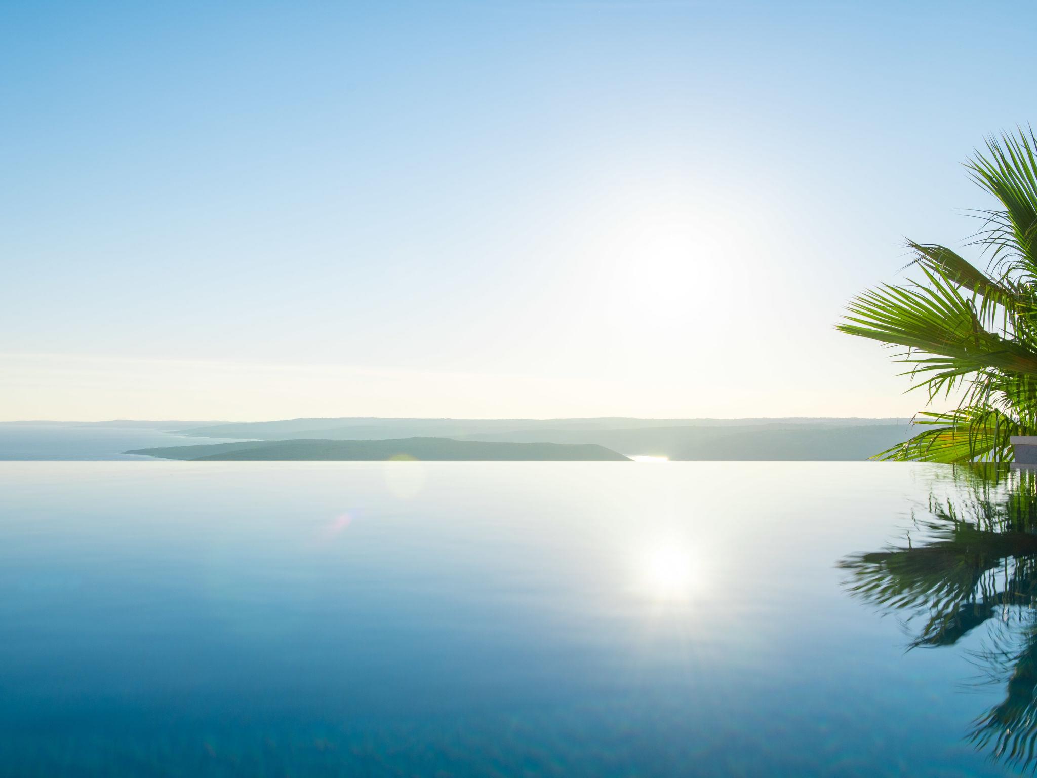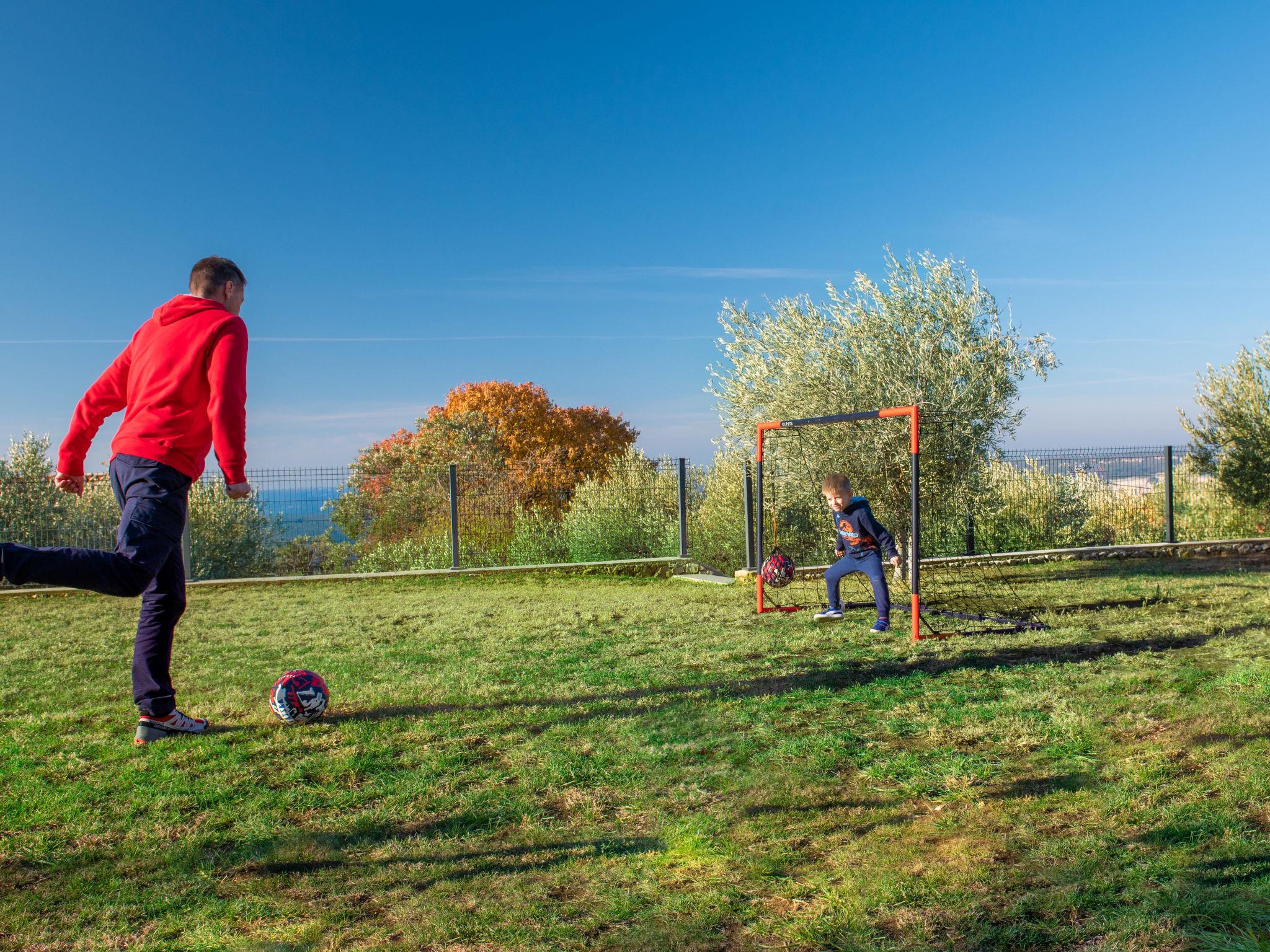 Koromacno 15 km from Labin: Very luxurious villa "Panoramica", 2 storeys, surrounded by trees and fields. In the hamlet Viškovici 15 km from the centre of Labin, in a quiet, sunny, elevated position, 1.1 km from the sea, 1.1 km from the beach. Private: property 8'240 m2 with lawn and trees, swimming pool angular (64 m2, depth 145 cm, seasonal availability: 01.Jan. - 31.Dec.) with internal staircase. Outdoor shower, hot tub, pool house with cooking stove, table tennis, barbecue, children's playground, pool maintenance by the owner/gardener. In the house: internet access, sauna, fitness room, massage (extra). Spa area, billiard table, central heating system, air conditioning, laundry, bicycles available (extra). Available: bicycles (6). Motor access to the house. Parking (for 6 cars) at the house on the premises, single garage. E-charging station. Shop 1 km, restaurant 1 km, bus stop 16.4 km, pebble beach 1.1 km, rocky beach 1.1 km. Marina 1.5 km, surf school 1.5 km.