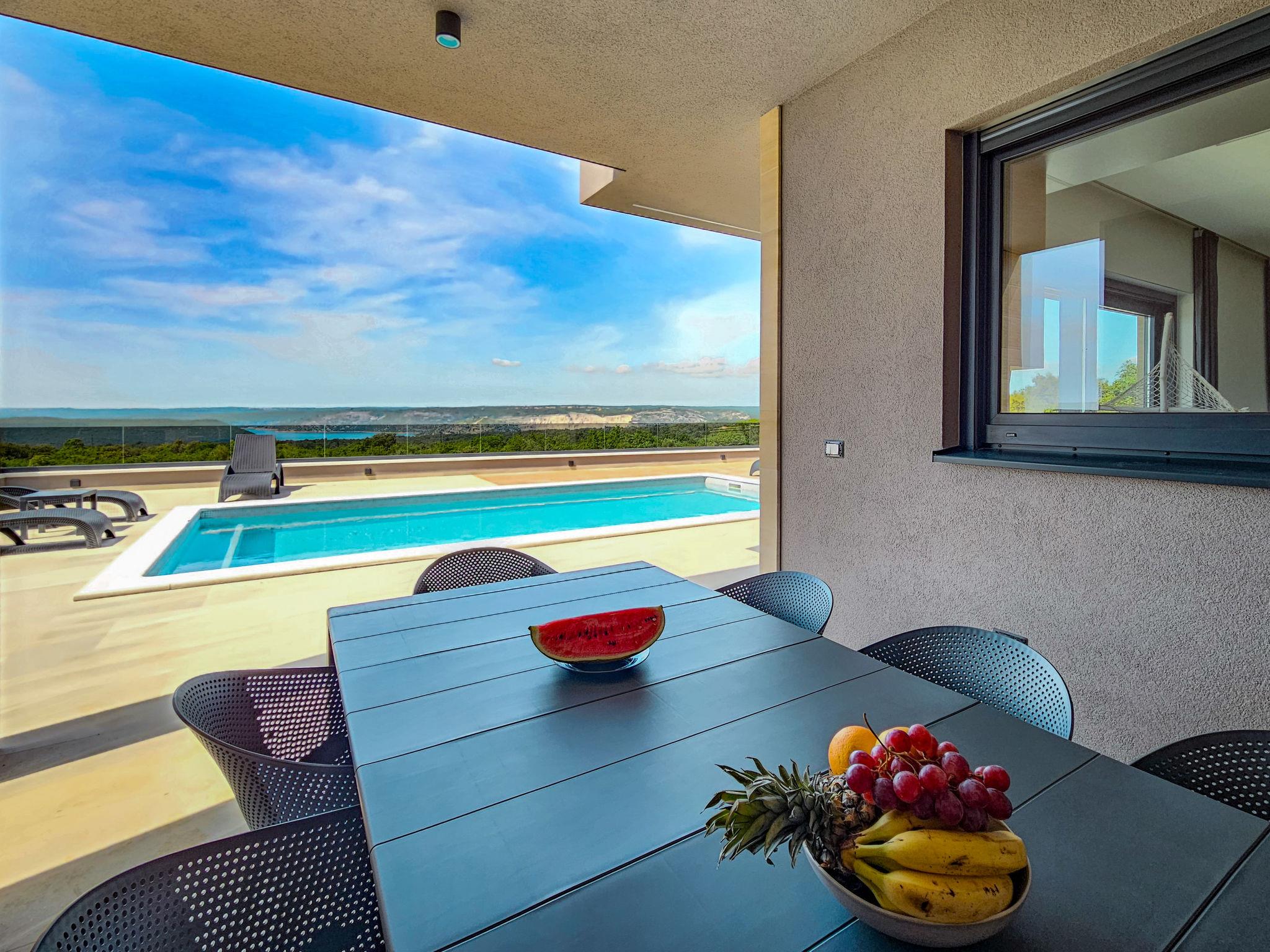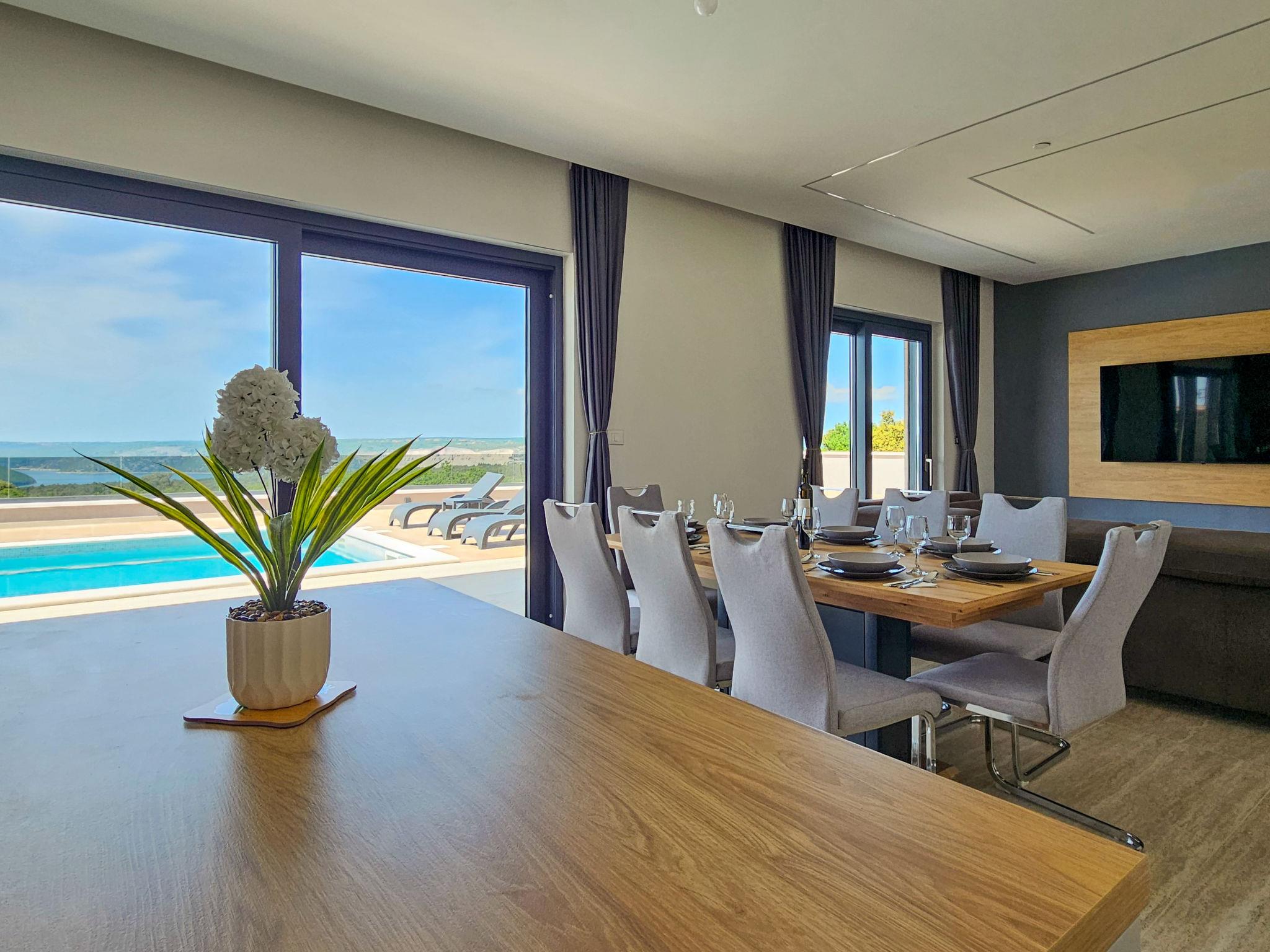 5-room villa 170 m2 on 2 levels. Living/dining room with satellite TV (flat screen), air conditioning. Exit to the terrace, to the swimming pool. 1 small room with 1 sofabed (140 cm, length 200 cm). Open kitchen (oven, dishwasher, 4 induction hot plates, toaster, kettle, freezer, electric coffee machine). Exit to the swimming pool. Sep. WC. Upper floor: 3 rooms, each room with 1 french bed (160 cm, length 200 cm), shower/WC and satellite TV (flat screen), air conditioning. Exit to the terrace. Terrace 12 m2, roofed. Terrace furniture. Beautiful view of the sea. Facilities: children's high chair, hair dryer. Internet (WiFi, free).