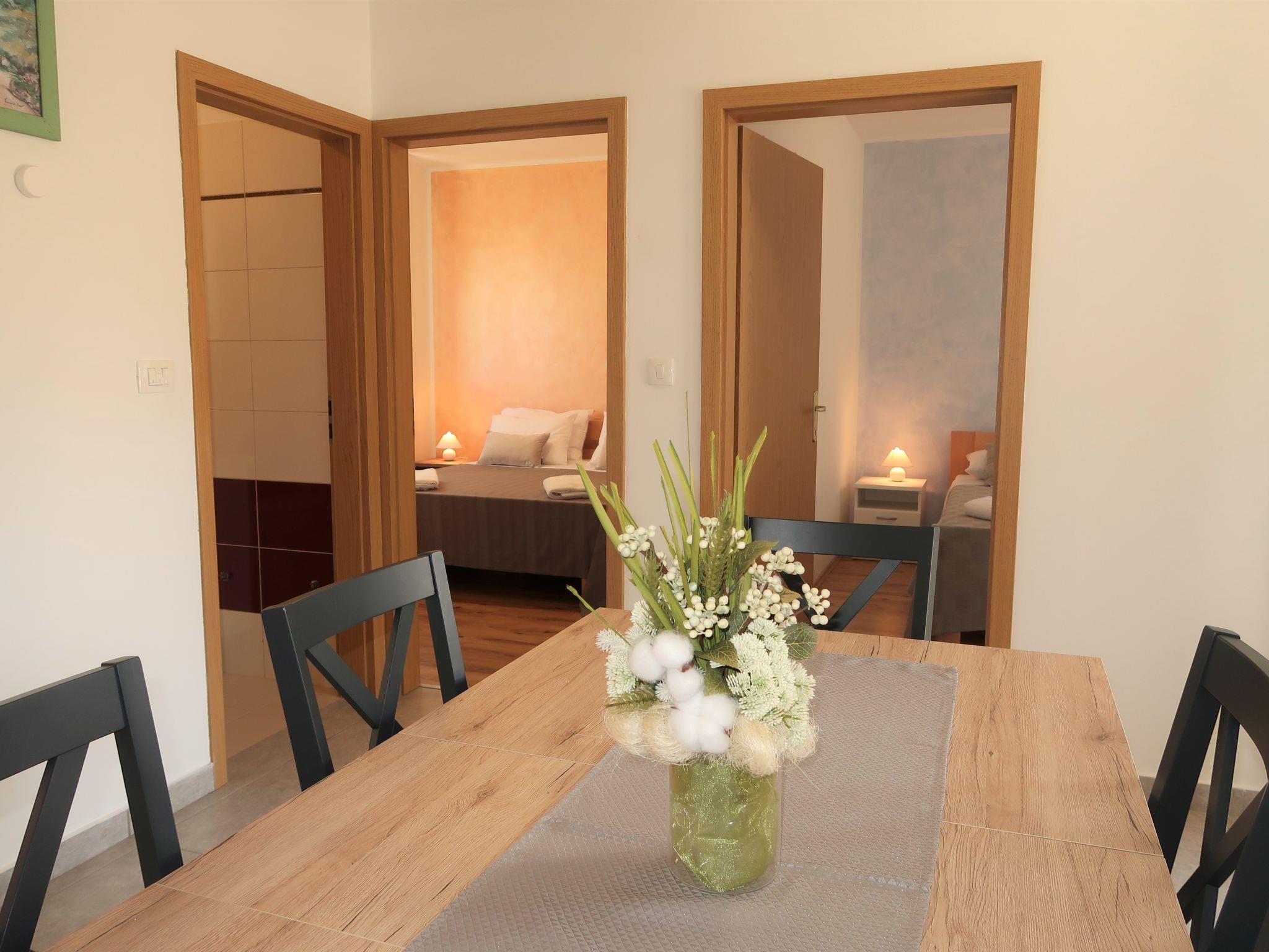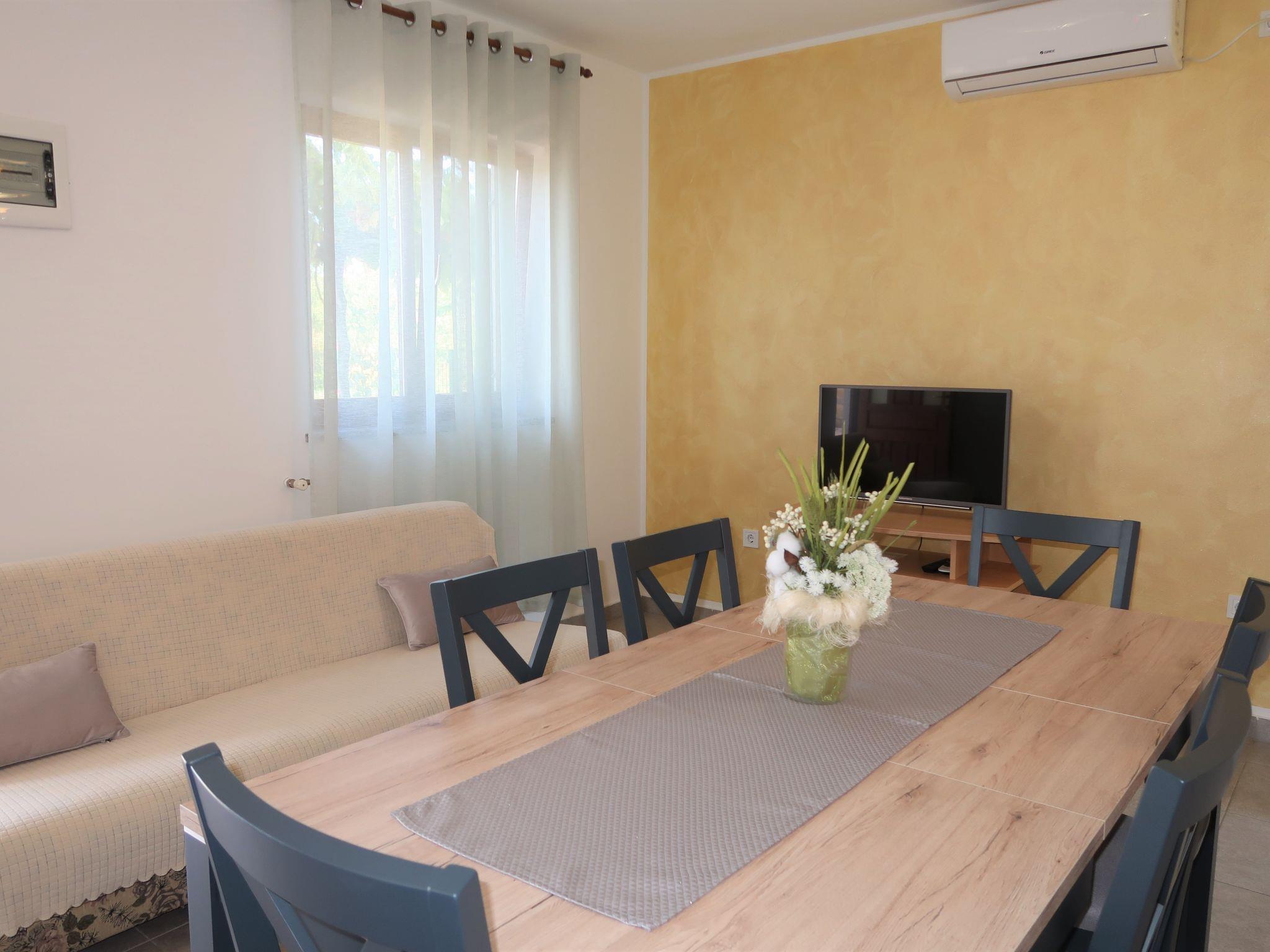 3-room house 56 m2. Living/dining room with 1 sofabed, satellite TV and air conditioning. Exit to the terrace. 1 room with 1 french bed. 1 room with 2 beds. Open kitchen (2 hot plates, oven, dishwasher, 2 gas rings, toaster, kettle, microwave, freezer, electric coffee machine). Shower/WC. No heating option. Terrace 40 m2 partly roofed. Barbecue (portable), deck chairs (4). Facilities: washing machine. Internet (WiFi, free). Please note: non-smoking house. Maximum 1 pet/ dog allowed.