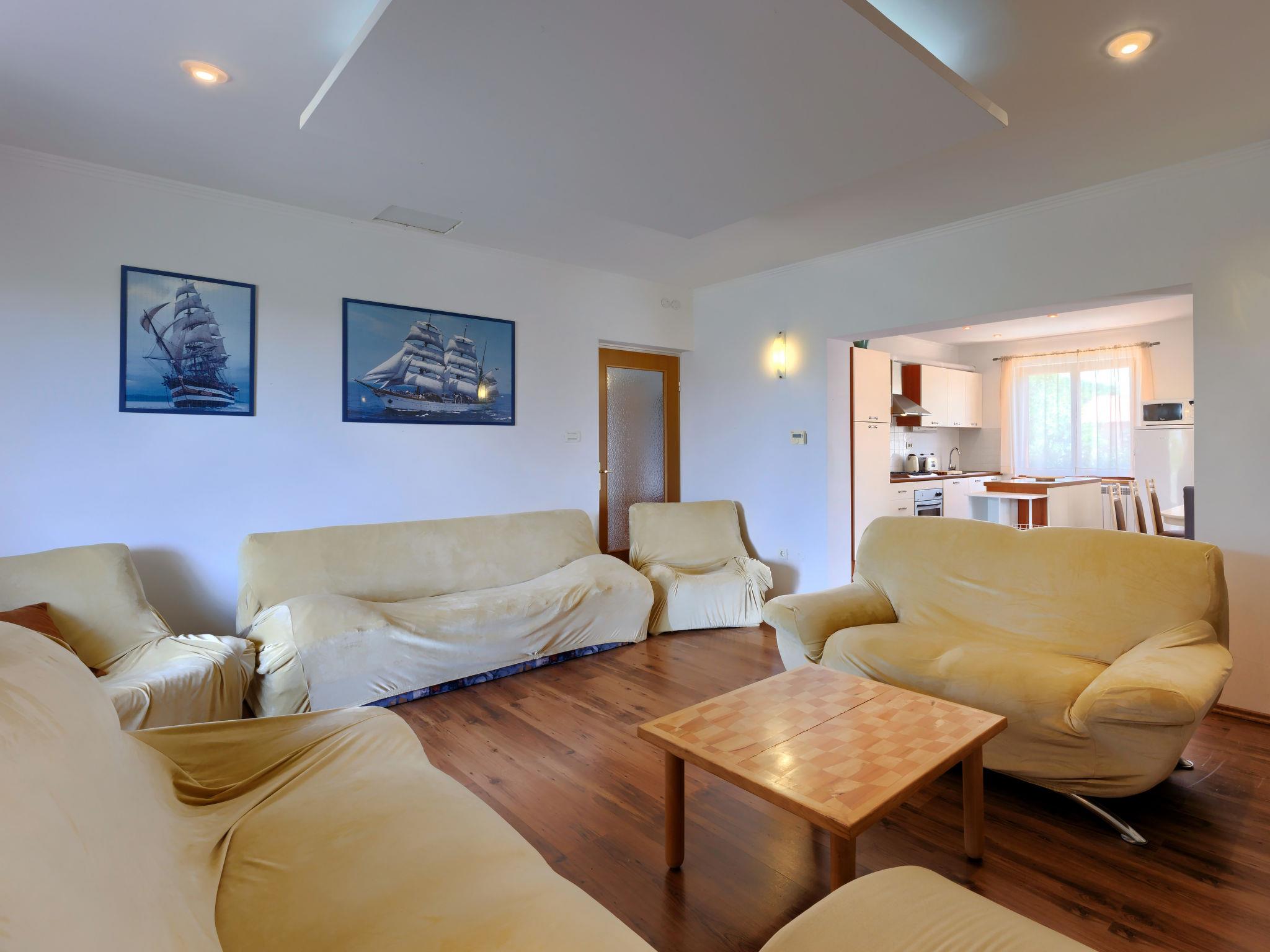 "Laura", 4-room apartment 120 m2, on the ground floor. Living/dining room with satellite TV (flat screen), air conditioning. Exit to the terrace. 1 room with 1 double bed. 1 room with 1 bed and 1 double bed. Exit to the balcony. 1 room with 1 bed and 1 double bed. Open kitchen (4 hot plates, oven, dishwasher, toaster, kettle, freezer, electric coffee machine). Shower/WC, bath/shower/WC. Balcony, terrace 16 m2 partly roofed, terrace 10 m2. Terrace furniture, deck chairs, box-room. Facilities: washing machine, iron, children's high chair. Internet (WiFi, free). Please note: non-smokers only. Maximum 2 pets/ dogs allowed.