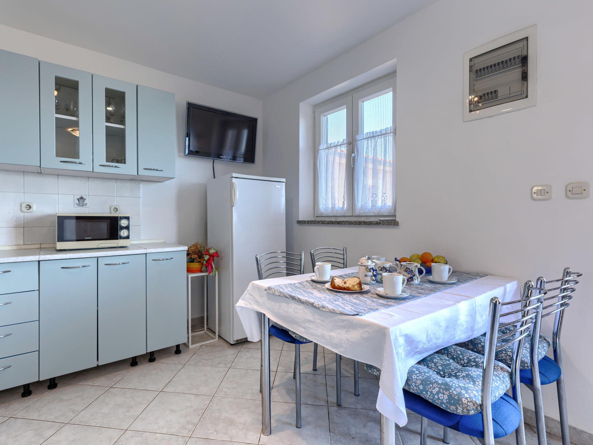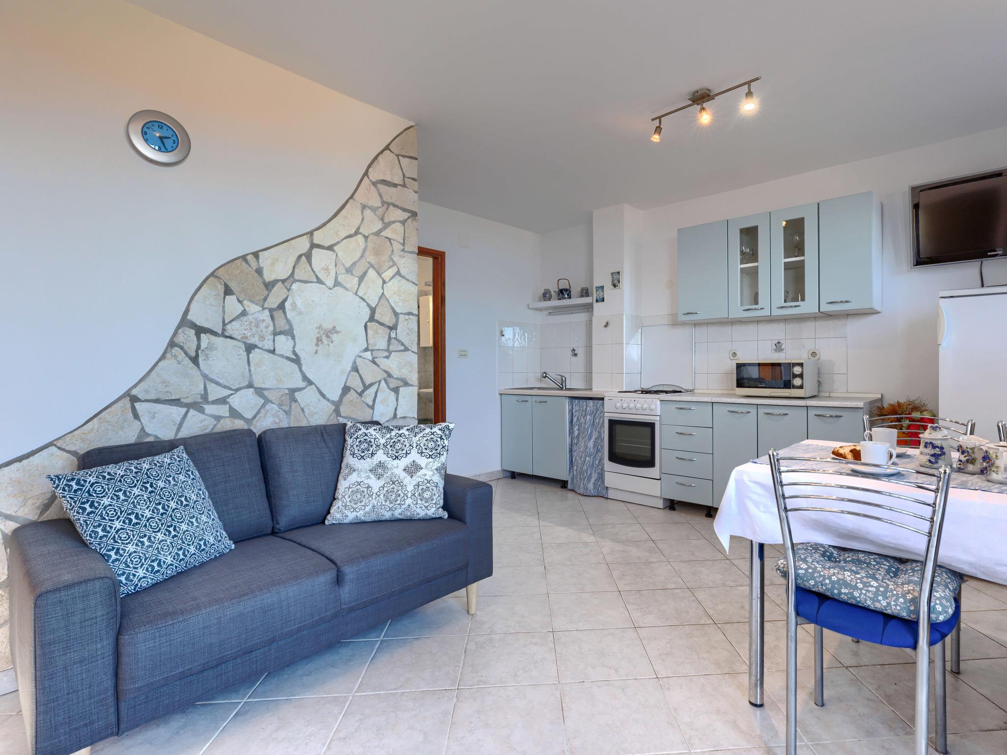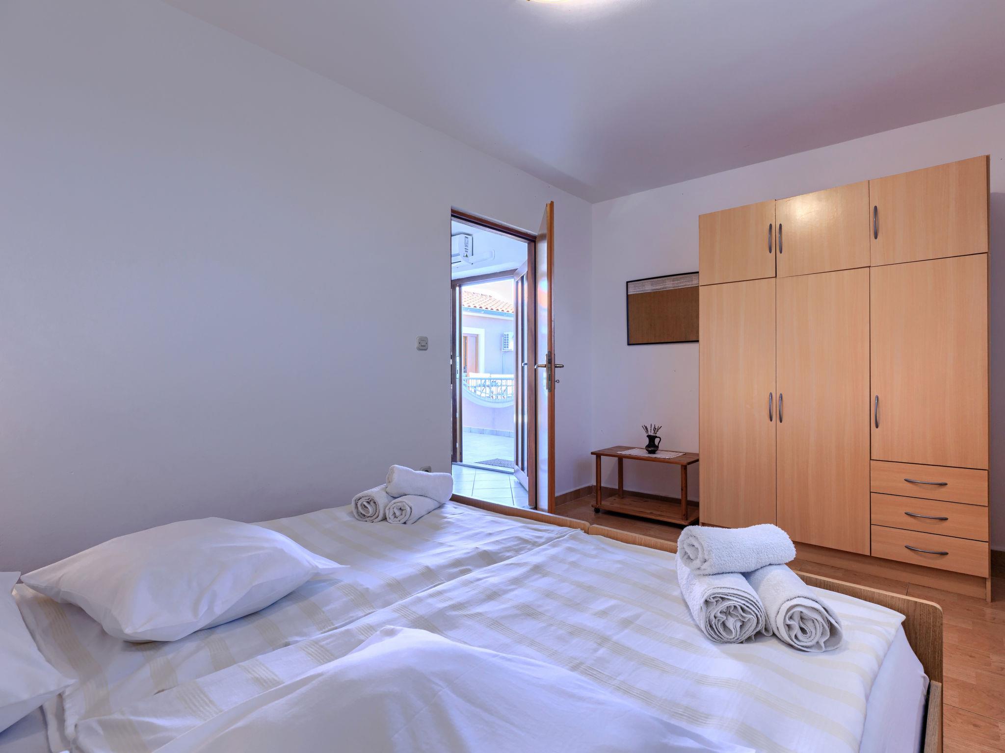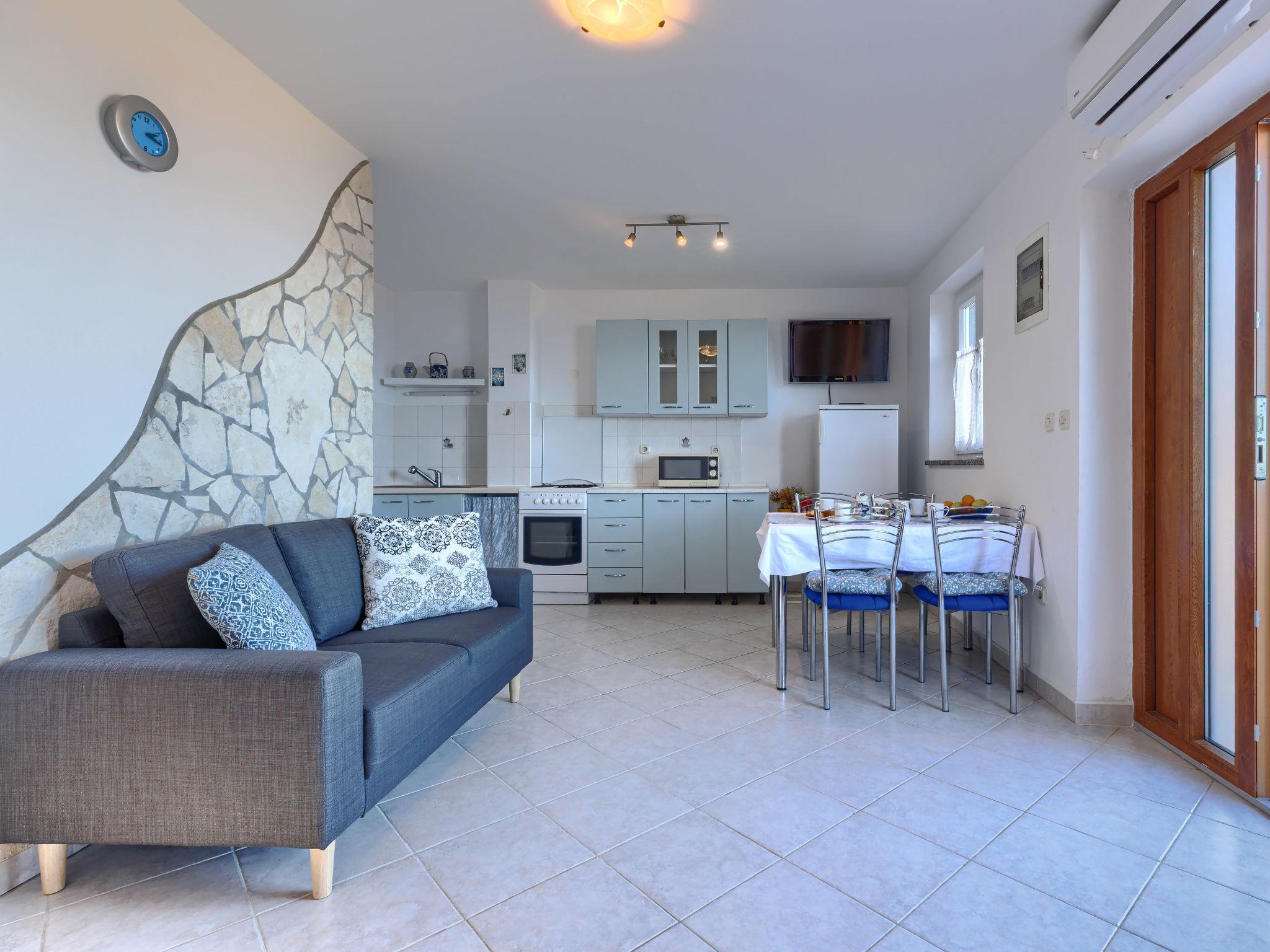 "Teo", 3-room apartment 56 m2 on 1st floor. Living/dining room with satellite TV and air conditioning. Exit to the terrace. 2 rooms, each room with 2 beds. Open kitchen (4 hot plates, oven, toaster, kettle, microwave, freezer, electric coffee machine). Shower/WC. No heating option. Terrace 15 m2. Terrace furniture, deck chairs (2). View of the sea. Facilities: mosquito net. Internet (WiFi, free). Please note: non-smoking house.