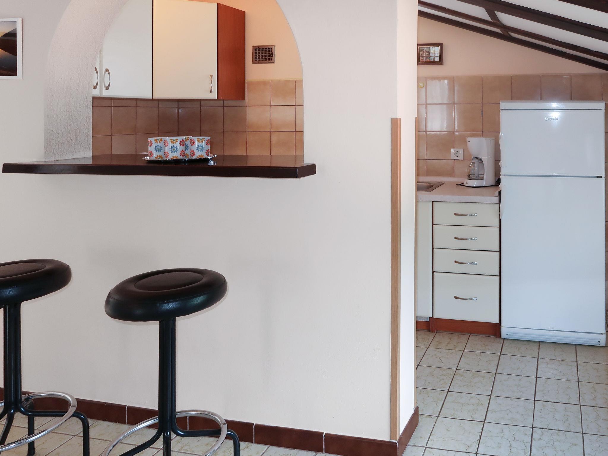 "Violetta", 2-room apartment 56 m2, on the top floor. Living/sleeping room with sloping ceilings with 2 beds, satellite TV and air conditioning. Exit to the terrace. 1 room with sloping ceilings with 1 double bed. With sloping ceilings, open kitchen (2 hot plates, oven, 2 gas rings, toaster, kettle, freezer, electric coffee machine). Shower/WC. No heating option. Terrace. Terrace furniture, box-room. View of the sea. Facilities: Internet (WiFi, free). Please note: non-smoking house. Private entrance. Low placed window in the apartment. 2163-07/06-97-2