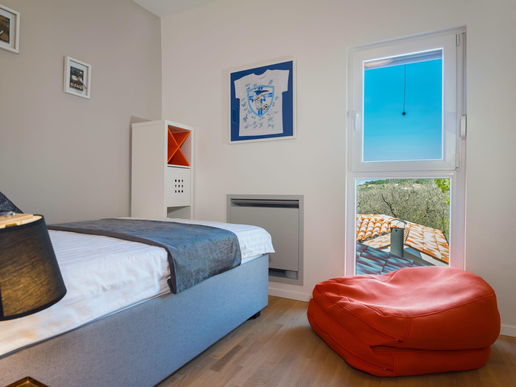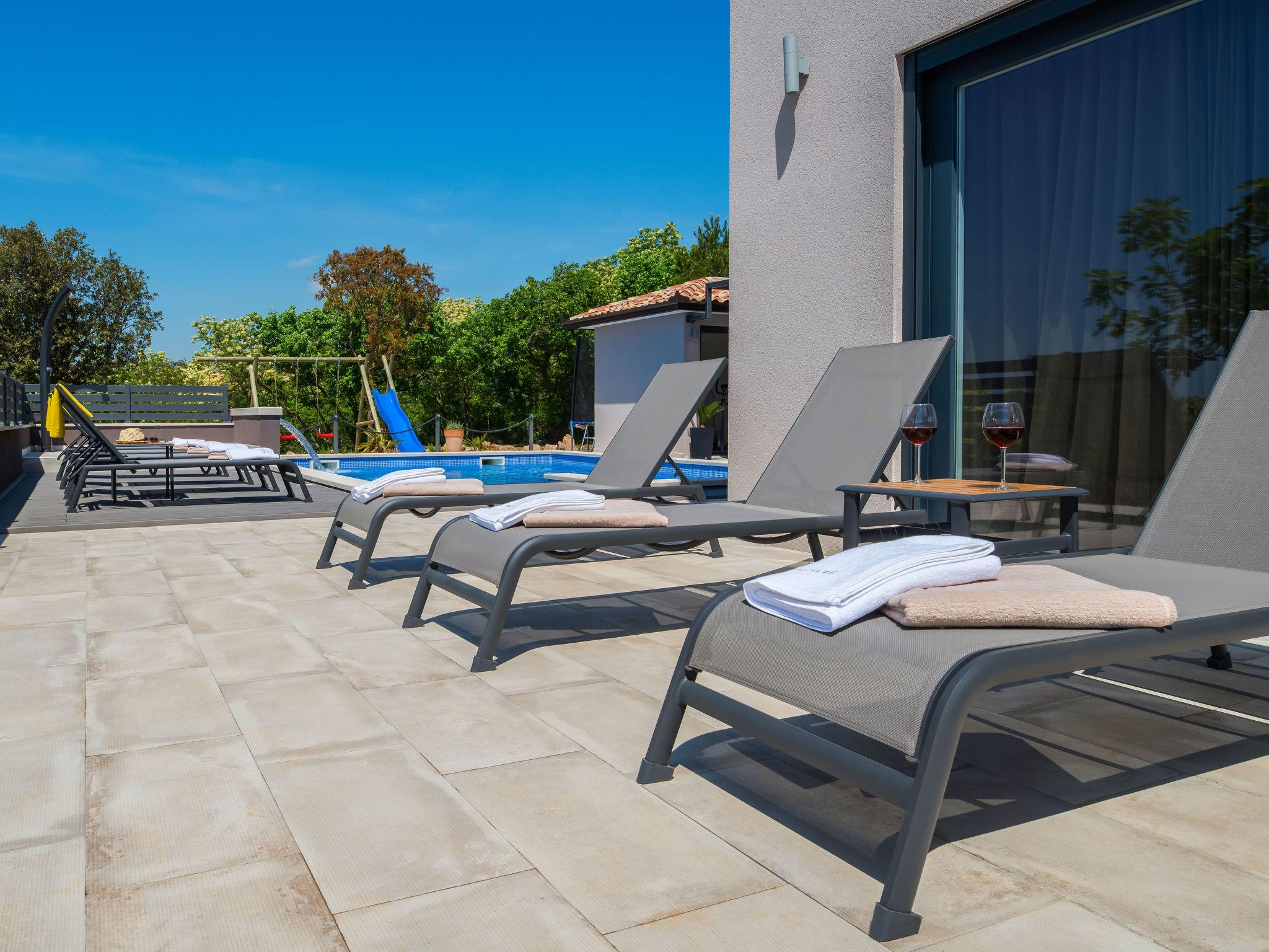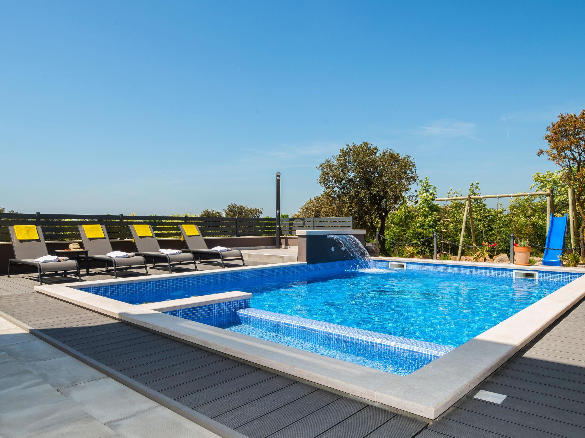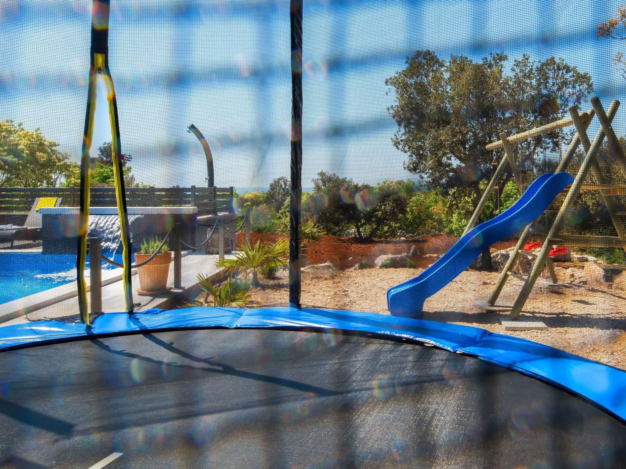 Beautiful villa "A.R.T.", 3 storeys. In the hamlet Viškovici 15 km from the centre of Labin, in a quiet, sunny position, 2 km from the sea, 2 km from the beach. Private: property 2'000 m2 (fenced), garden, swimming pool angular (7 x 5 m, 37 m2, depth 140 cm, seasonal availability: 01.Jul. - 02.Nov.) with internal staircase. Outdoor shower, pool house, basketball, volleyball, garden furniture, barbecue, children's playground (slide, swing). In the house: internet access, sauna, hot tub, relaxation room, spa area, billiard table, trampoline, washing machine. Parking (for 3 cars) at the house on the premises. Shop 3 km, restaurant 3 km, bus stop 16.6 km, sandy beach 2 km pebble beach 2 km. Marina 2 km, walking paths from the house 200 m, cycle lane 250 m. Groups of teenagers on request only. Neighbourhood highly sensitive to noise. Quietness and good behaviour expected. Swimming pool with hydromassage. Private: outdoor kitchen (3 hot plates).