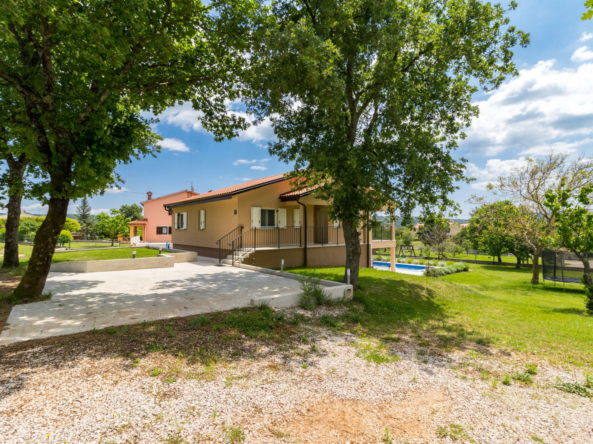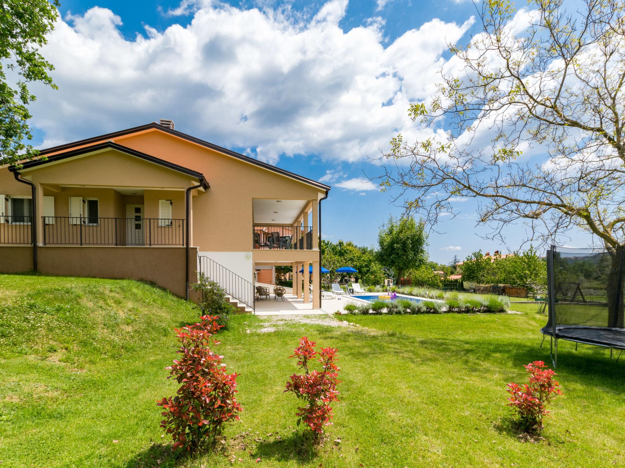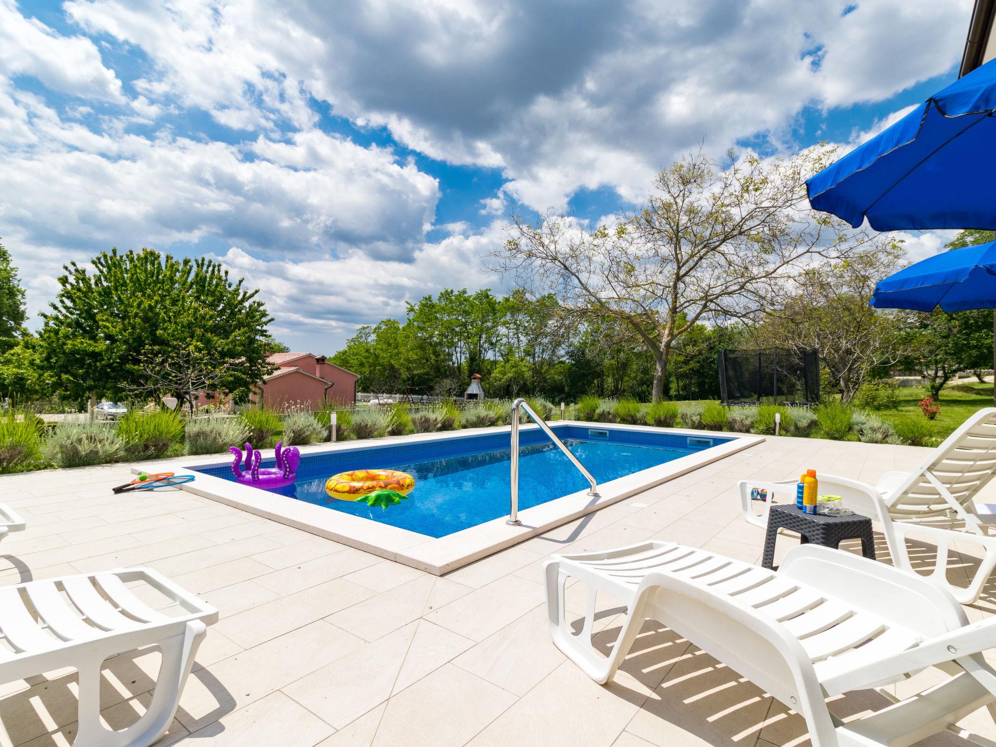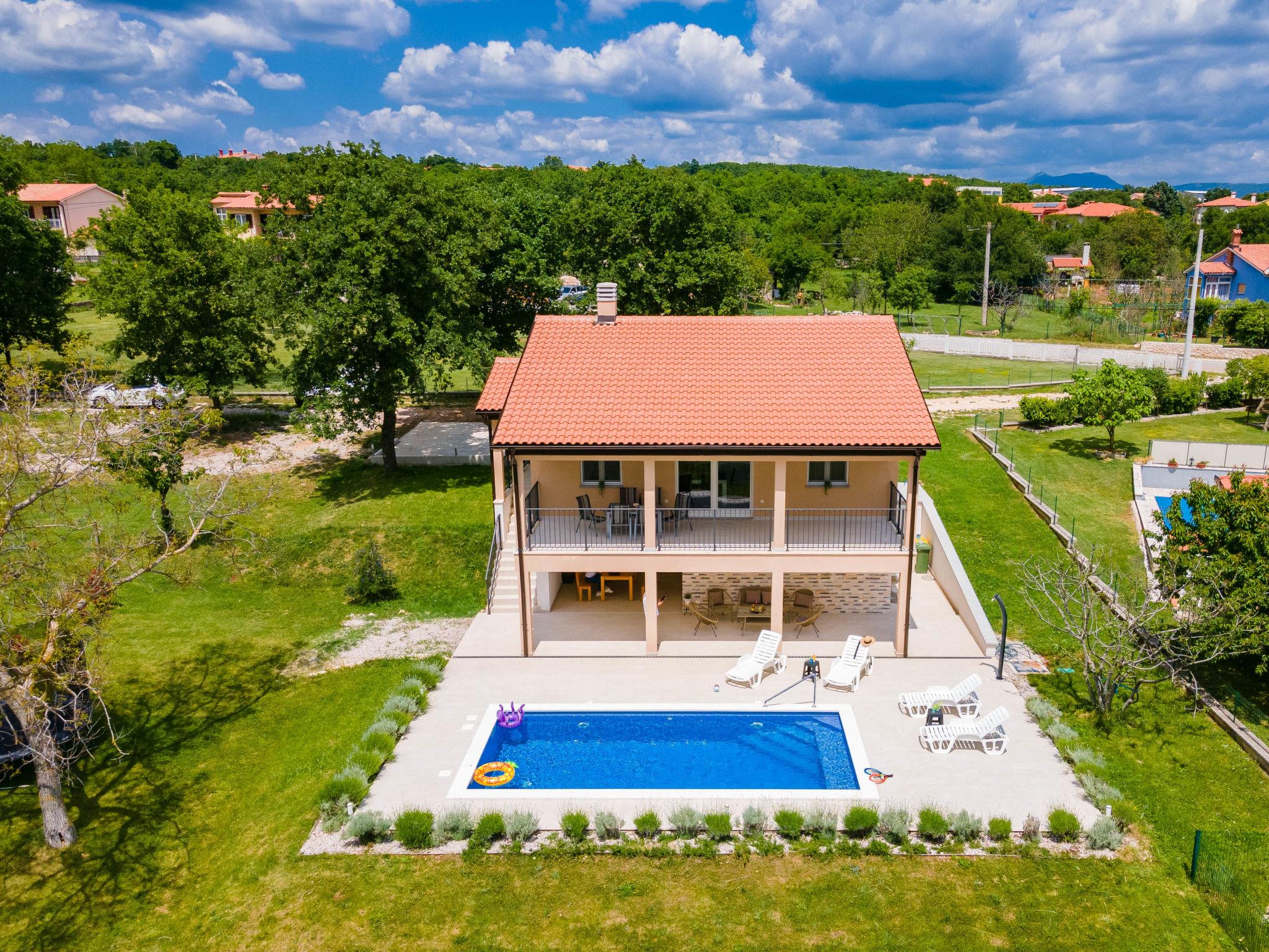 Single-family house "Marina", 2 storeys, built in 2018. In the district of Vinež 1 km from the centre of Labin, 6 km from the centre of Rabac, in the residential district, 6 km from the sea. Private: property 3'000 m2 with lawn and trees, swimming pool (8 x 4 m, depth 135 cm, seasonal availability: 01.May. - 01.Oct.) with internal staircase. Outdoor shower, terrace, garden furniture, barbecue, pool maintenance by the owner/gardener. In the house: internet access, trampoline, washing machine. Motor access to the house (30 m via unmade road). Parking (for 3 cars) on the premises. Shop 200 m, supermarket 1 km, bus stop 2.4 km, pebble beach 6 km. Groups of teenagers on request only.