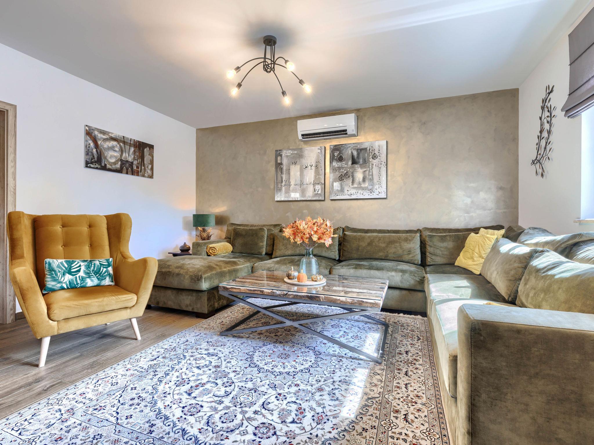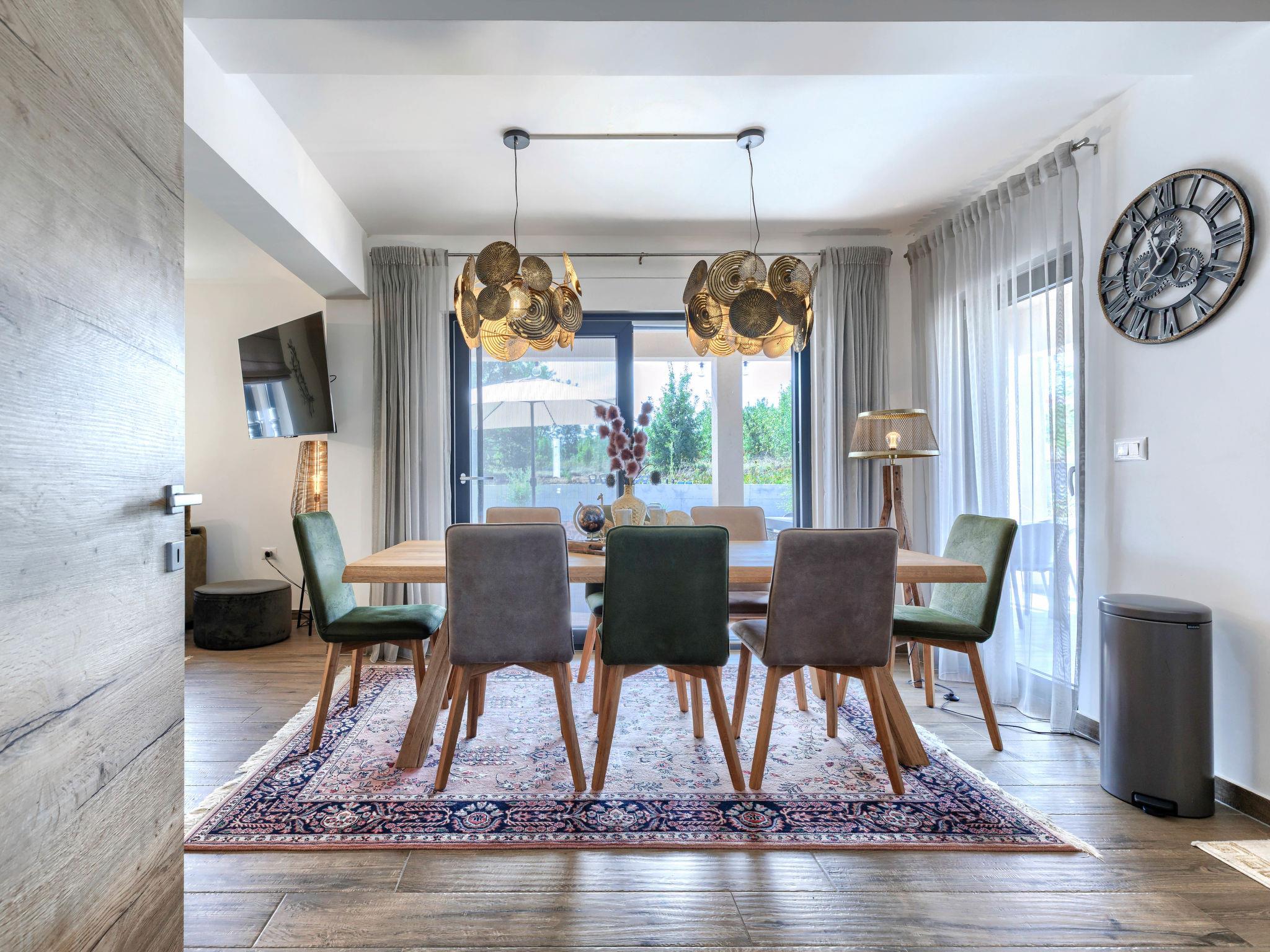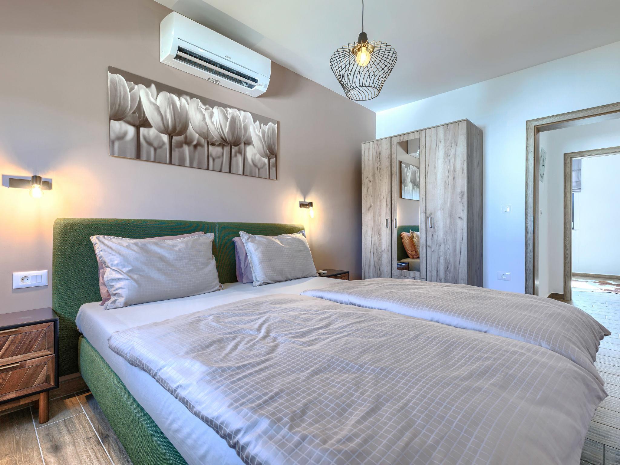 5-room house 150 m2 on 2 levels. Beautiful and cosy furnishings: living/dining room with open-hearth fireplace (only for decoration), satellite TV and air conditioning. Exit to the terrace, to the swimming pool. 1 room with 1 double bed (2 x 90 cm, length 200 cm), shower/WC, satellite TV and air conditioning. Exit to the terrace. Open kitchen (oven, dishwasher, 5 induction hot plates, toaster, kettle, microwave, freezer, electric coffee machine). Exit to the terrace, to the swimming pool. Sep. WC. Upper floor: 1 room with 1 french bed (140 cm, length 200 cm), satellite TV and air conditioning. Exit to the balcony. 1 room with 1 french bed (160 cm, length 200 cm), satellite TV and air conditioning. 1 room with 1 double bed (2 x 90 cm, length 200 cm), shower/WC, satellite TV and air conditioning. Exit to the balcony. Shower/WC. Forced-air heating. Balcony 6 m2, terrace 21 m2, roofed. Terrace furniture, deck chairs. View of the swimming pool. Facilities: iron, children's high chair, baby cot, hair dryer. Internet (WiFi, free). Please note: non-smoking house. One Bedroom with shower/wc on the ground floor with external entrance, no internal connection.
