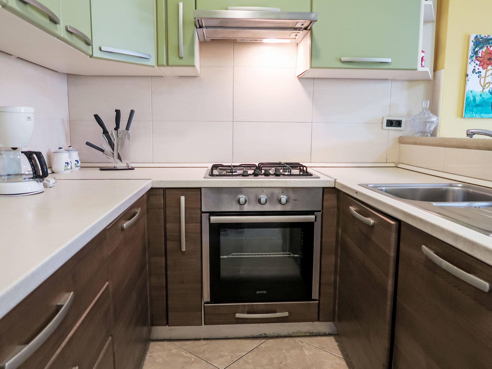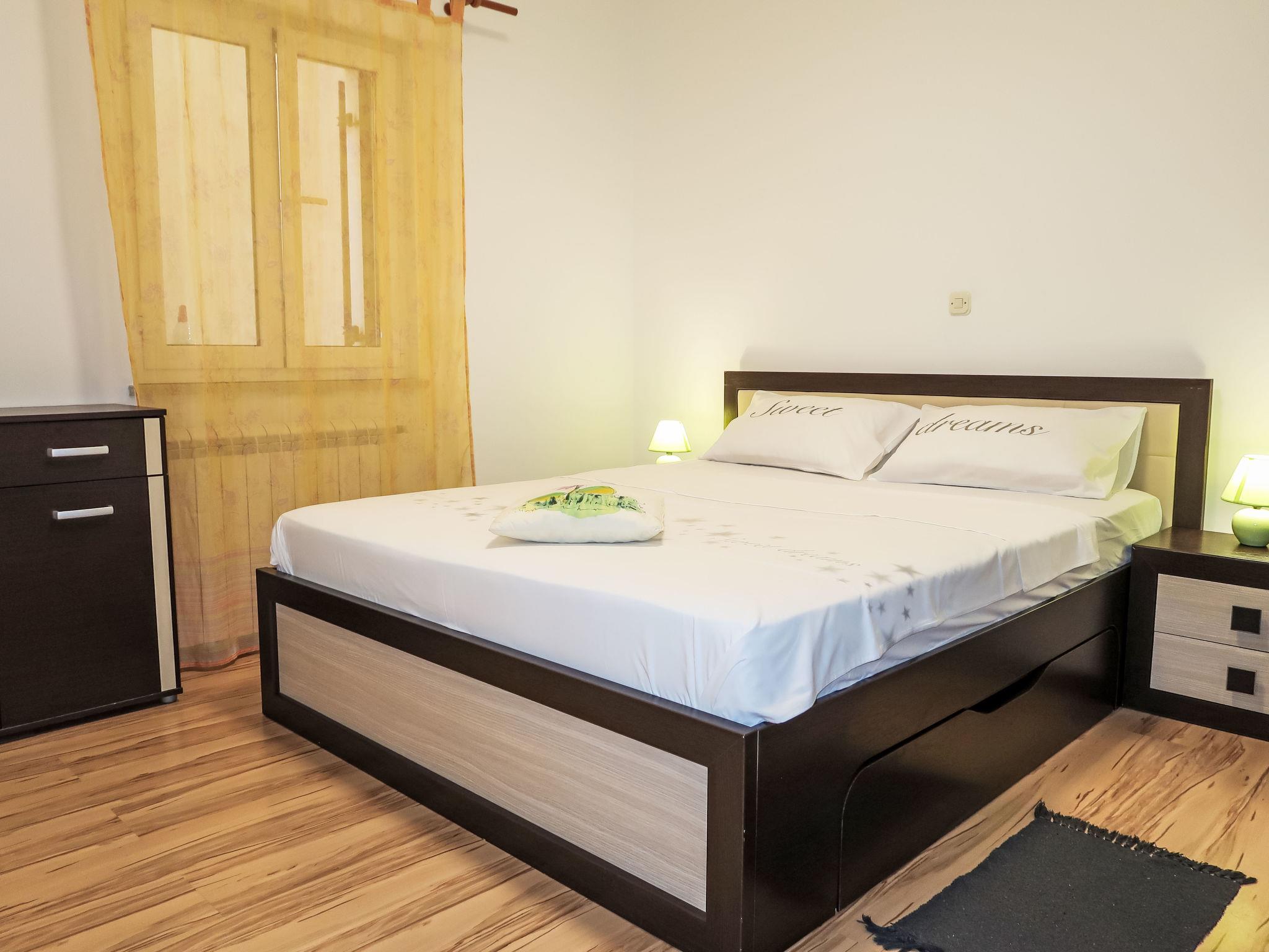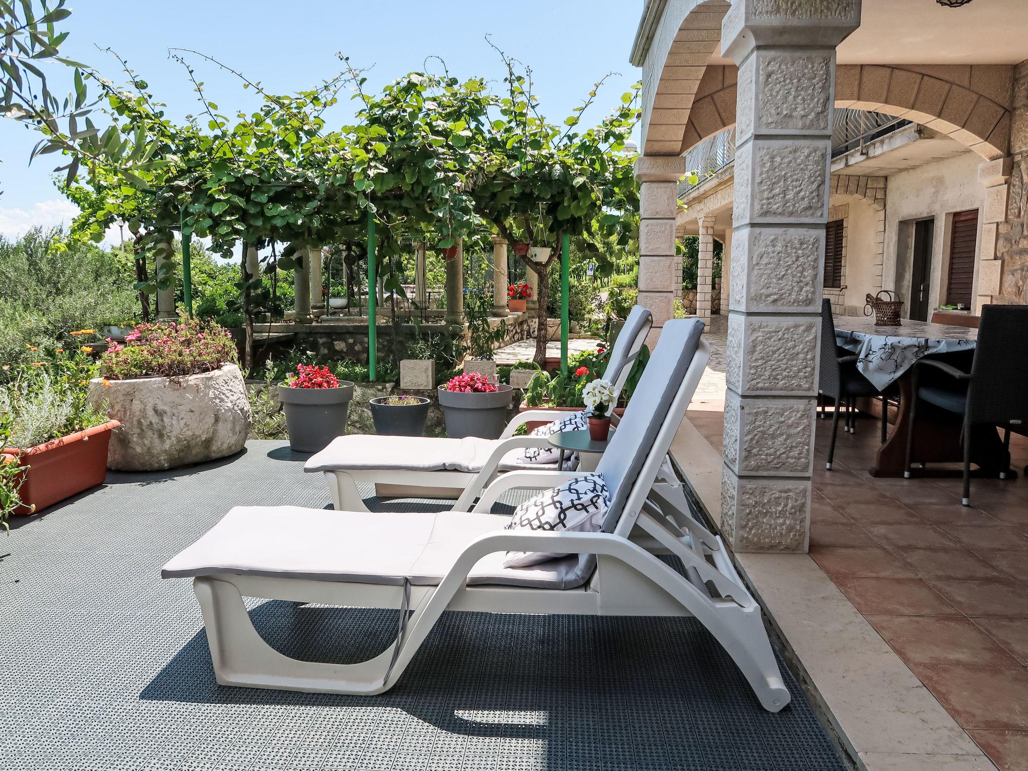 3-room apartment 60 m2, on the ground floor. Living/dining room with satellite TV and air conditioning. Exit to the terrace. 1 room with 1 french bed (160 cm, length 200 cm). 1 room with 2 beds (90 cm, length 200 cm). Exit to the terrace. Open kitchen (1 hot plate, oven, dishwasher, 3 gas rings, toaster, kettle, freezer, electric coffee machine). Shower/WC. No heating option. Terrace 34 m2 partly roofed. Terrace furniture. View of the sea. Facilities: iron, mosquito net, hair dryer. Internet (WiFi, free). Please note: non-smoking house.
