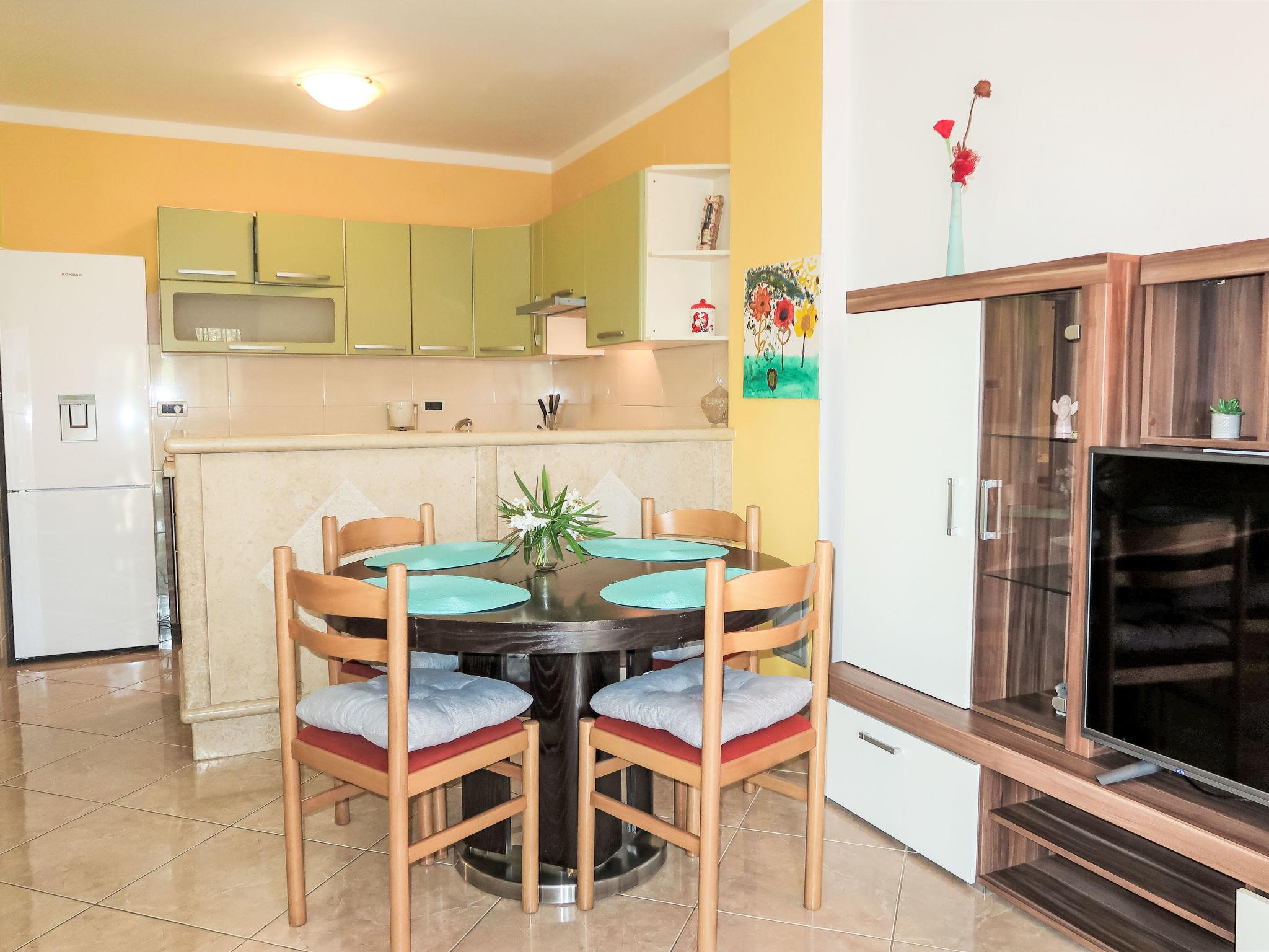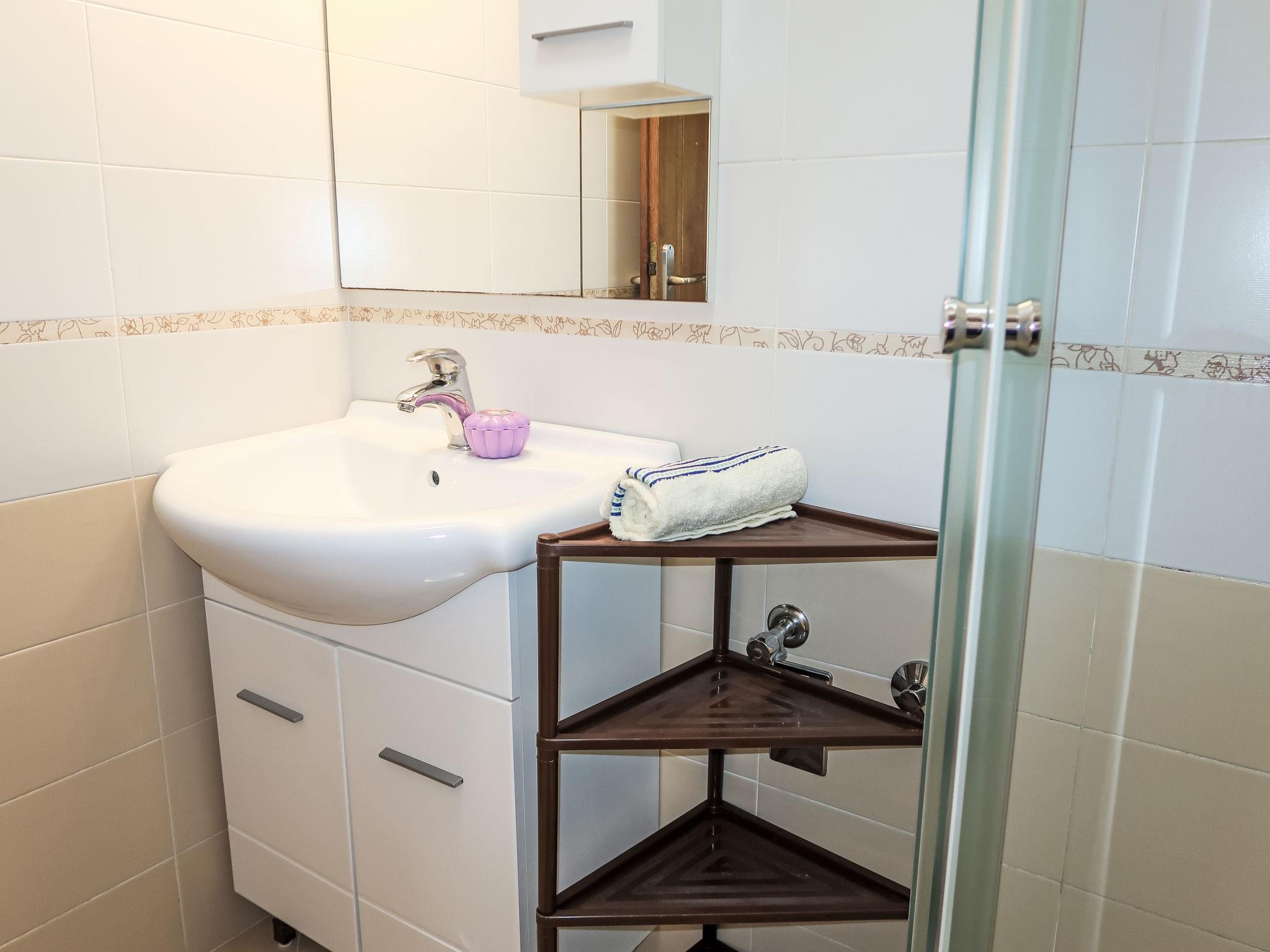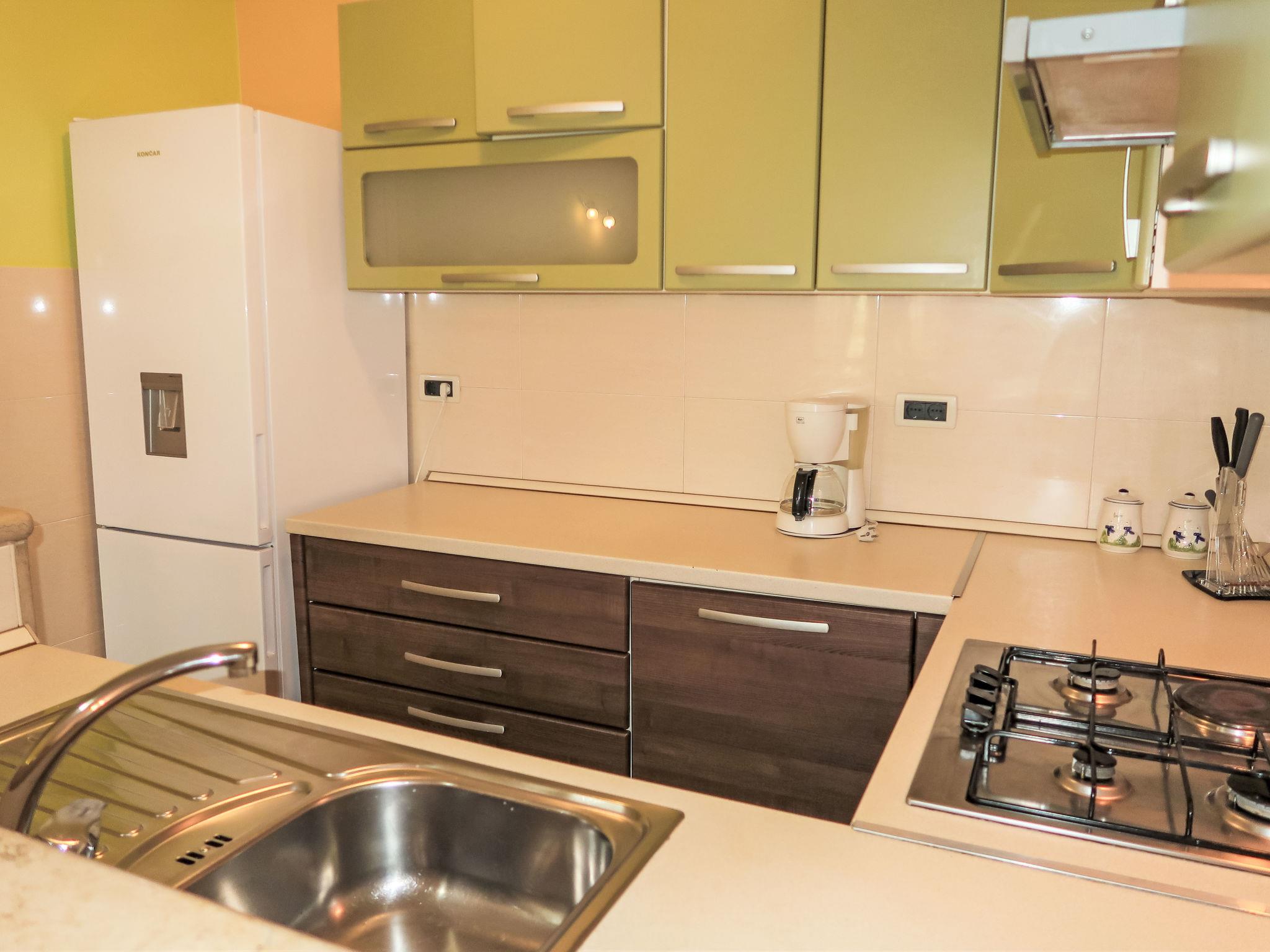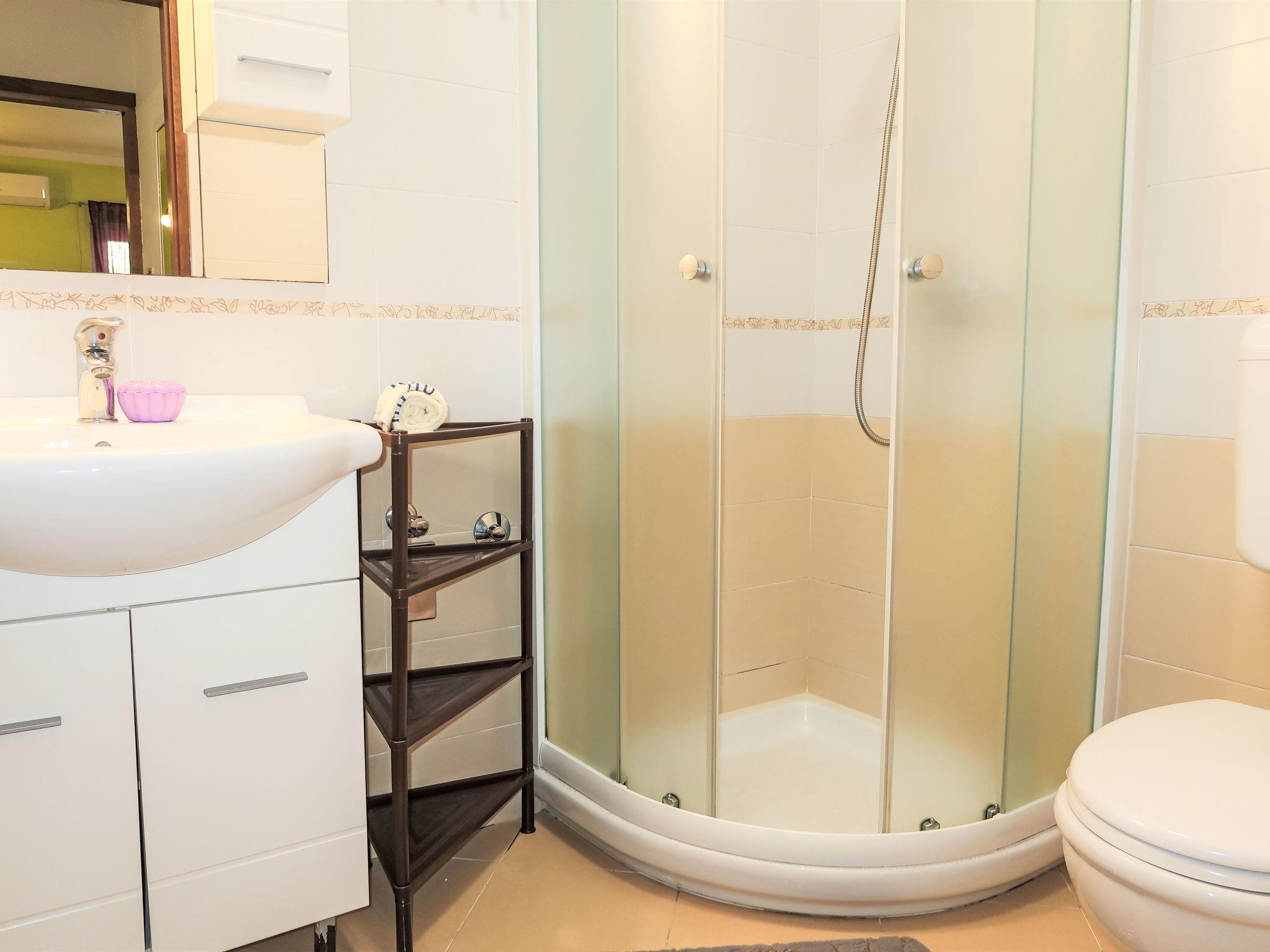 3-room apartment 60 m2, on the ground floor. Living/dining room with satellite TV and air conditioning. Exit to the terrace. 1 room with 1 french bed (160 cm, length 200 cm). 1 room with 2 beds (90 cm, length 200 cm). Exit to the terrace. Open kitchen (1 hot plate, oven, dishwasher, 3 gas rings, toaster, kettle, freezer, electric coffee machine). Shower/WC. No heating option. Terrace 34 m2 partly roofed. Terrace furniture. View of the sea. Facilities: iron, mosquito net, hair dryer. Internet (WiFi, free). Please note: non-smoking house.