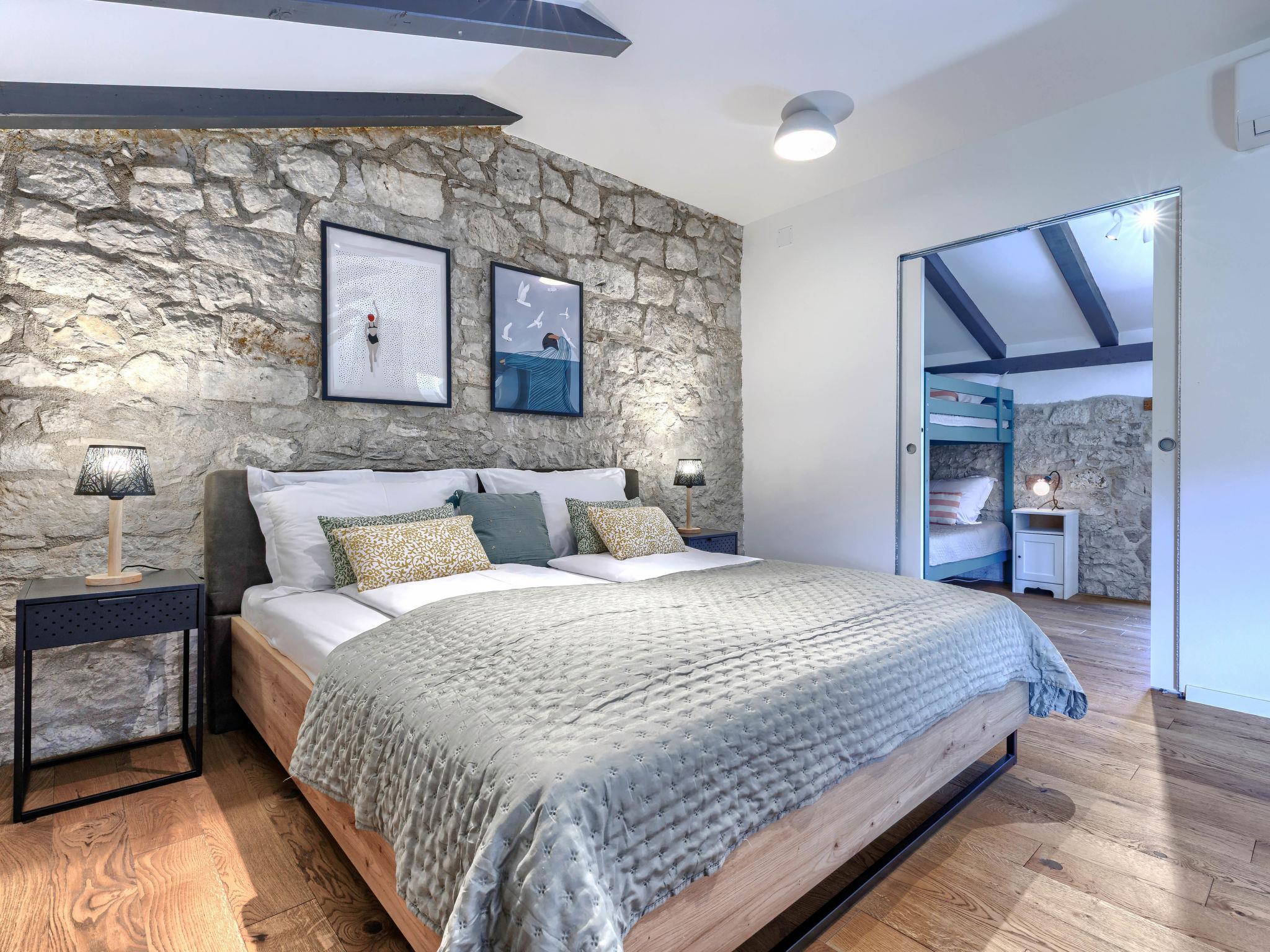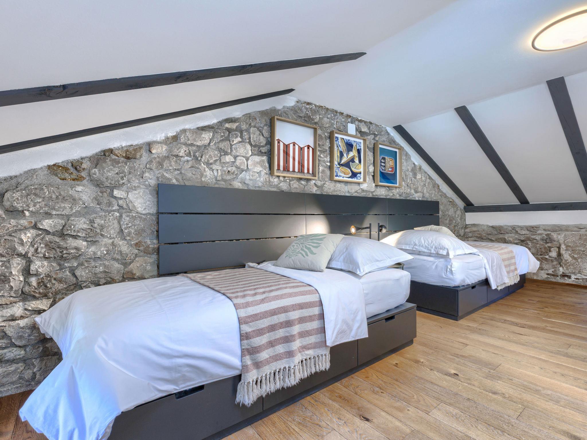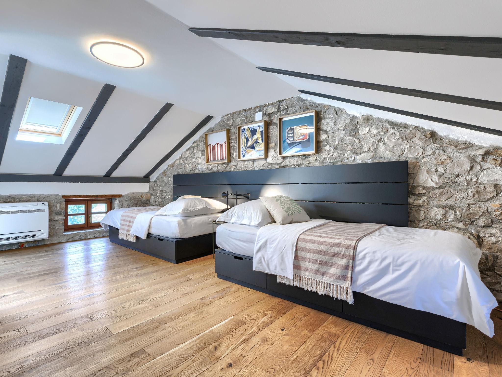 5-room terraced house 200 m2 on 3 levels. Living/dining room with satellite TV and air conditioning. Exit to the terrace, to the swimming pool. Open kitchen (oven, dishwasher, 4 induction hot plates, toaster, kettle, microwave, freezer, electric coffee machine). Sep. WC. Upper floor: walk-through room with 1 double bed (2 x 90 cm, length 200 cm), shower/WC and air conditioning. 1 room with sloping ceilings, ceiling height 186 - 262 cm with 1 bed (90 cm, length 200 cm). 1 room with sloping ceilings, ceiling height 186 - 262 cm with 1 double bed (2 x 90 cm, length 200 cm), shower/WC and air conditioning. Top floor: 1 room with sloping ceilings, ceiling height 115 - 215 cm with 2 beds (90 cm, length 200 cm), shower/WC and air conditioning. Forced-air heating. Terrace 70 m2, terrace 15 m2, roofed. Terrace furniture, barbecue (portable), deck chairs. Facilities: iron, hair dryer. Internet (WiFi, free). Please note: non-smoking house.
