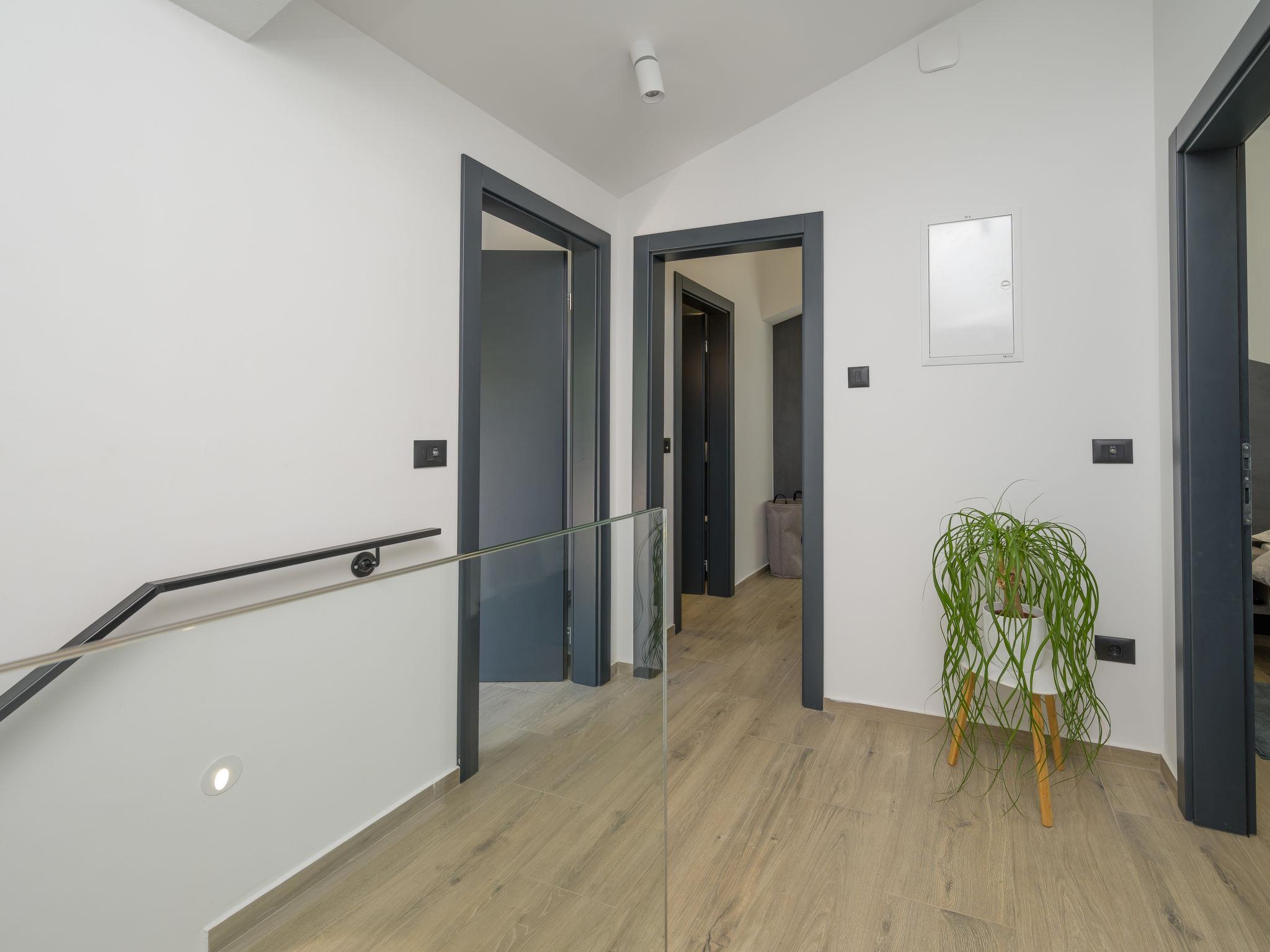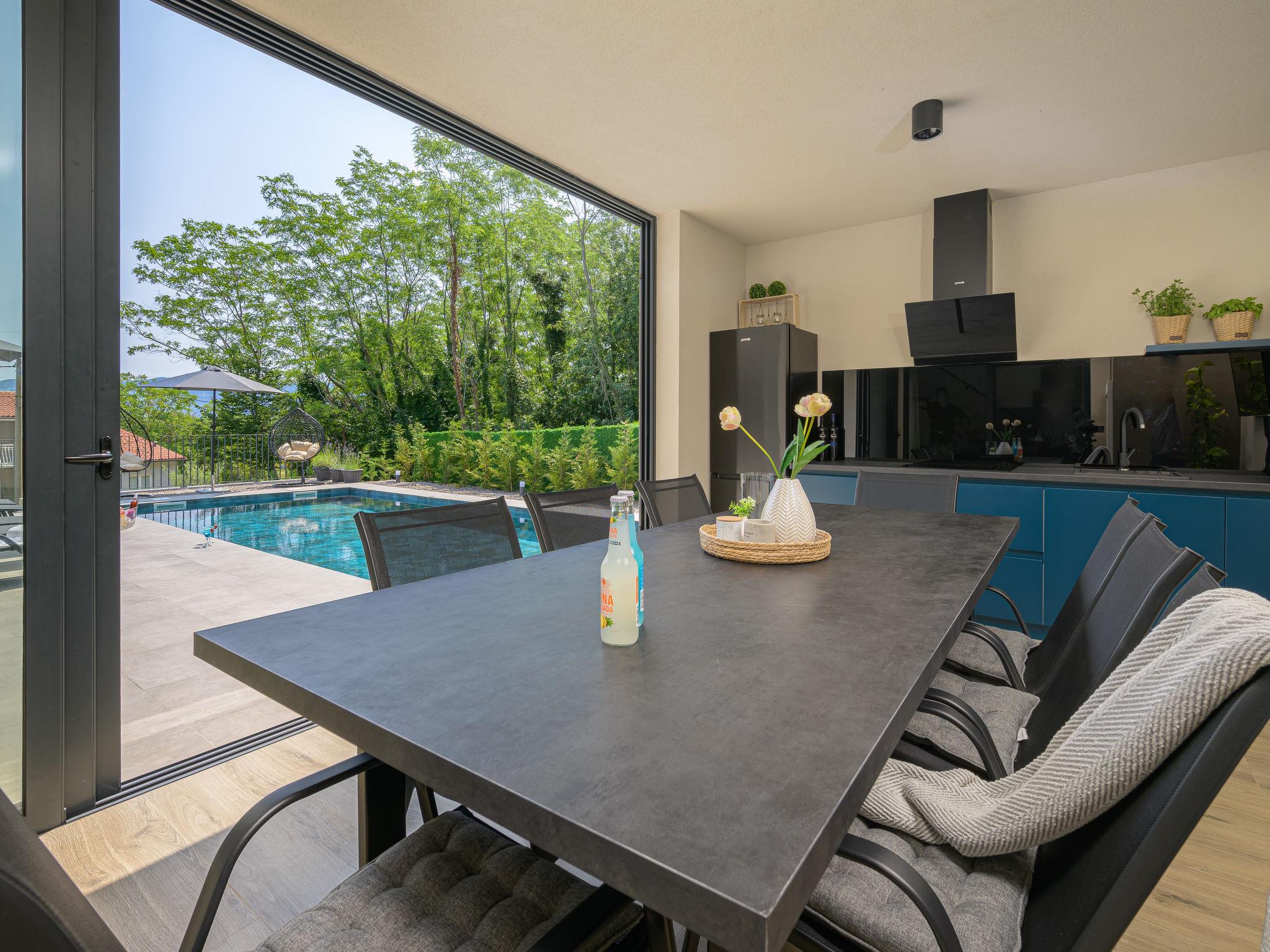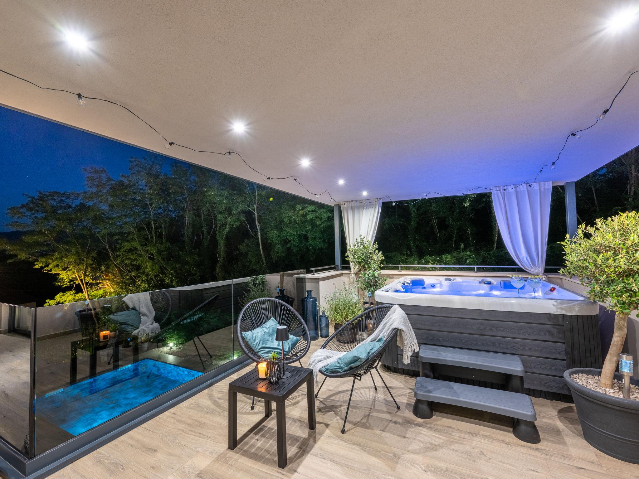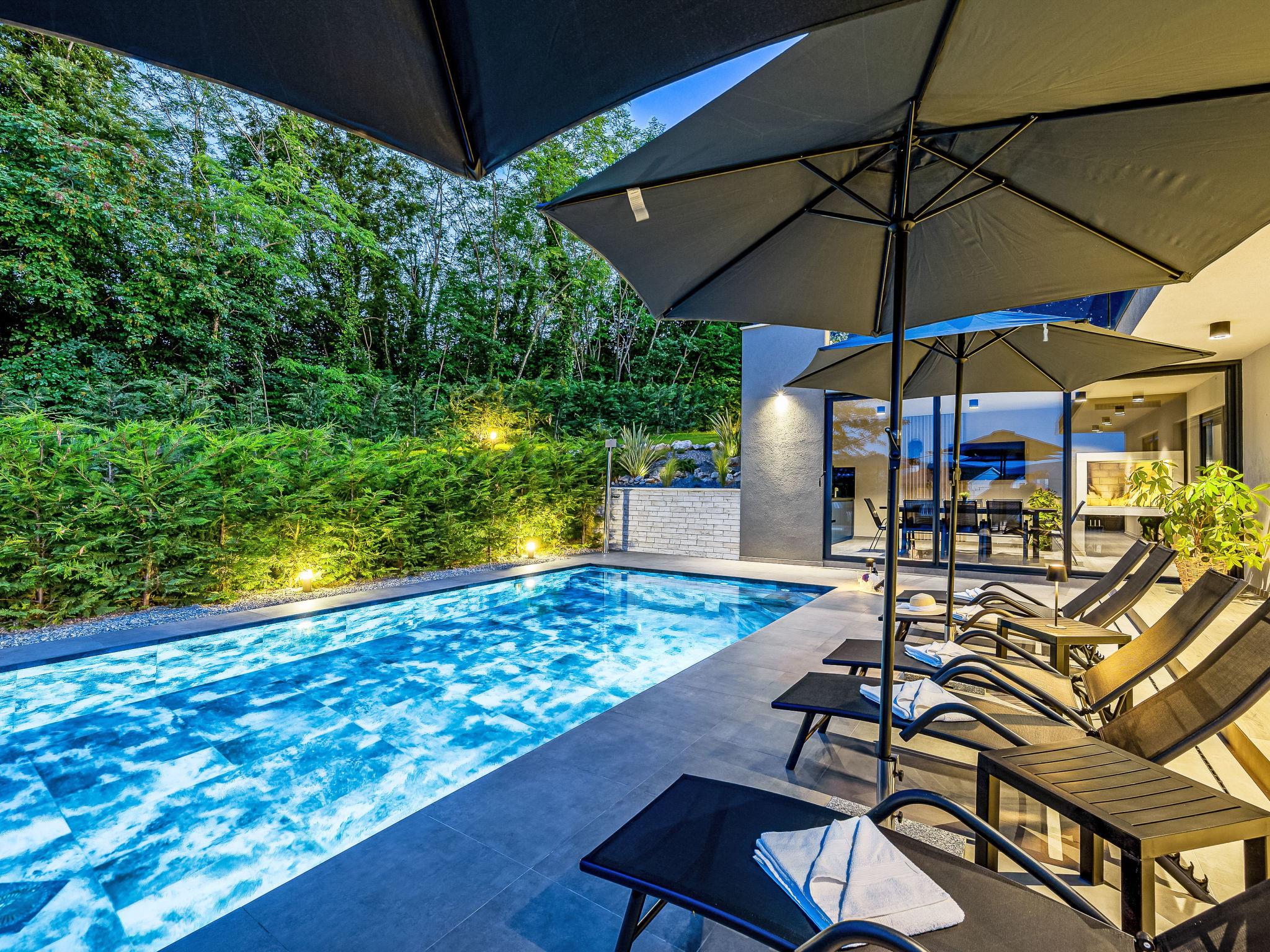 Very beautiful, luxurious villa "Ollea", 3 storeys. In the hamlet Radovici 10 km from the centre of Labin, 15 km from the centre of Rabac, 15 km from the sea. Private: property 900 m2 (fenced) with wildlife garden and trees, swimming pool angular (8 x 4 m, depth 150 cm, seasonal availability: 01.Apr. - 30.Oct.) with internal staircase. Outdoor shower, hot tub, table tennis, barbecue (slide, swing), pool maintenance by the owner/gardener. In the house: internet access, sauna, table football, washing machine, tumble dryer. Roofed, parking (for 4 cars) at the house on the premises. Shop 4 km, supermarket 10 km, restaurant 4 km, bus stop "Labin" 10 km, pebble beach 15 km. The owner does not accept any youth groups. Please note: airfield 53 km from the property. Video surveillance of the driveway and parking.