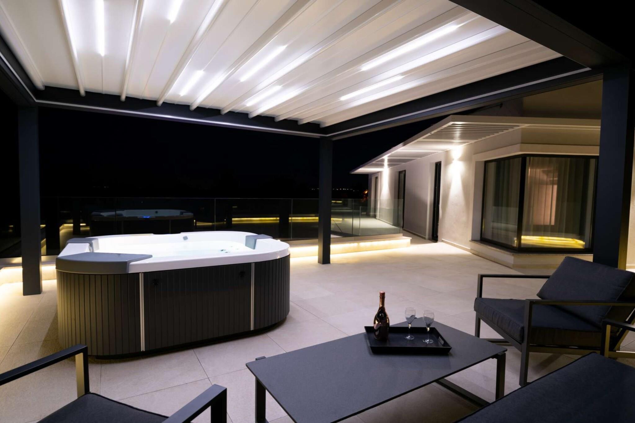Stueetage: (Stue(dobbeltsovesofa, hyggepejs), spisestue(spisebord), Køkken(kakkelovn, brødrister, kaffemaskine, ovn, combi-mikroovn, opvaskemaskine , fryser), soveværelse(dobbeltseng), badeværelse(bruser), opholdsrum(Fjernsyn, hyggespil), klimaanlæg) På 1. etage: (soveværelse(dobbeltseng), soveværelse(dobbeltseng), soveværelse(dobbeltseng, Fjernsyn), badeværelse(bruser, toilet), badeværelse(bruser, toilet), badeværelse(bruser, toilet), sofahjørne, hottub, balkon eller terrasse, balkon eller terrasse) udekøkken, hottub, have, parkering, private outdoor pool