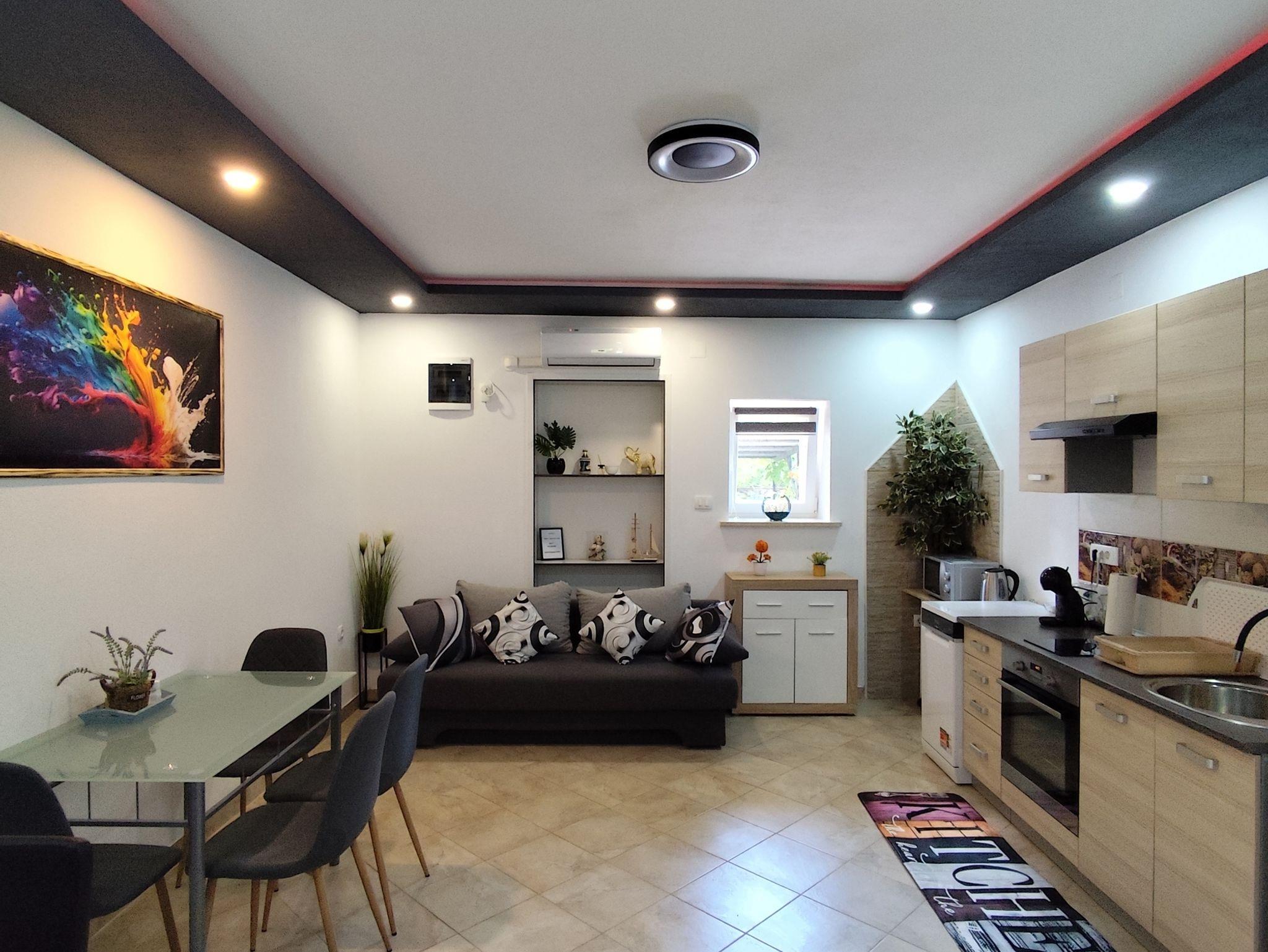 Ferienwohnung bietet Platz für 4 Gäste. Die Betten sind in Schlafzimmern, die es 1 gibt, und in Wohnzimmer, innerhalb einer Gesamtfläche von 39m2, angeordnet. Die Gäste haben eine eigene Terrasse zur Verfügung, auf der sie in warmen Sommernächten genießen können. Für vollen Genuss und Entspannung gibt es einen privaten Grill für Gäste dieser Unterkunft. Während ihres Aufenthalts können sich Gäste im privaten Schwimmbad entspannen. IM PREIS INBEGRIFFEN: Kurtaxe, Endreinigung, Klimatisierung, Pool, Parkplatz, Internet, Kinderbett, Bügeleisen, Bügelbrett, Föhn. Die Verfügbarkeit zusätzlicher Dienstleistungen in Ihrem reservierten Termin und die Preise derselben (falls nicht aufgeführt) müssen im Voraus überprüft werden. Zusätzliche Dienstleistungen die in der Zahlungsaufforderung nicht aufgeführt sind werden direkt beim Vermieter bezahlt, angenommen der Gast nutzt auch diese. Ermäßigung auf den Grundpreis: Gratistag 28=25 (bei einem Aufenthalt von 28 oder mehr Tagen erhalten Sie 3 kostenlose Tage für den Aufenthalt bis 31.12.26).