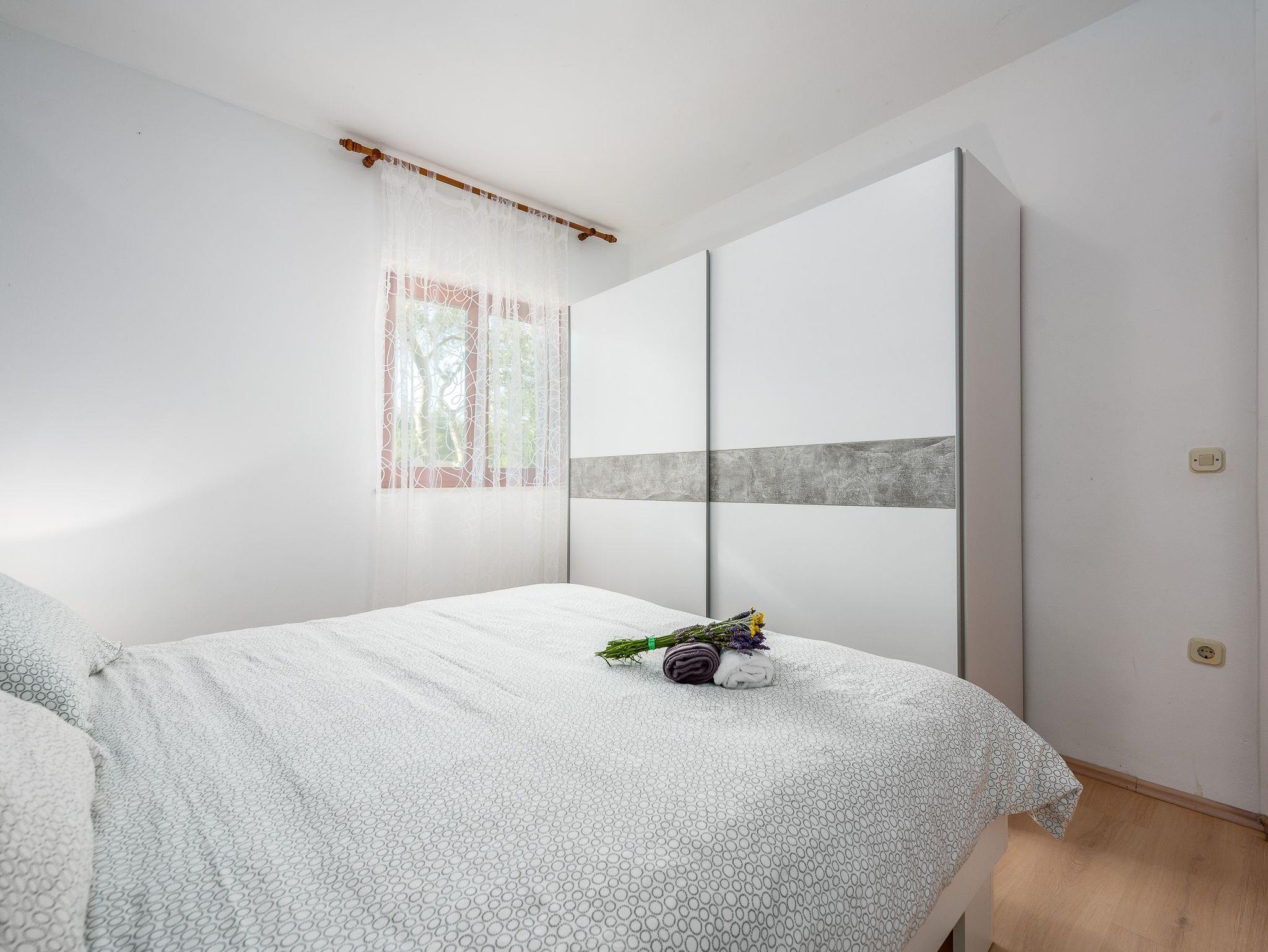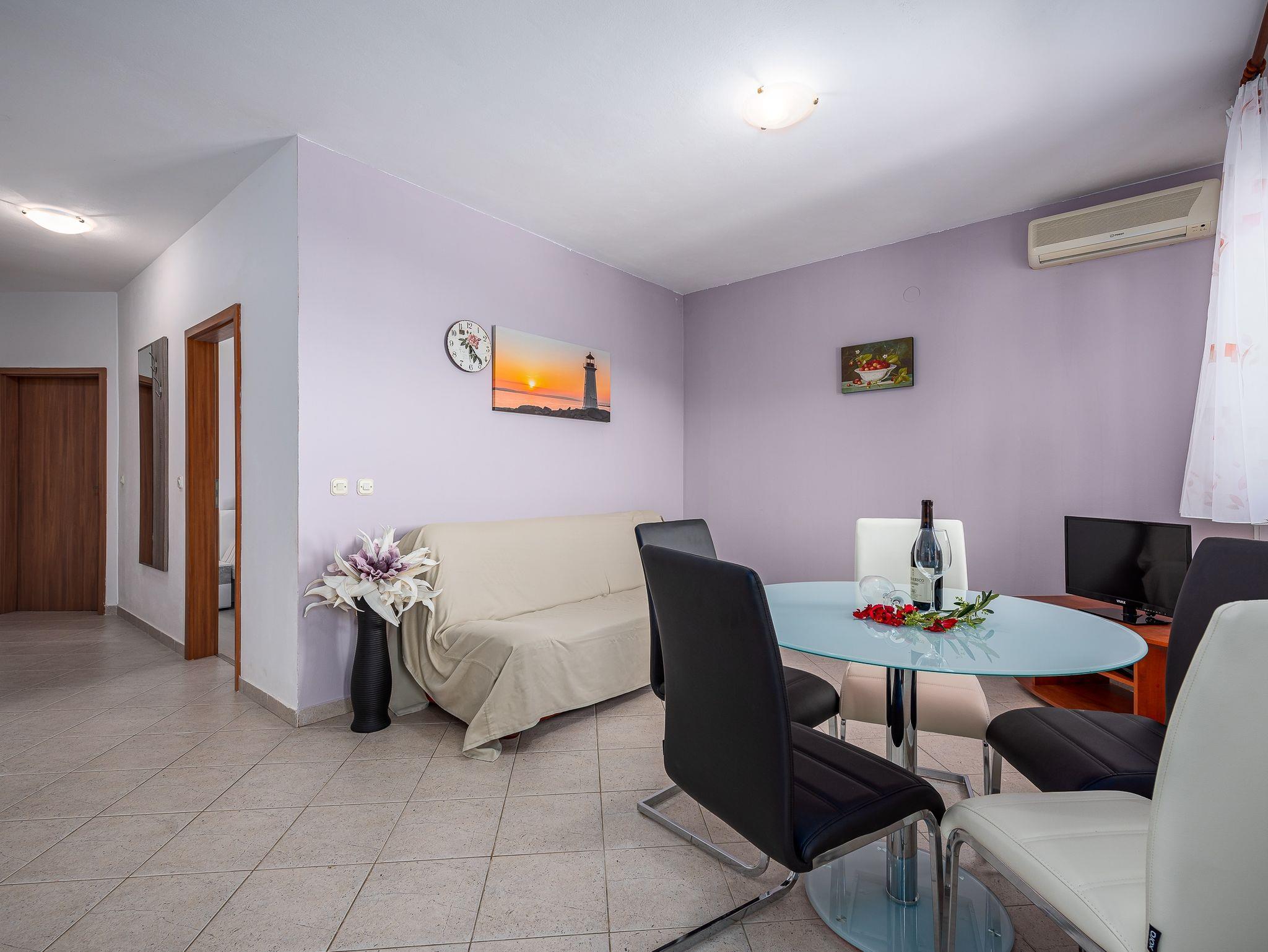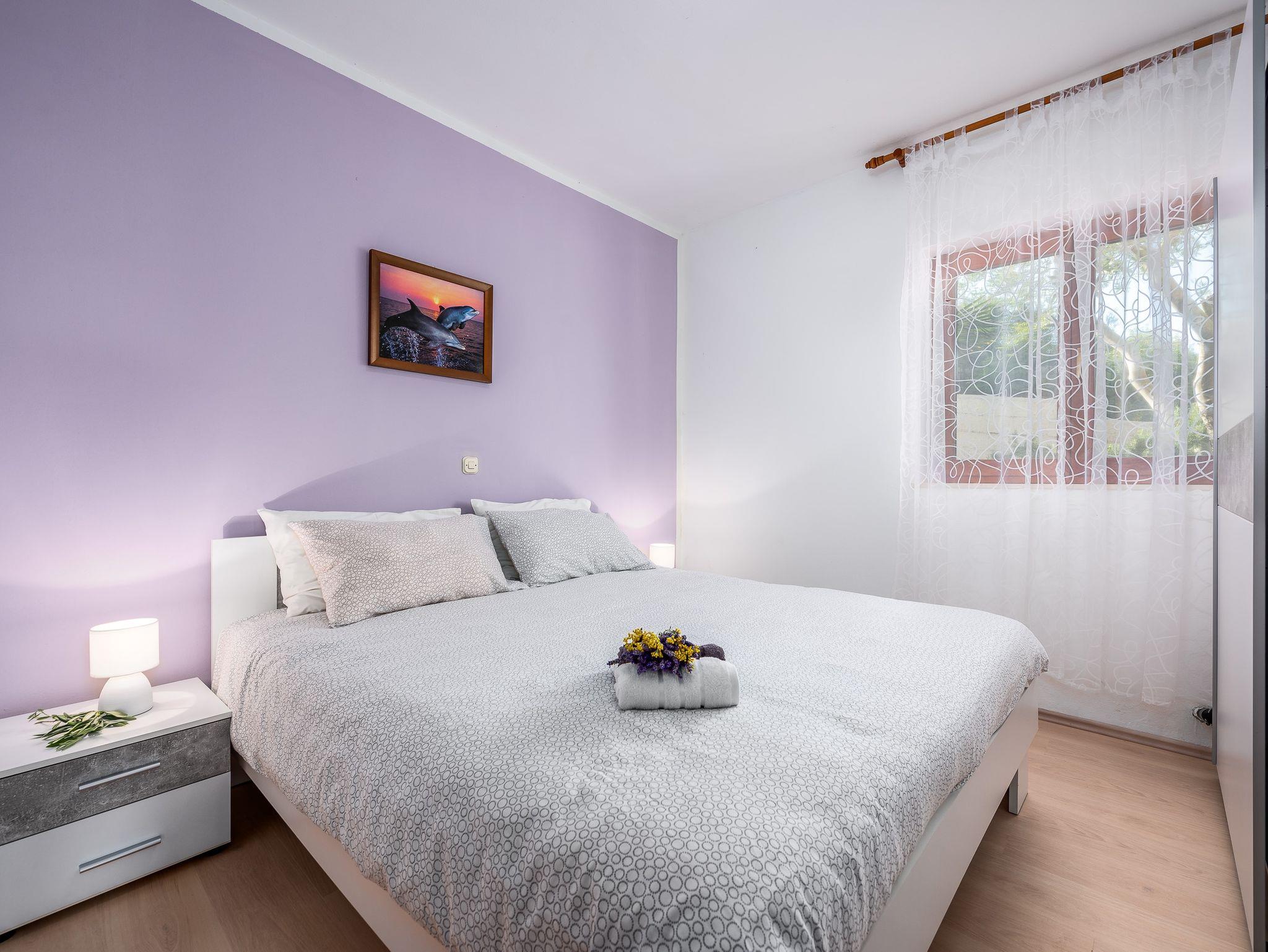 Ferienwohnung bietet Platz für 5 Gäste. Die Betten sind in Schlafzimmern, die es 2 gibt, und in Wohnzimmer, innerhalb einer Gesamtfläche von 52m2, angeordnet. Die Gäste haben eine eigene Terrasse zur Verfügung, auf der sie in warmen Sommernächten genießen können. Das Apartment bietet Meerblick. Es ist erlaubt, Speisen auf dem Gemeinschafts-Grill vorzubereiten. Während ihres Aufenthalts können Gäste das gemeinsam zur Nutzung stehende Schwimmbad benutzen. In der Unterkunftseinheit besteht die Möglichkeit des Mitbringens von Haustieren gegen Aufpreis. IM PREIS INBEGRIFFEN: Kurtaxe, Endreinigung, Klimatisierung, Pool, Parkplatz, Internet, Wäschewaschen, Kinderbett, Bügeleisen, Bügelbrett, Föhn. UNVERBINDLICHE ZUSÄTZLICHE KOSTEN: Haustiere (10,00 € pro Nacht), Fahrrad (20,00 € täglich (pro Stück)). Die Verfügbarkeit zusätzlicher Dienstleistungen in Ihrem reservierten Termin und die Preise derselben (falls nicht aufgeführt) müssen im Voraus überprüft werden. Zusätzliche Dienstleistungen die in der Zahlungsaufforderung nicht aufgeführt sind werden direkt beim Vermieter bezahlt, angenommen der Gast nutzt auch diese.