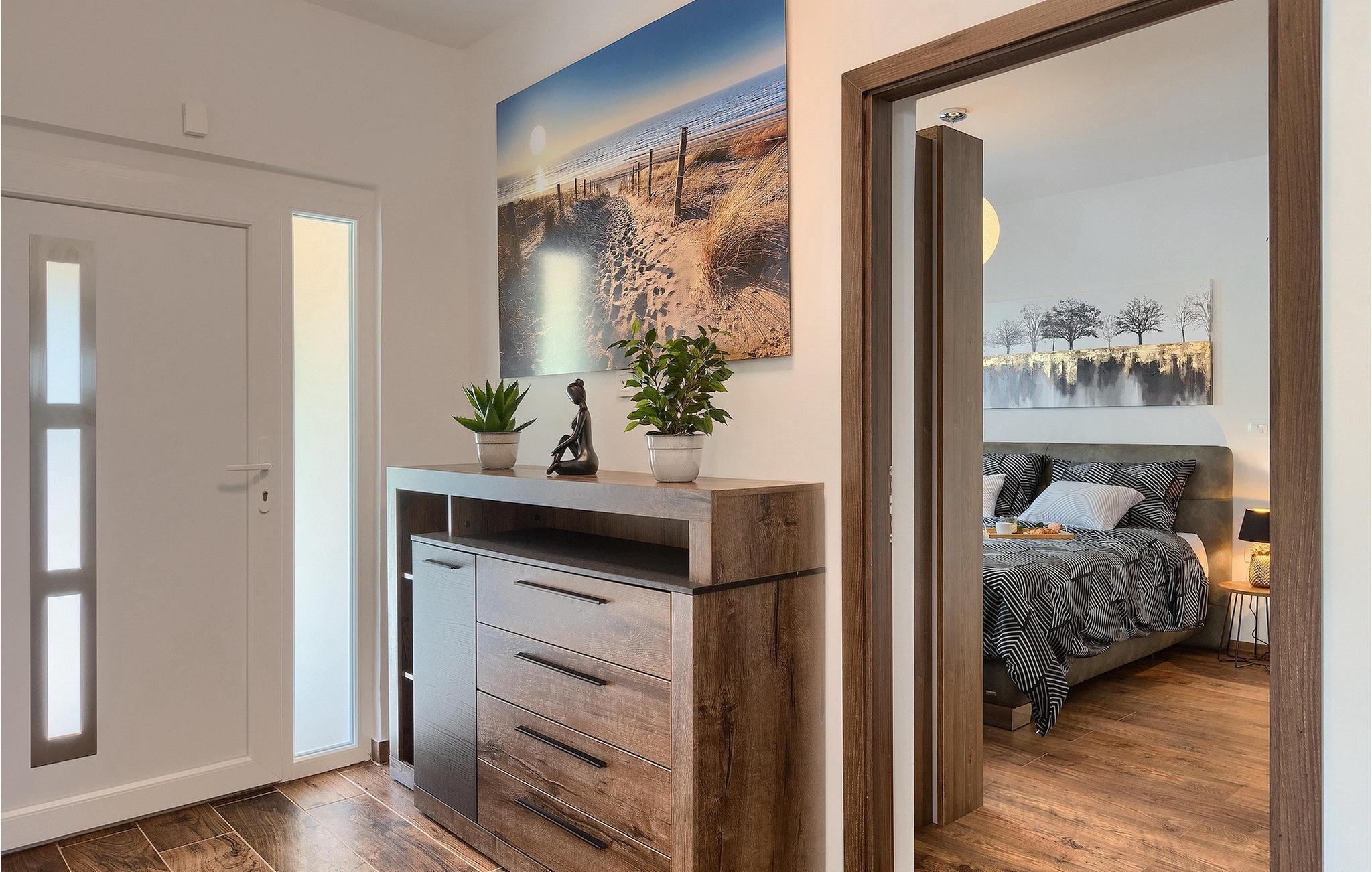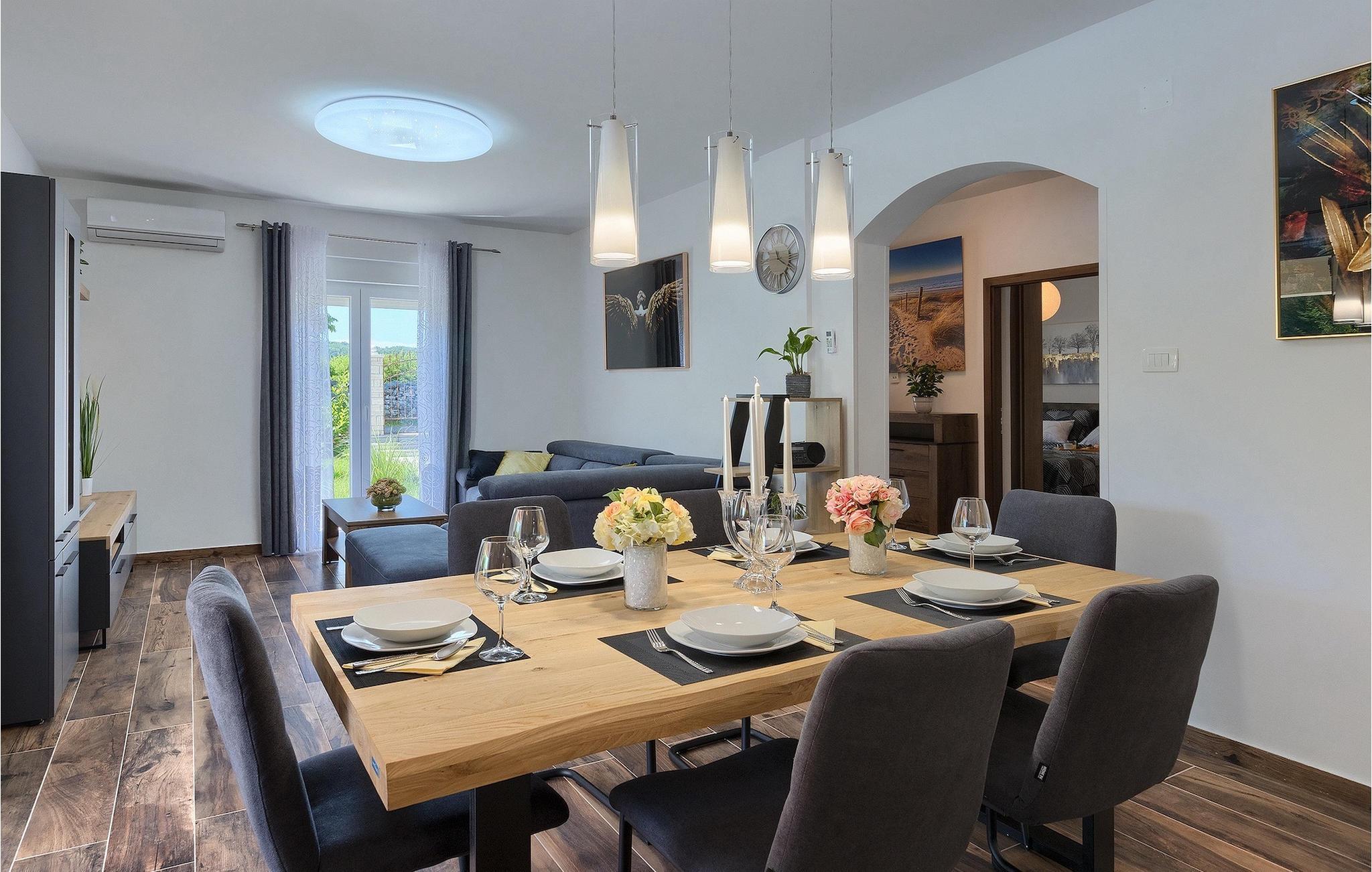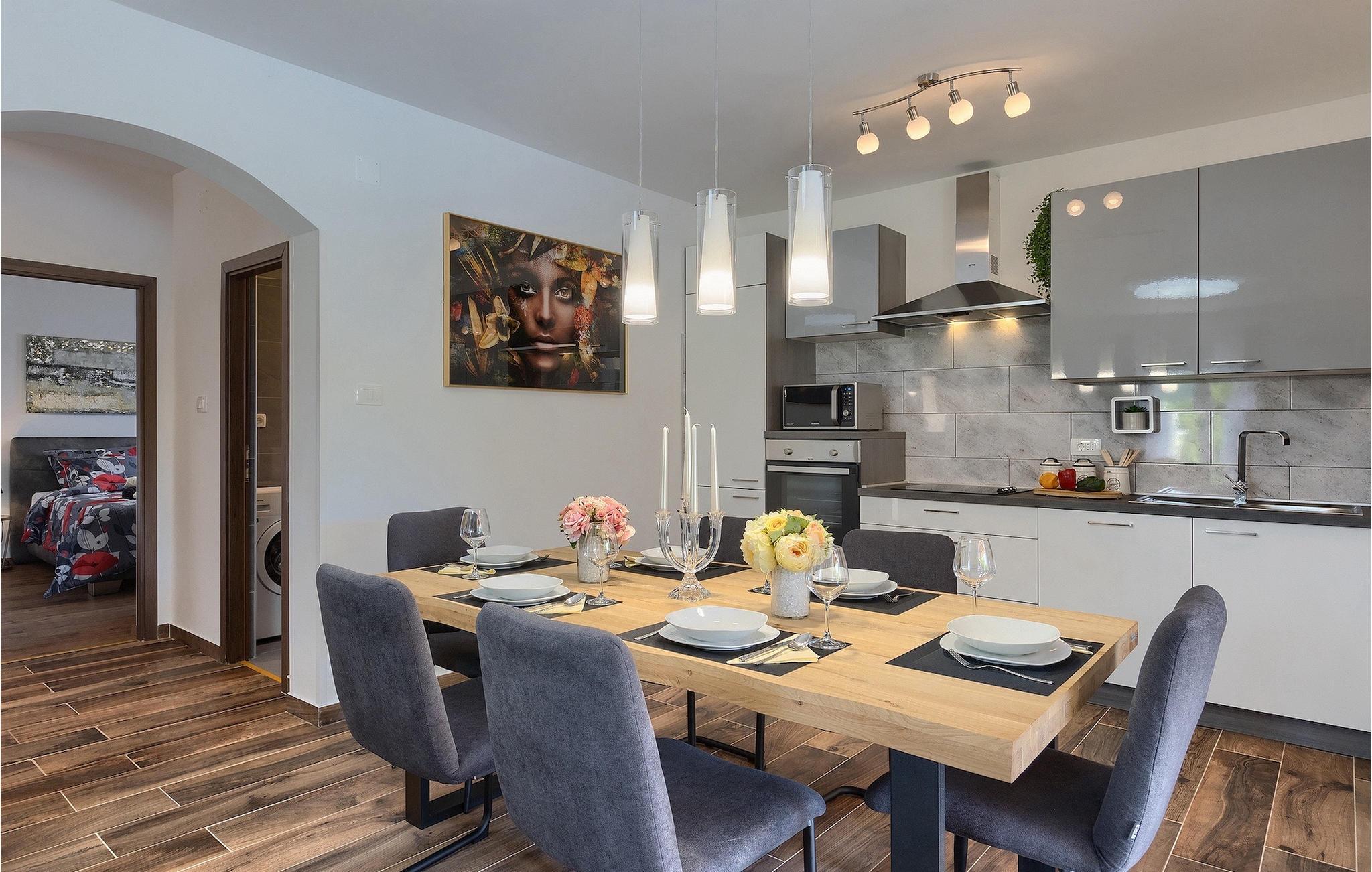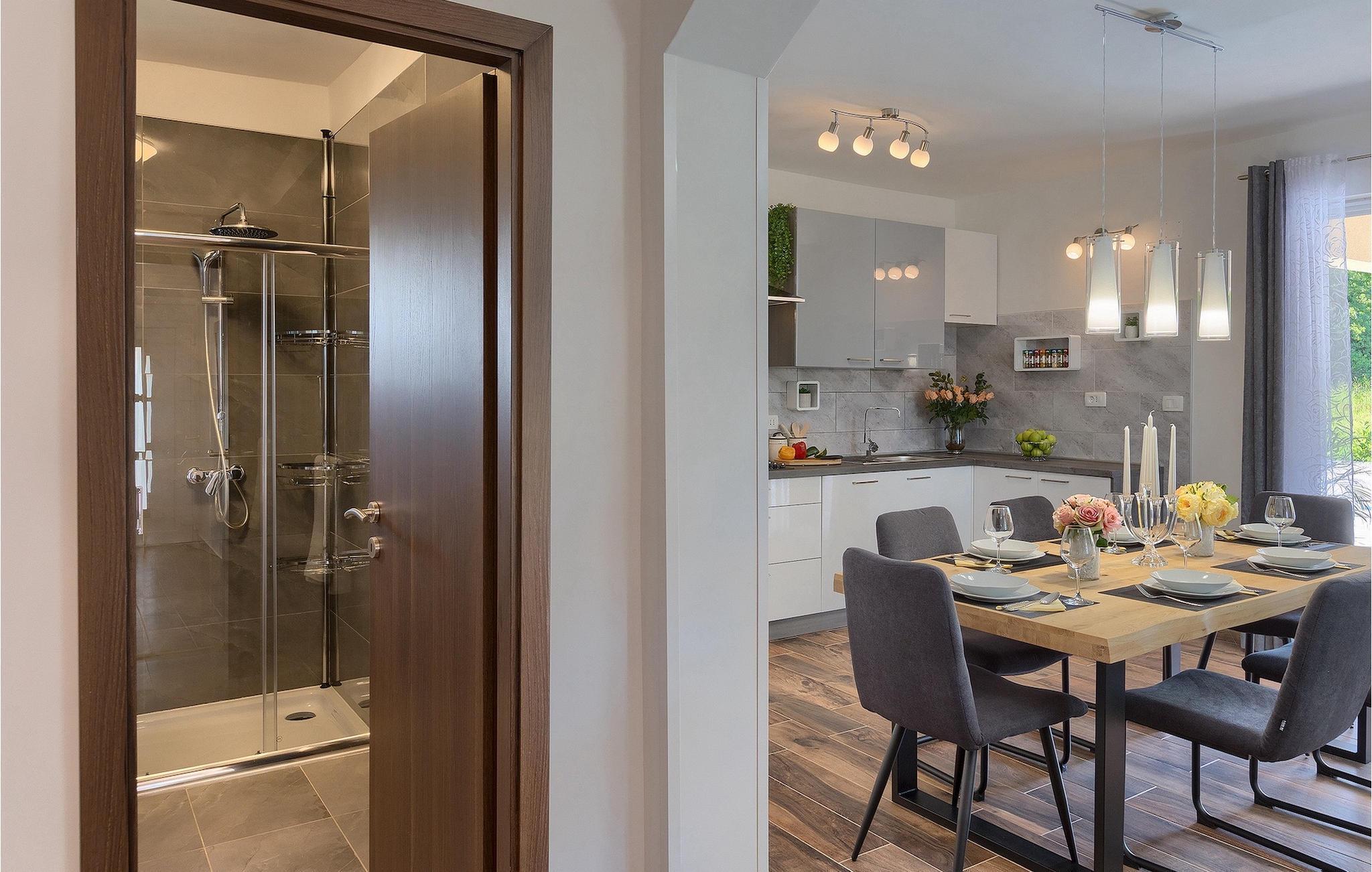 Nyd din velfortjente ferie i den smukke Villa Elanna og flugt fra hverdagen!Labin er det historiske og administrative centrum i det østlige Istrien. Området er et paradis for historie- og kunstentusiaster med sin rige kulturelle og arkitektoniske arv. De stejle snoede gader i den gamle bydel kan prale af velbevarede historiske paladser, talrige kunstgallerier og atelierer og er vært for forskellige jazz- og klassisk musikfestivaler i sommermånederne. Byen byder på adskillige fremragende fiskerestauranter, med mange lokale råvarer på tilbud, samt mange hyggelige kaffebarer, ideelle til at nyde den afslappede atmosfære. Labins badeby i Rabac, engang en fiskerby og i dag et populært turistmål omgivet af himmelske stenstrande. Området i det østlige Istrien byder på en mangfoldighed af strande og krystalklart hav. Den uberørte kyst afslører fredelige bugter med blide småsten, friske klipper badet med bølger og aromatiske skove. Med sine mange kyst- og skovstier er dette område fantastisk til mountainbiking, lange afslappende gåture, ridning, men også som udgangspunkt for udflugter til at opdage det magiske Istrien.