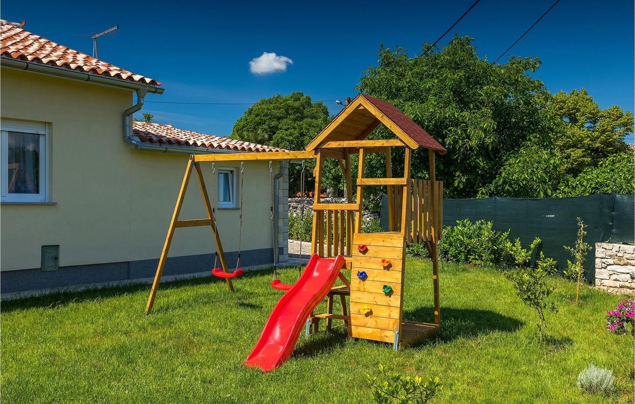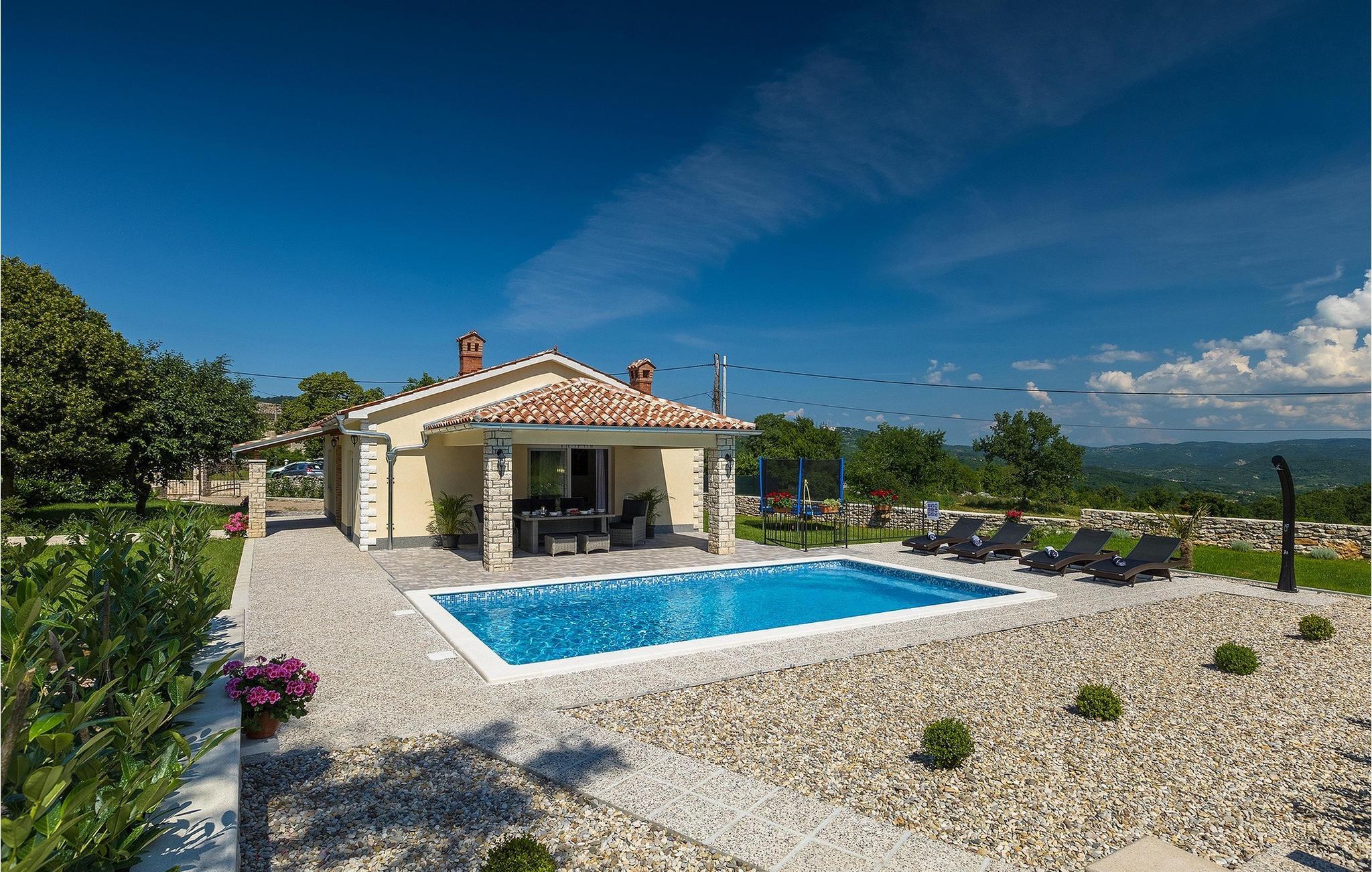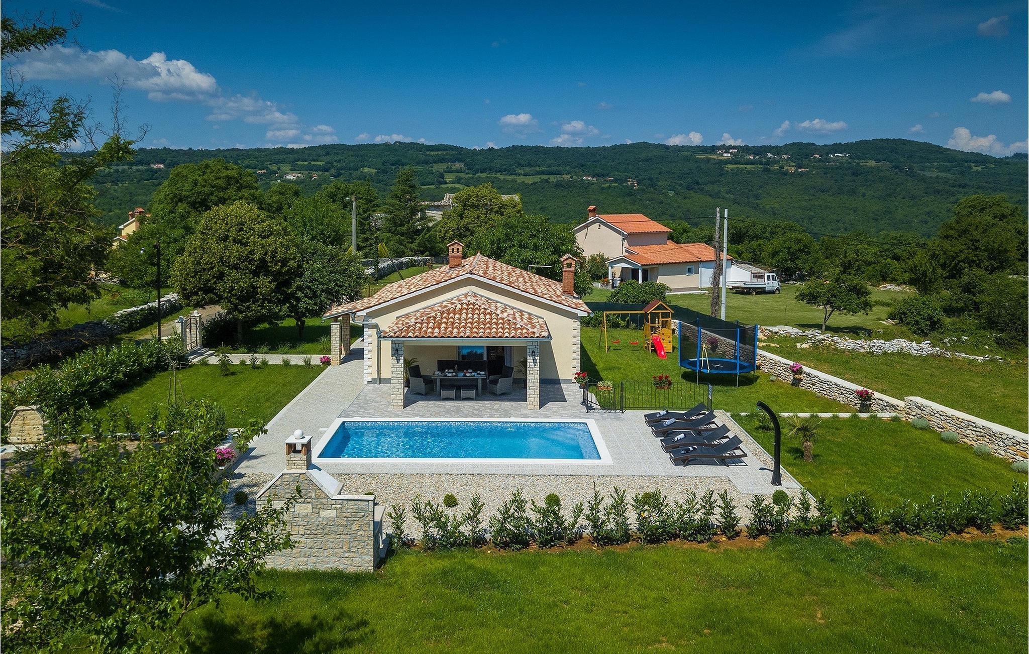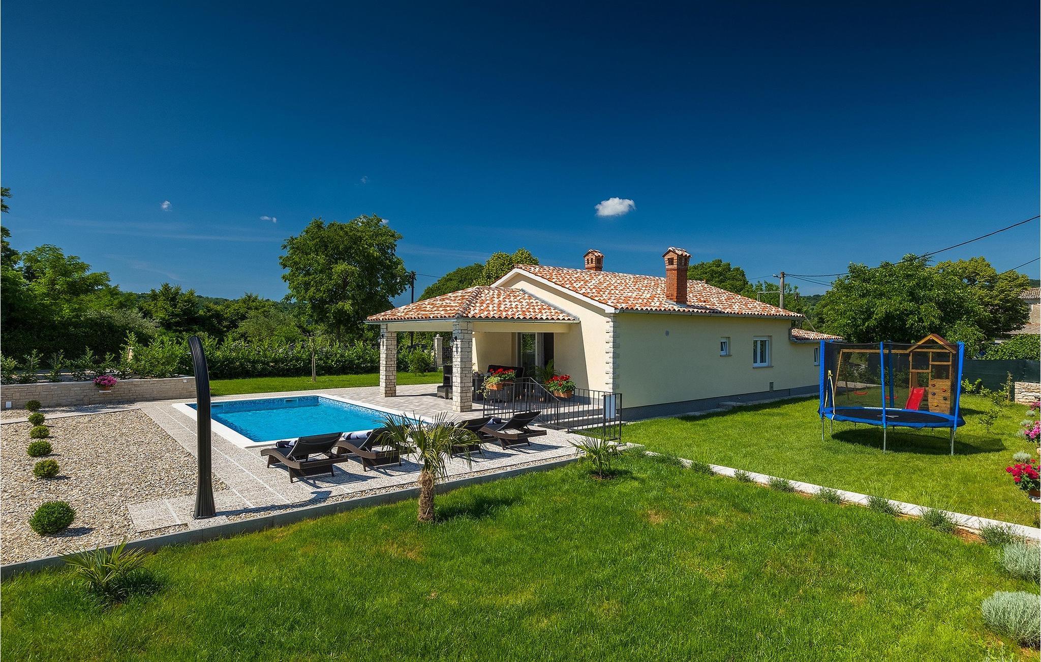 På en rolig beliggenhed, langt fra turistens travlhed, men tæt nok på de omkringliggende byer til at nyde nogle gode udflugter. Så snart du når villaen, vil du på magisk vis blive tiltrukket af den drømmeagtige 32m2 pool i villaens have. Tag en dukkert i det turkisblå kølige vand og slap af på en af liggestolene, mens børnene svinger eller hopper på trampolinen. Den overdækkede terrasse er det ideelle sted at tilbringe timer sammen. En kulgrill er tilgængelig for at forkæle din familie med alle slags lækkerier fra grillen. Gå ind i Villa Elanna, og du vil finde en moderne og lys stue og et fuldt udstyret køkken med spiseplads. De to komfortable soveværelser med dobbeltsenge er også på samme niveau. Begge soveværelser har deres eget stilfulde badeværelse med bruser - dit helt eget wellnessområde.