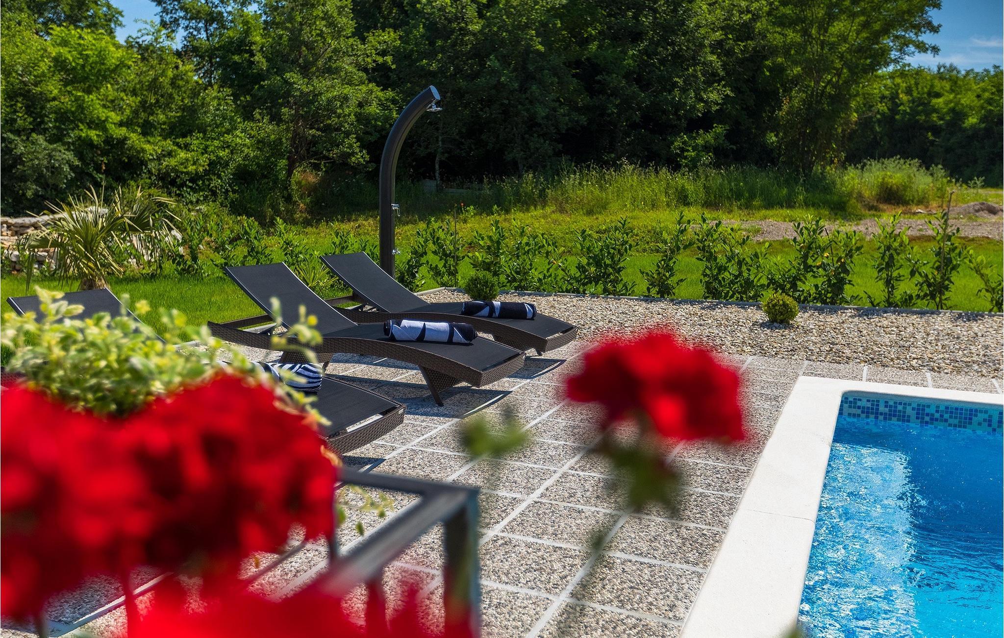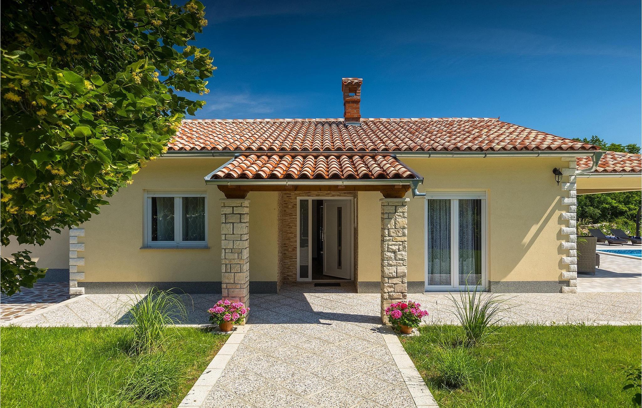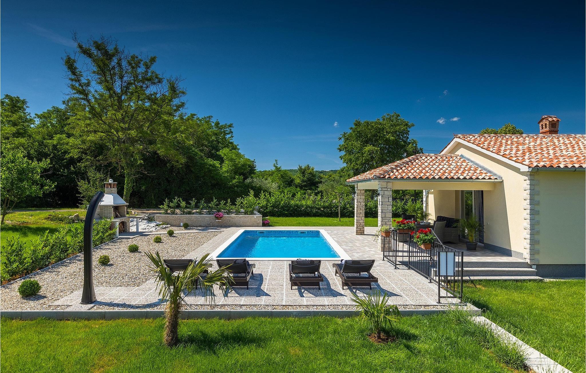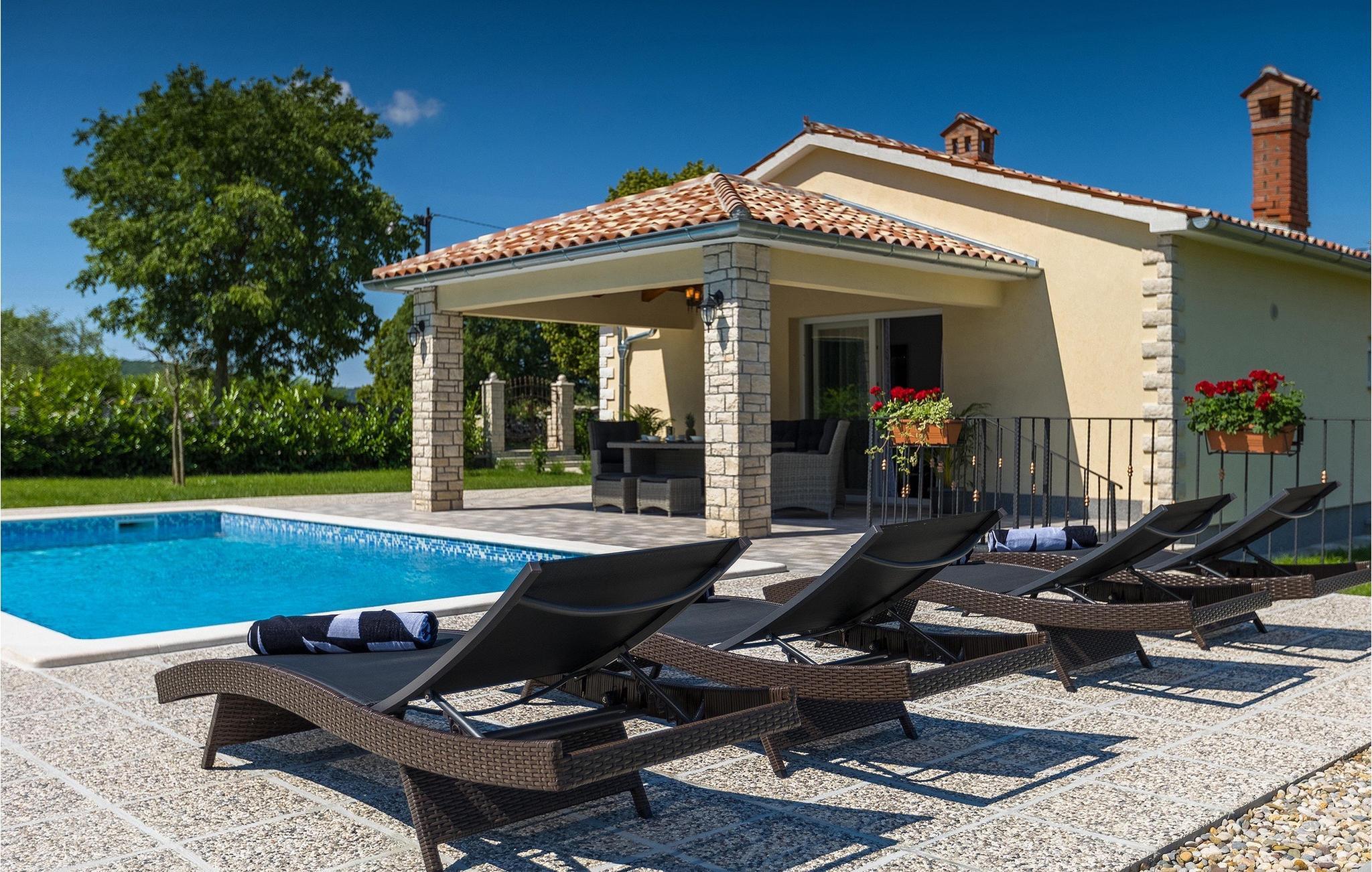 På en rolig beliggenhed, langt fra turistens travlhed, men tæt nok på de omkringliggende byer til at nyde nogle gode udflugter. Så snart du når villaen, vil du på magisk vis blive tiltrukket af den drømmeagtige 32m2 pool i villaens have. Tag en dukkert i det turkisblå kølige vand og slap af på en af liggestolene, mens børnene svinger eller hopper på trampolinen. Den overdækkede terrasse er det ideelle sted at tilbringe timer sammen. En kulgrill er tilgængelig for at forkæle din familie med alle slags lækkerier fra grillen. Gå ind i Villa Elanna, og du vil finde en moderne og lys stue og et fuldt udstyret køkken med spiseplads. De to komfortable soveværelser med dobbeltsenge er også på samme niveau. Begge soveværelser har deres eget stilfulde badeværelse med bruser - dit helt eget wellnessområde.