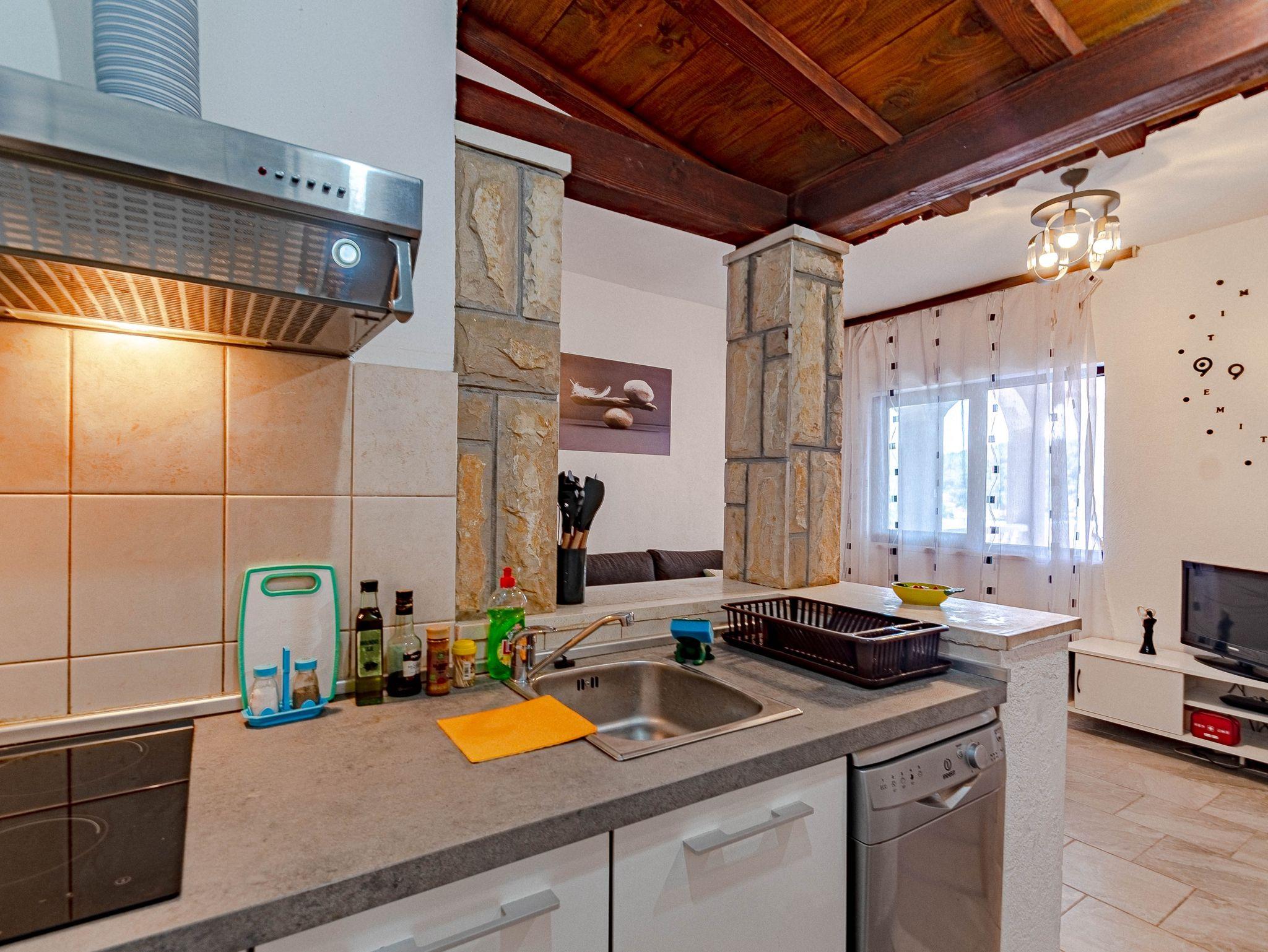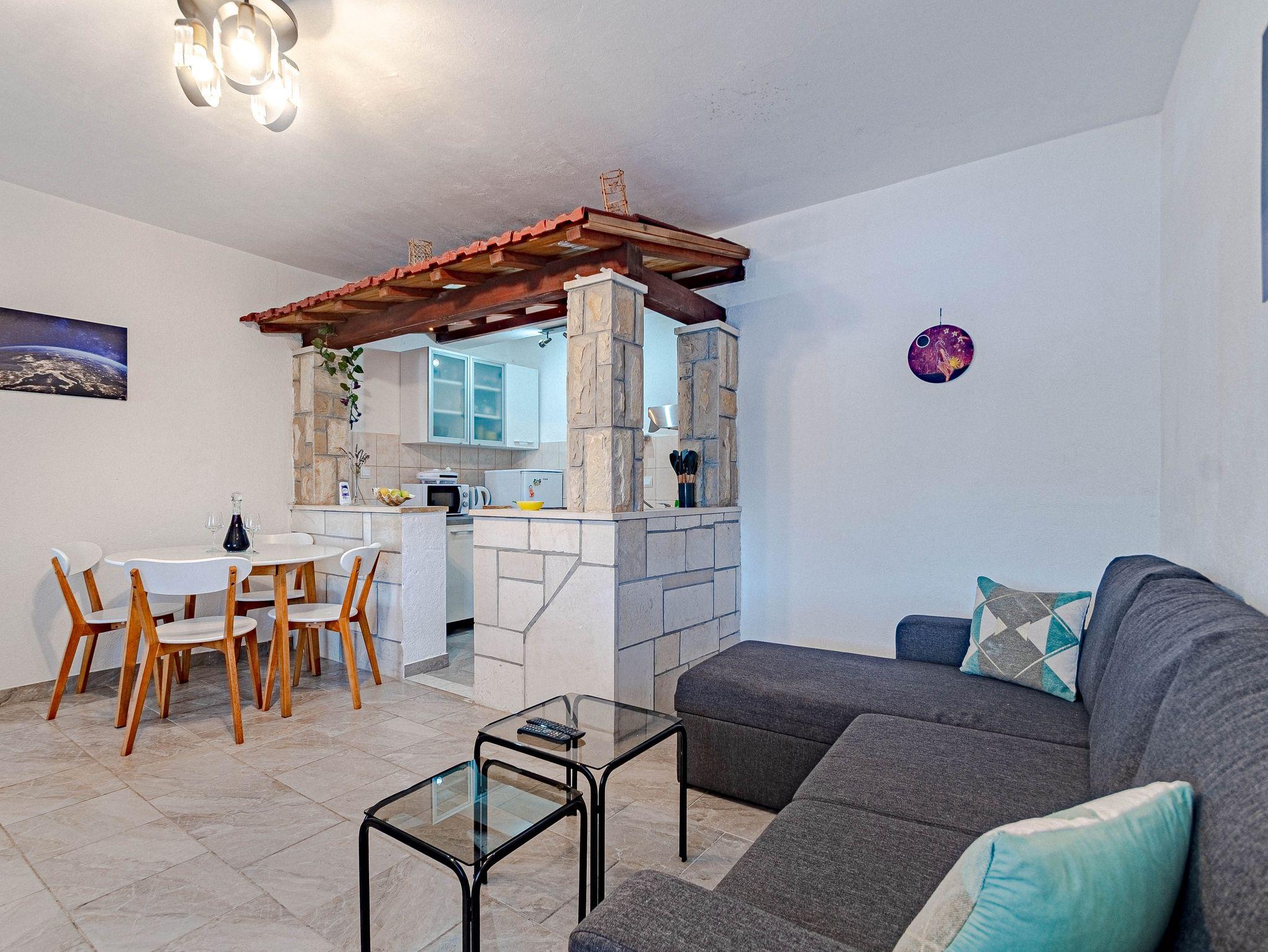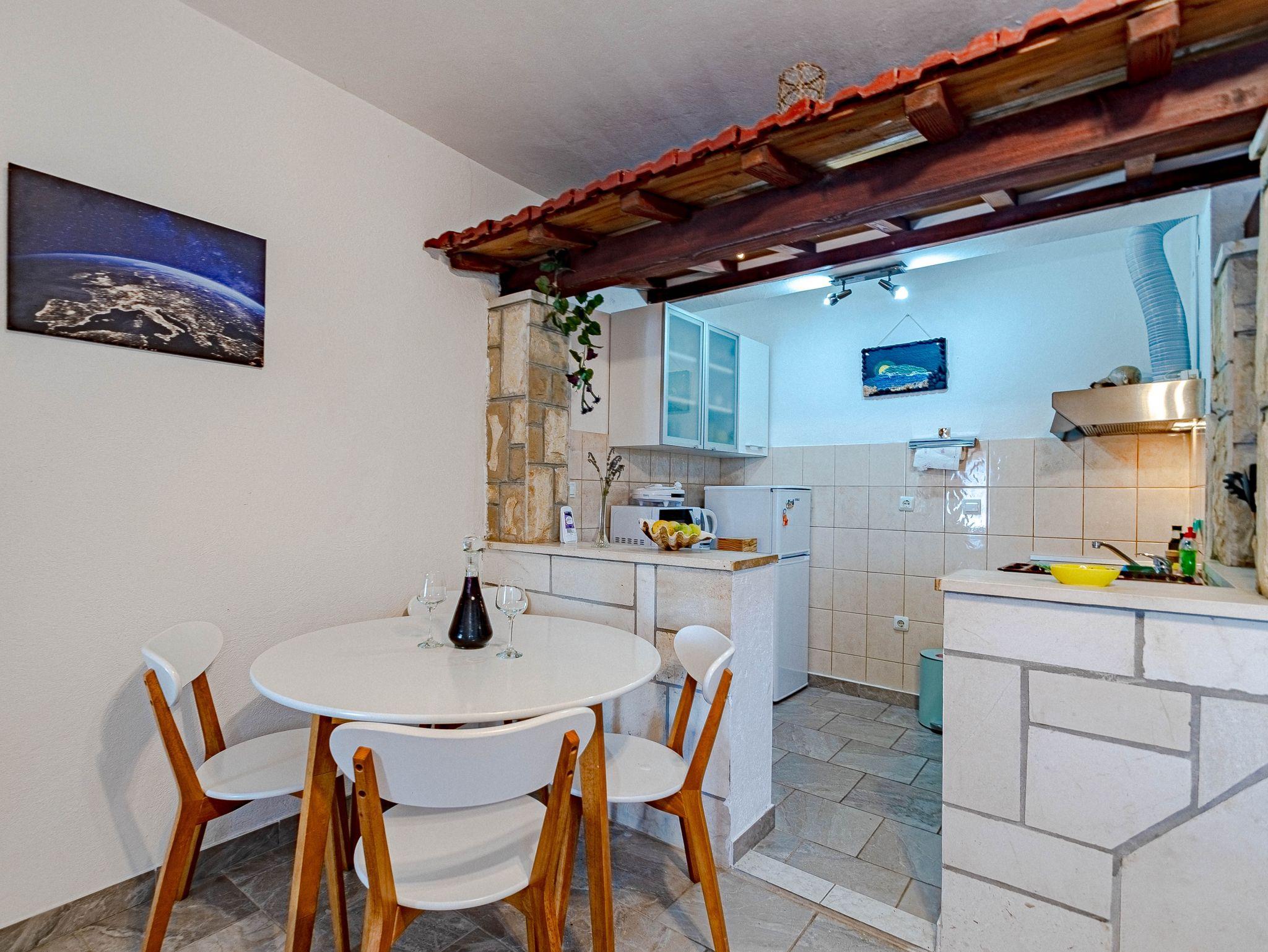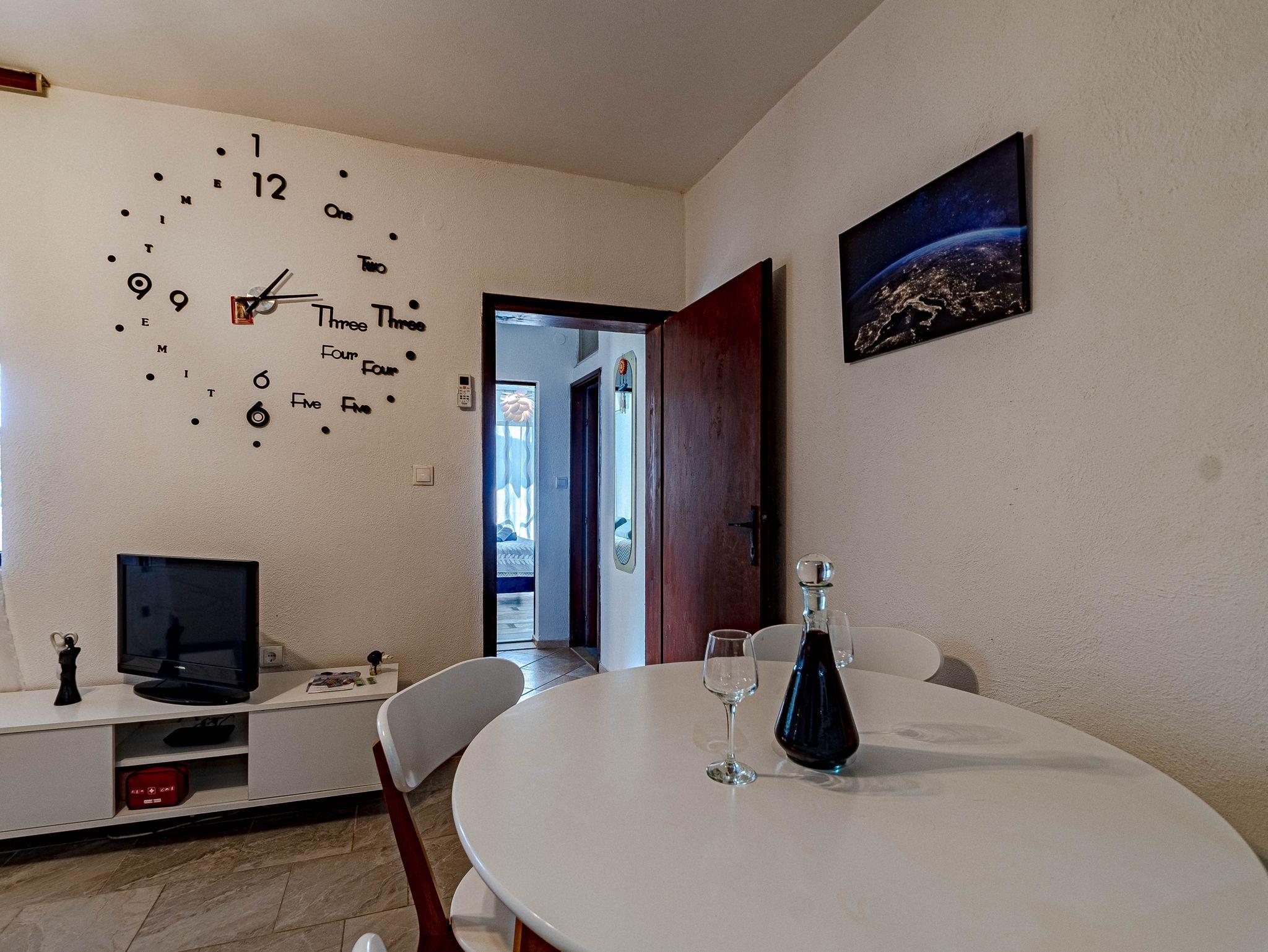 Ferienwohnung bietet Platz für 2 Gäste. Die Betten sind in Schlafzimmern, die es 1 gibt, innerhalb einer Gesamtfläche von 50m2, angeordnet. Die Gäste haben eine eigene Terrasse zur Verfügung, auf der sie in warmen Sommernächten genießen können. Das Apartment bietet Meerblick. Es ist erlaubt, Speisen auf dem Gemeinschafts-Grill vorzubereiten. In der Unterkunftseinheit besteht die Möglichkeit des Mitbringens von Haustieren gegen Aufpreis. Räume der gebuchten Unterkunftseinheit werden nicht in eine Ganze verbunden. IM PREIS INBEGRIFFEN: Kurtaxe, Endreinigung, Klimatisierung, Parkplatz, Internet, Bootsanlegeplatz, Fahrrad, Zusatzbett, Bügeleisen, Bügelbrett, Föhn. VERBINDLICHE ZUSÄTZLICHE KOSTEN: Aufzahlung für Kurzaufenthalte (prozentualer Zuschlag pro Nächtigungsanzahl: 30% - 1, 20% - 2, 10% - 3). UNVERBINDLICHE ZUSÄTZLICHE KOSTEN: Frühstück (5,00 €, 50% Nachlass für Kinder zwischen 4 und 12 Jahren, Kinder bis 4 Jahre sind frei.), Haustiere (5,00 € pro Nacht). Die Verfügbarkeit zusätzlicher Dienstleistungen in Ihrem reservierten Termin und die Preise derselben (falls nicht aufgeführt) müssen im Voraus überprüft werden. Zusätzliche Dienstleistungen die in der Zahlungsaufforderung nicht aufgeführt sind werden direkt beim Vermieter bezahlt, angenommen der Gast nutzt auch diese.