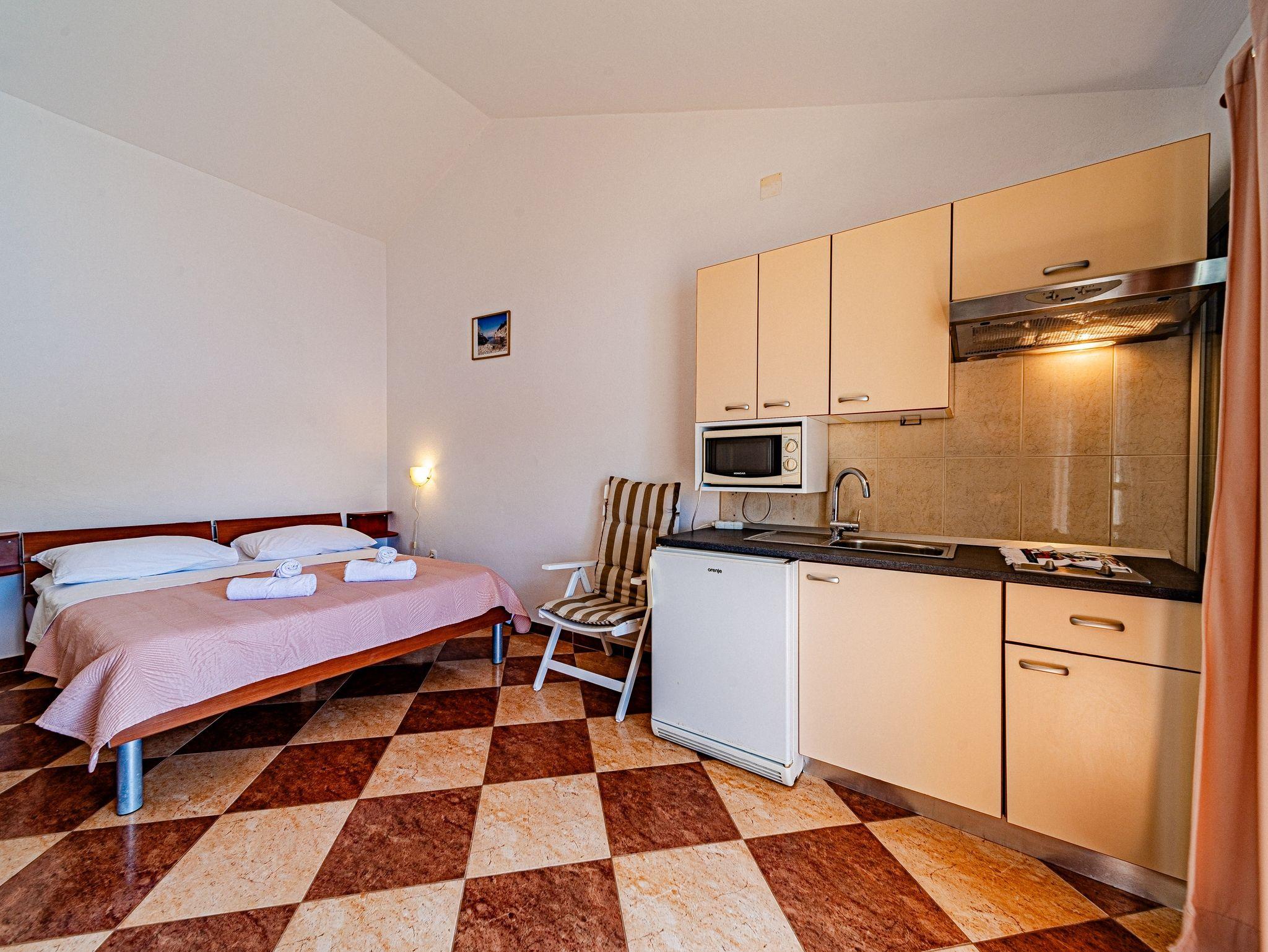 Studio bietet Platz für 2 Gäste. Die Betten sind in Schlafzimmern, die es 1 gibt, innerhalb einer Gesamtfläche von 23m2, angeordnet. Die Gäste haben einen eigenen Balkon zur Verfügung, auf der sie in warmen Sommernächten genießen können. Das Studio-Apartment bietet Meerblick. Es ist erlaubt, Speisen auf dem Gemeinschafts-Grill vorzubereiten. IM PREIS INBEGRIFFEN: Kurtaxe, Endreinigung, Klimatisierung, Parkplatz, Internet, Bootsanlegeplatz, Bügeleisen, Bügelbrett, Föhn, Liegestühle. UNVERBINDLICHE ZUSÄTZLICHE KOSTEN: Wäschewaschen (10,00 € Waschen). Die Verfügbarkeit zusätzlicher Dienstleistungen in Ihrem reservierten Termin und die Preise derselben (falls nicht aufgeführt) müssen im Voraus überprüft werden. Zusätzliche Dienstleistungen die in der Zahlungsaufforderung nicht aufgeführt sind werden direkt beim Vermieter bezahlt, angenommen der Gast nutzt auch diese.