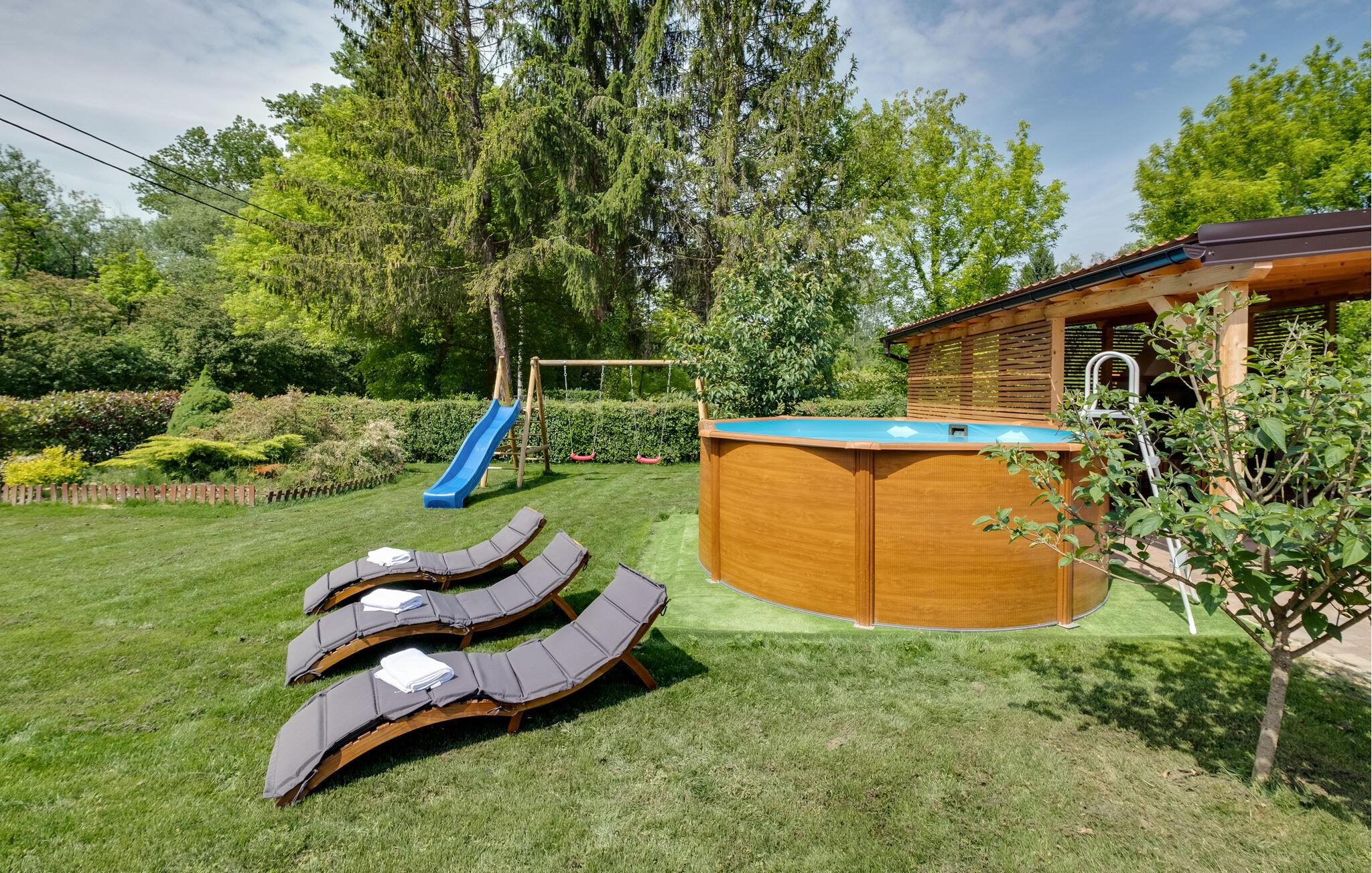 Denne ferie bliver ikke mindst husket for solskinstimerne på den dejlige grund, som ligger ned til floden. Her kan I nyde dagens små pauser og snuppe en frisk dukkert, når I trænger til det.