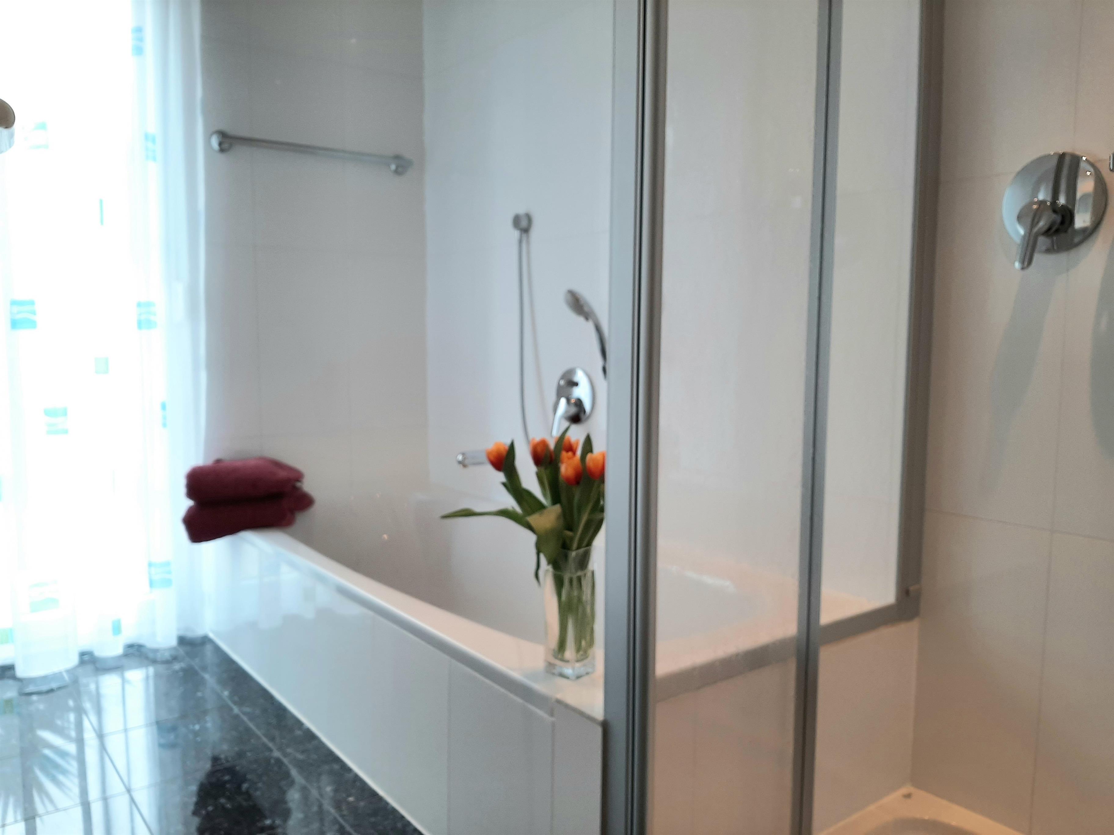Badeværelse med bruser og badekar