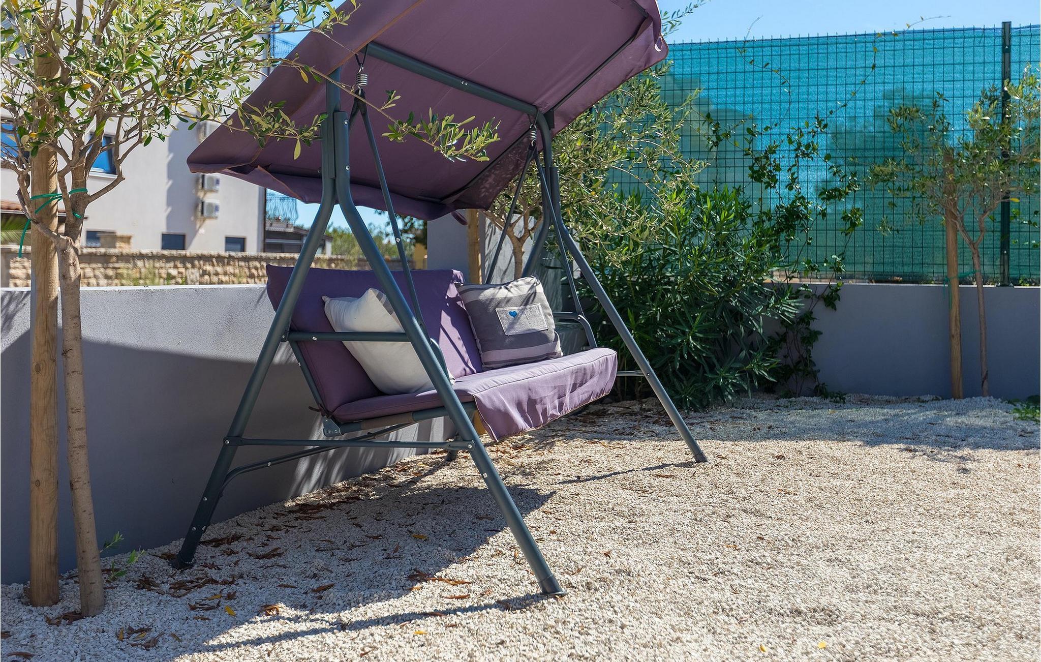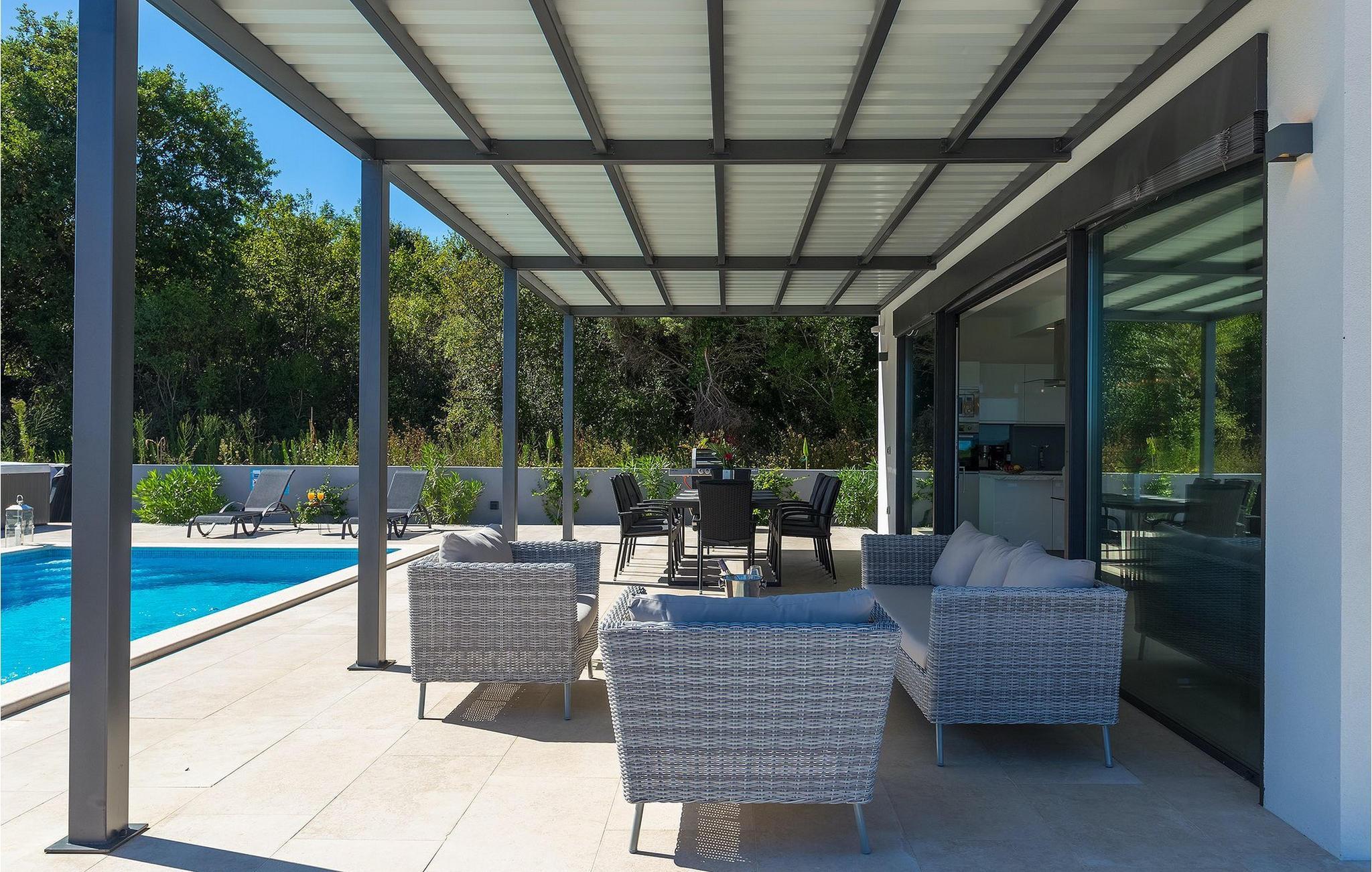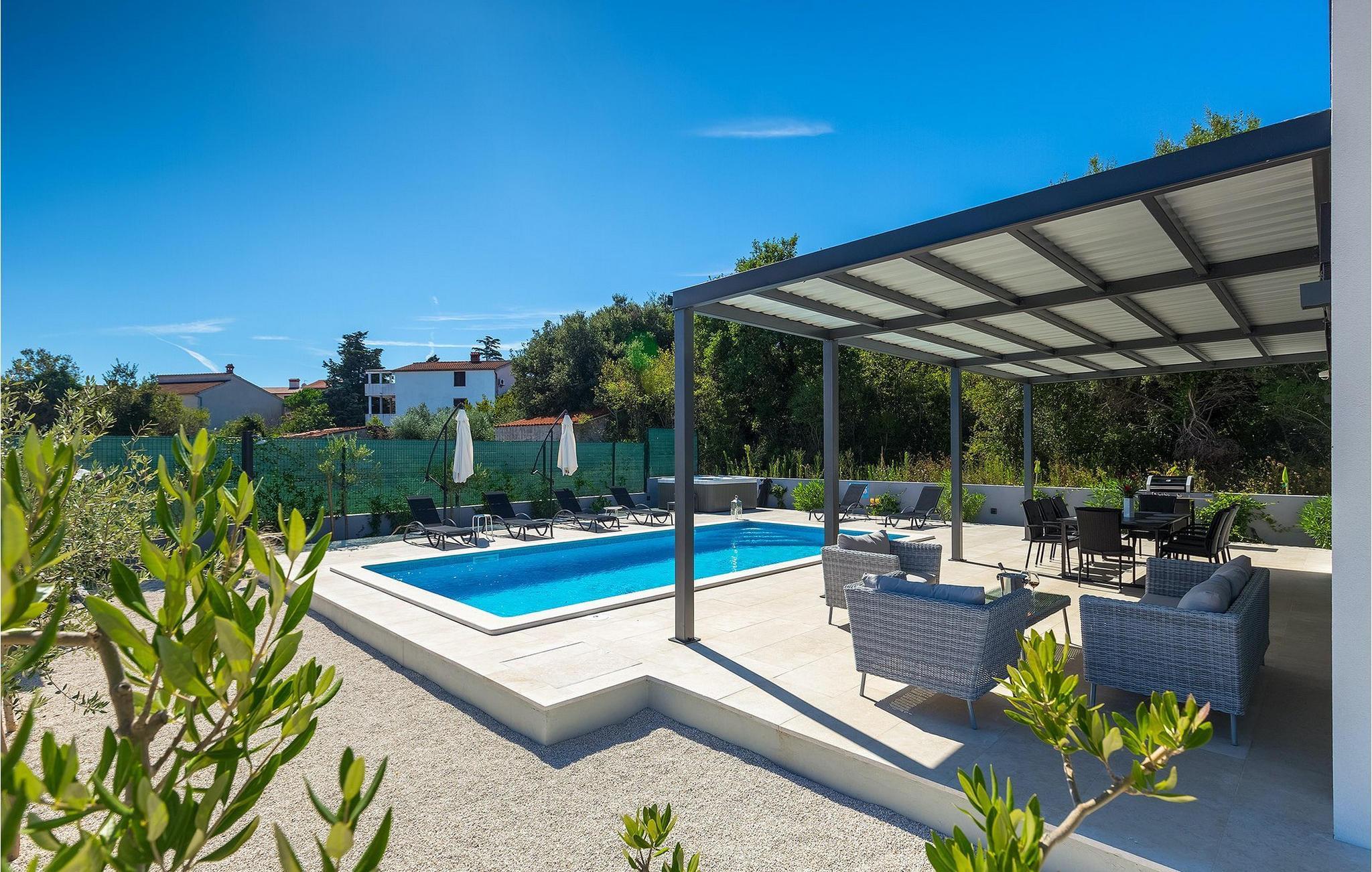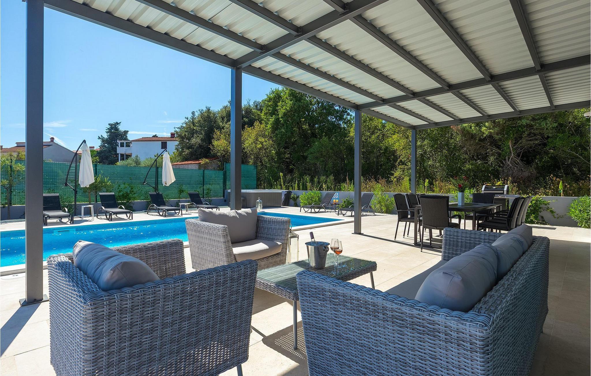 Et overdækket loungeområde ved siden af poolen er det perfekte sted at slappe af om aftenen, mens der også er en trampolin til rådighed for de yngste gæster.